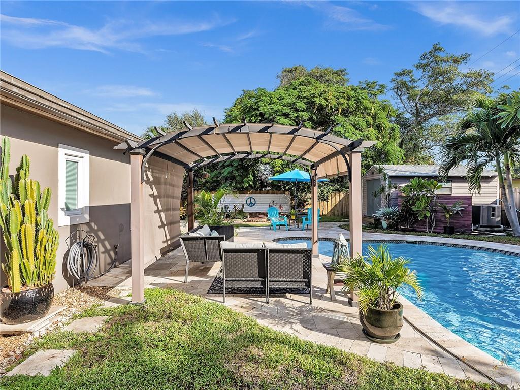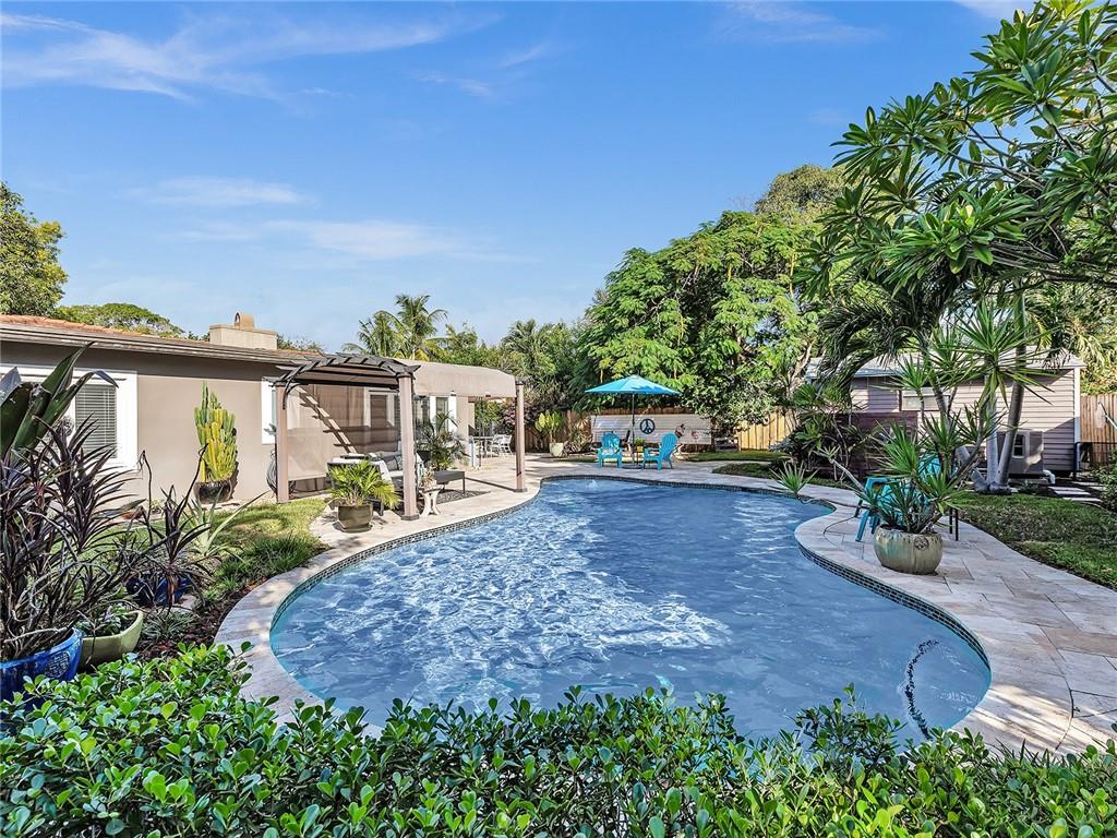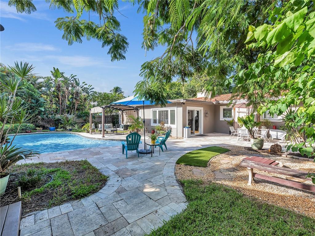 The best kept secret in charming Old Pompano! The large & lush mango tree out front welcomes you into this cozy, 3 bedroom 2 bathroom home. The working fireplace separates the living/dining kitchen area from the rear split-level den/family room. Wood floors and room for 6 at the granite kitchen counter. Stainless appliances. A true Master Suite and crown moldings throughout. Hurricane impact windows and slider. Two sheds in backyard, and 30 amp plug available outside. Land on south side can accomodate 23' boat storage. Walk to the five star high school! Custom pool, fire pit, cabana, Security lights & cameras. Perfect for staycations, or to host your family for the holidays! What are you waiting for?