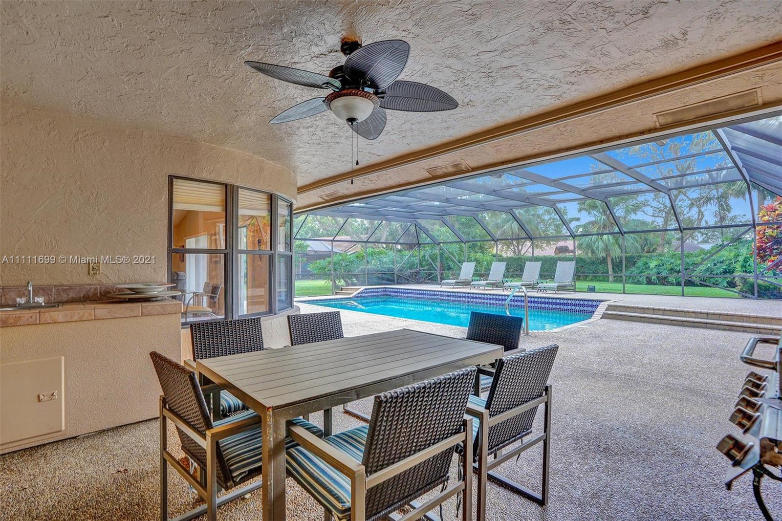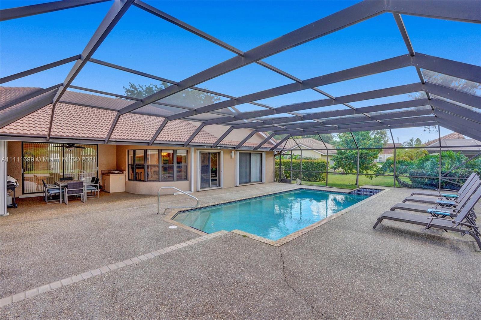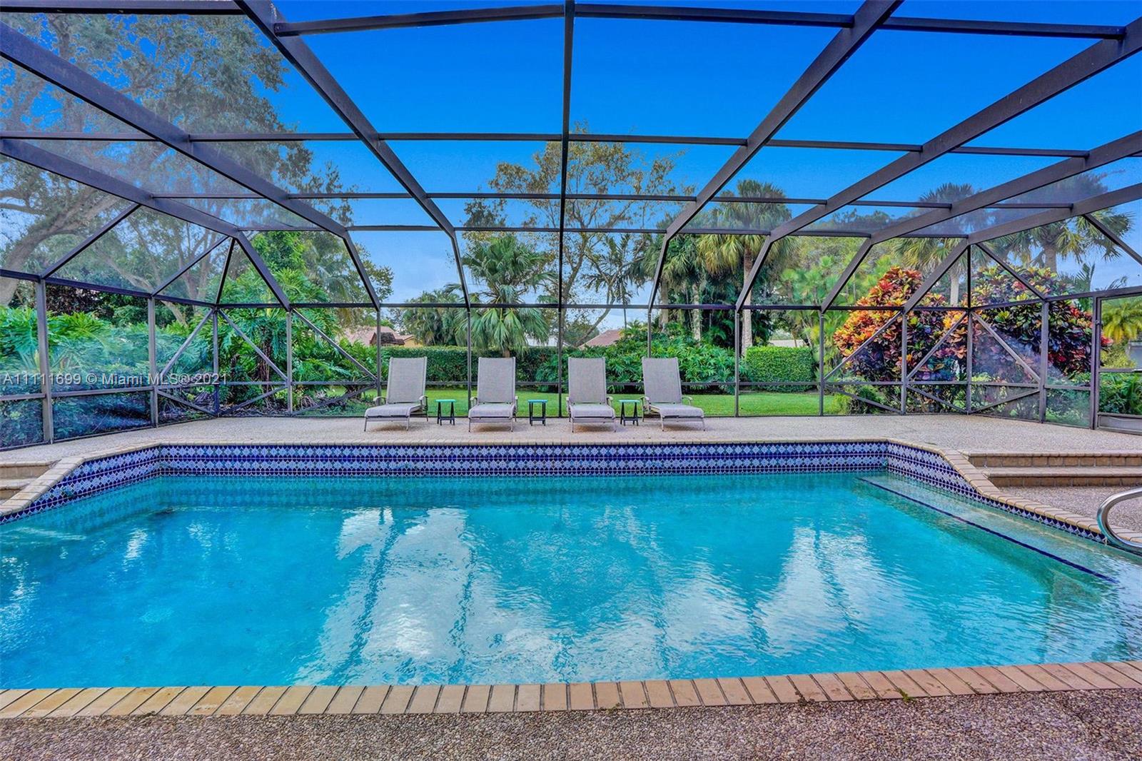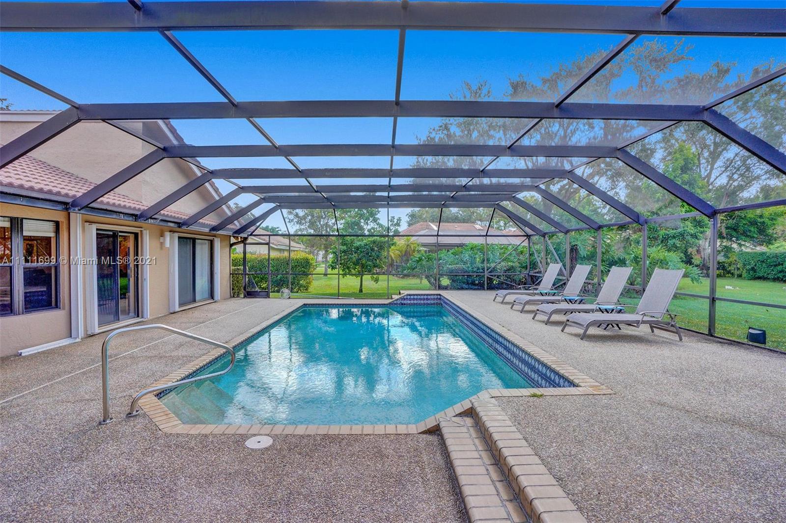 Welcome home to this gem situated on an oversized lot in the desirable Pine Ridge! Featuring an expansive circular stamped concrete driveway, lush yard & landscaping, modern updated kitchen, high-end $12k appliance package, eat-in kitchen & Bar height seating, updated master bath with frameless glass shower & private oasis patio off the shower, new laminate flooring, recessed lighting throughout, home water purification system, Jack & Jill bath, central vacuum & much more! Have peace of mind during hurricane season with full accordion shutters & the convenience of a shutter-enclosed patio for storage during a storm. Enjoy hosting poolside in your spacious backyard with a beautiful large swimming pool, screen enclosure, wet bar, elevated pool deck & brand new pool pump! Do not miss this!