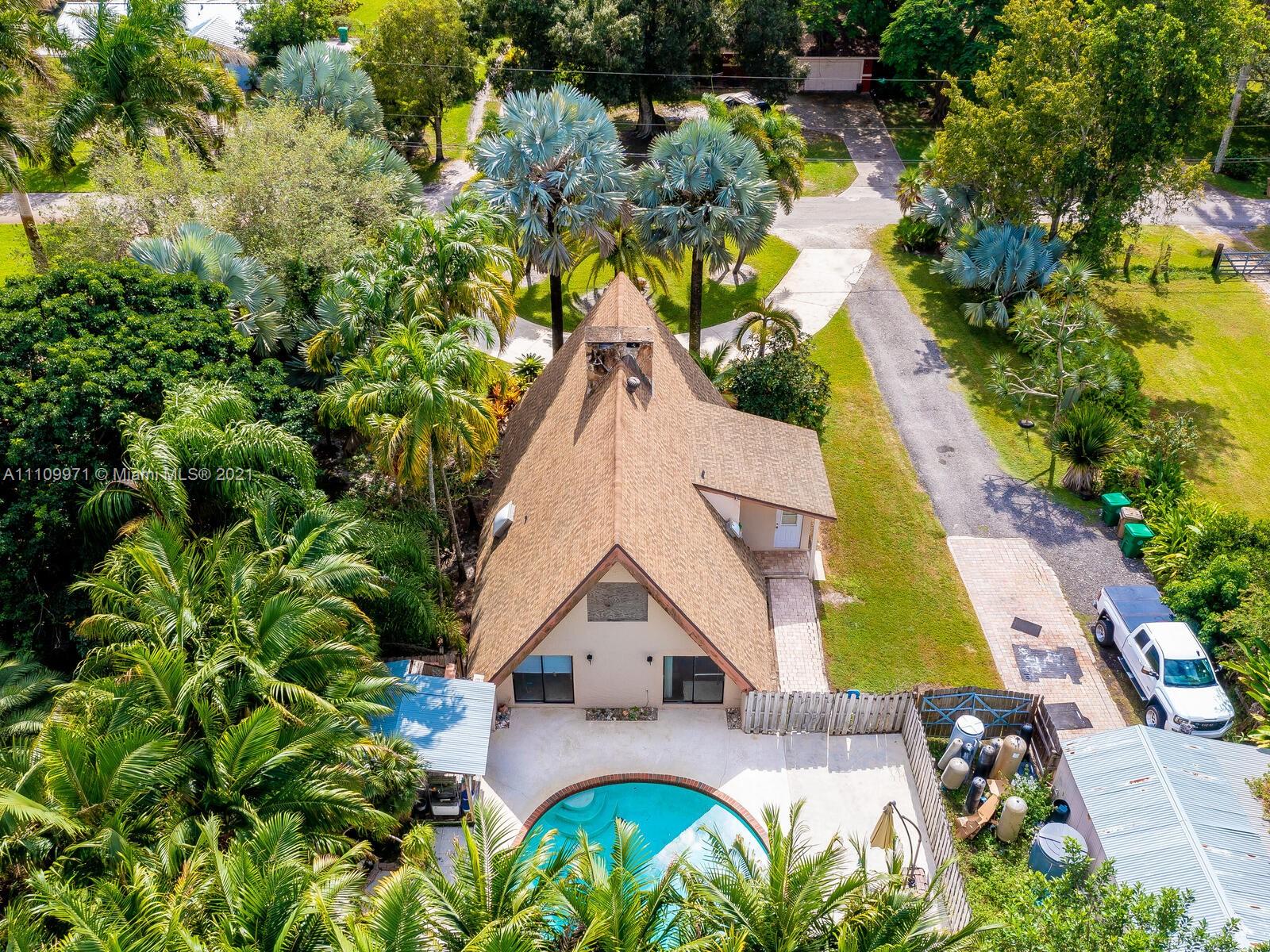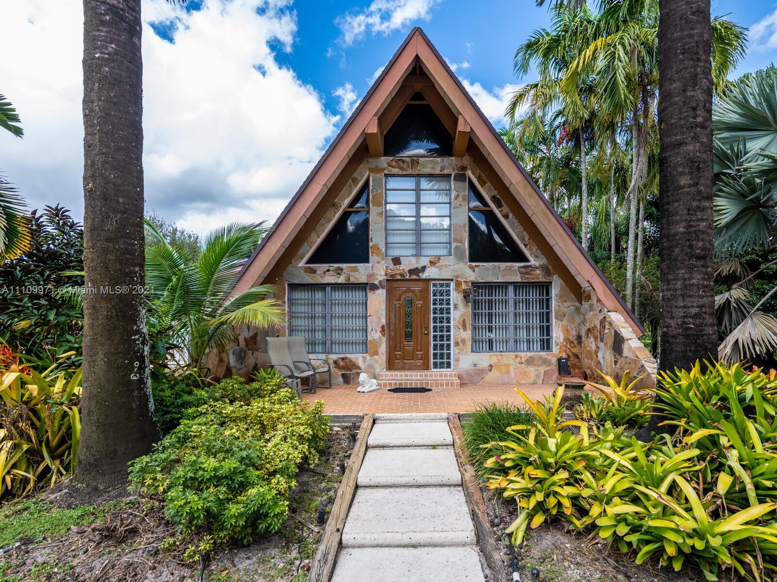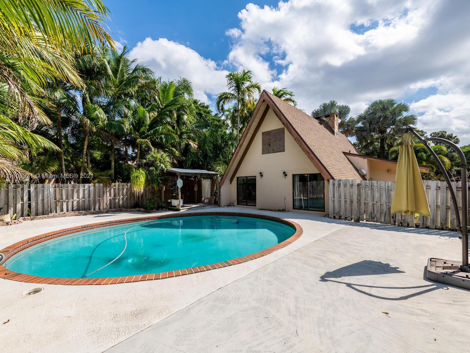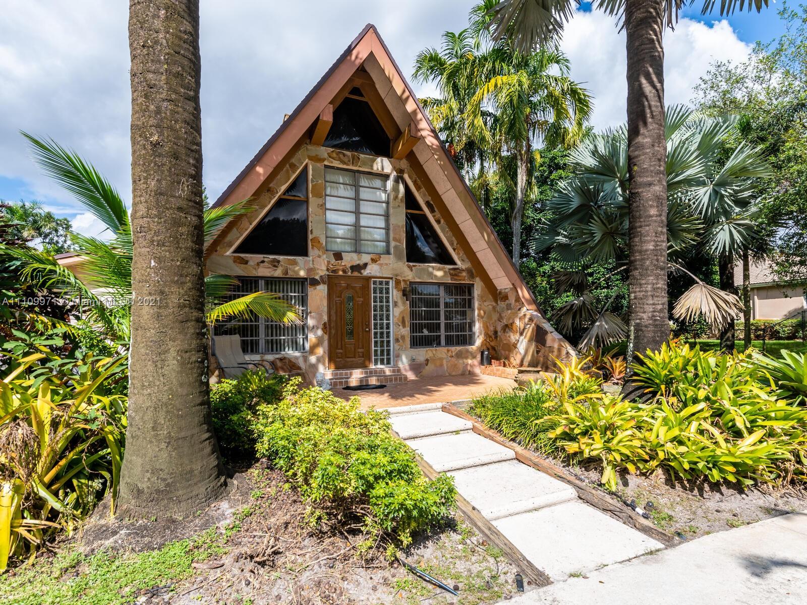 Unique A Frame 3 bedroom 2 bath pool home with guest house on just shy of an acre lot with front and rear access in a great Davie neighborhood. This home has loads of potential with great architectural angles, open kitchen, wood burning fireplace, two bedrooms downstairs that lead to the pool area, a spiral staircase to the master bedroom upstairs. Guest house in the rear of the property has a full kitchen, living space, bedroom / bath and office with private access from 23rd court. Property includes a shed with concrete floor. This property has many mature trees and plenty of room for ALL the toys!! (main house- roof 7-9 yrs., A/C 3 yrs., water heater 5 yrs. / Guest house- roof 15+ yrs., A/C 4-5 yrs., water heater 2yrs.)