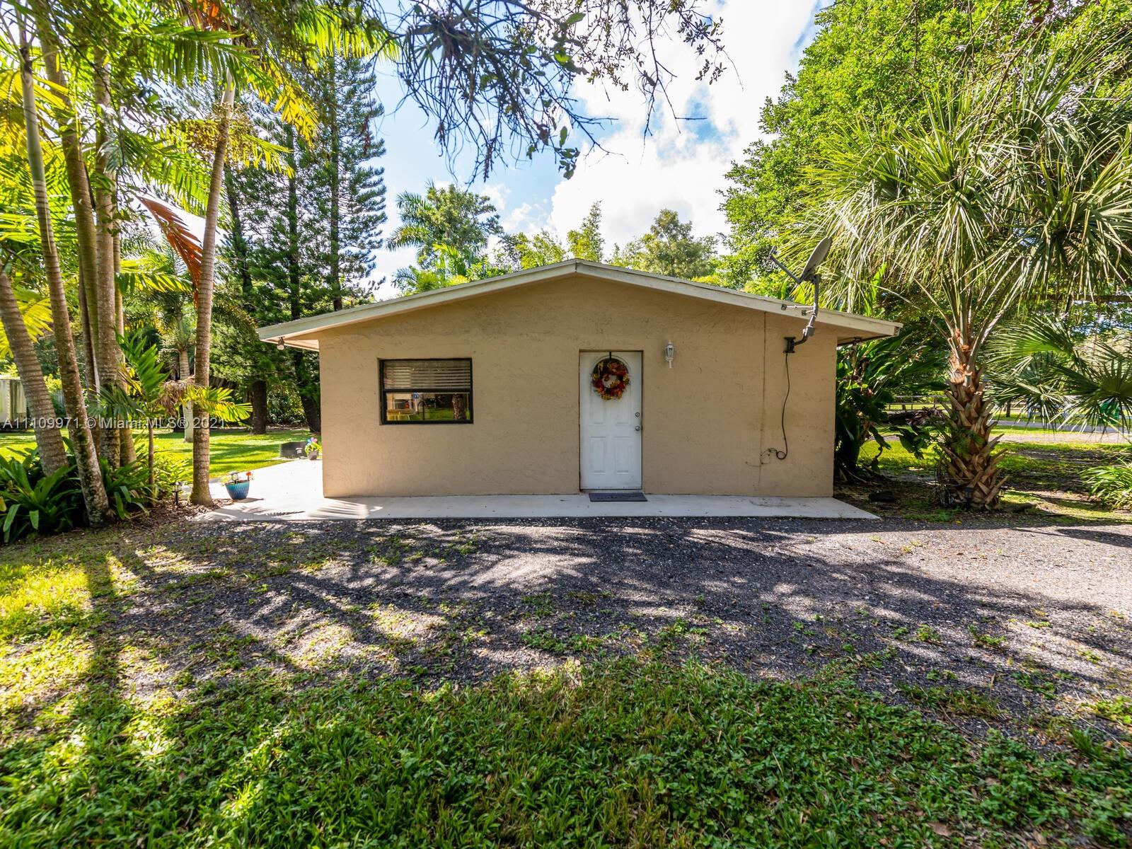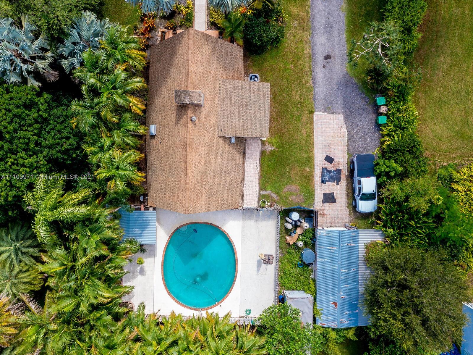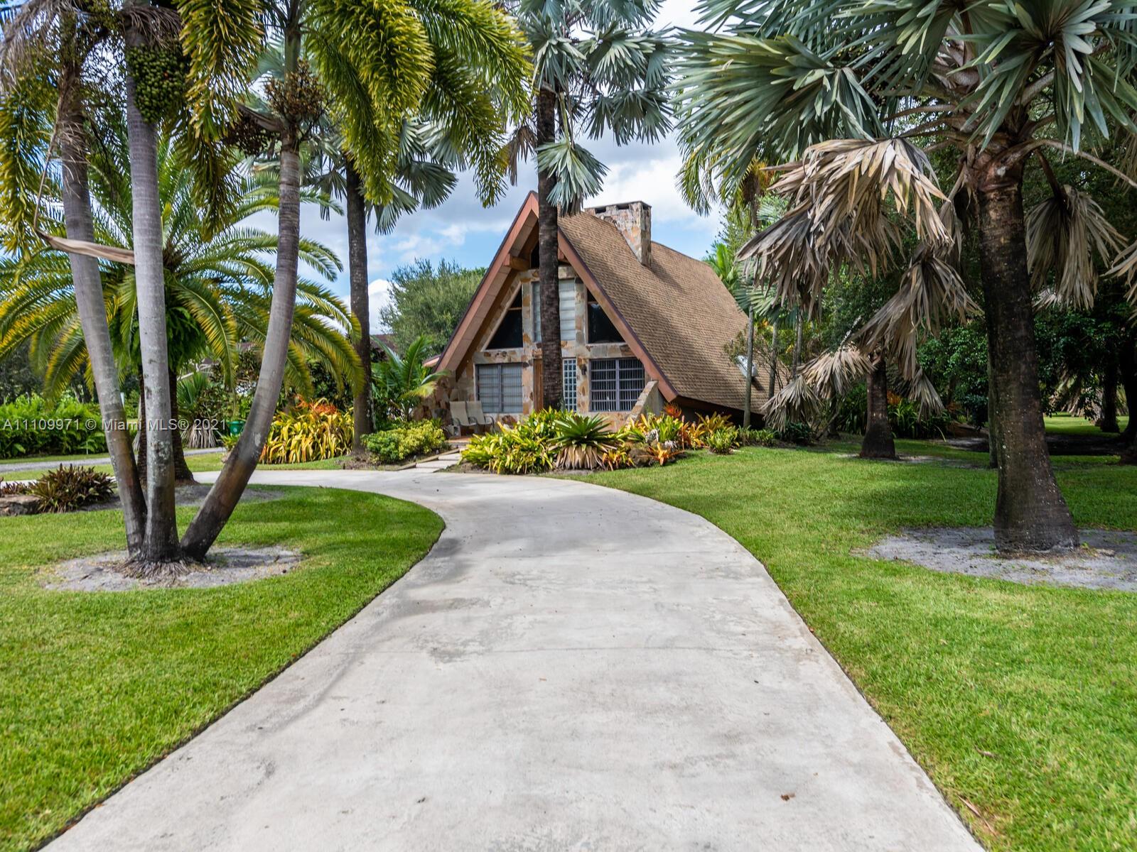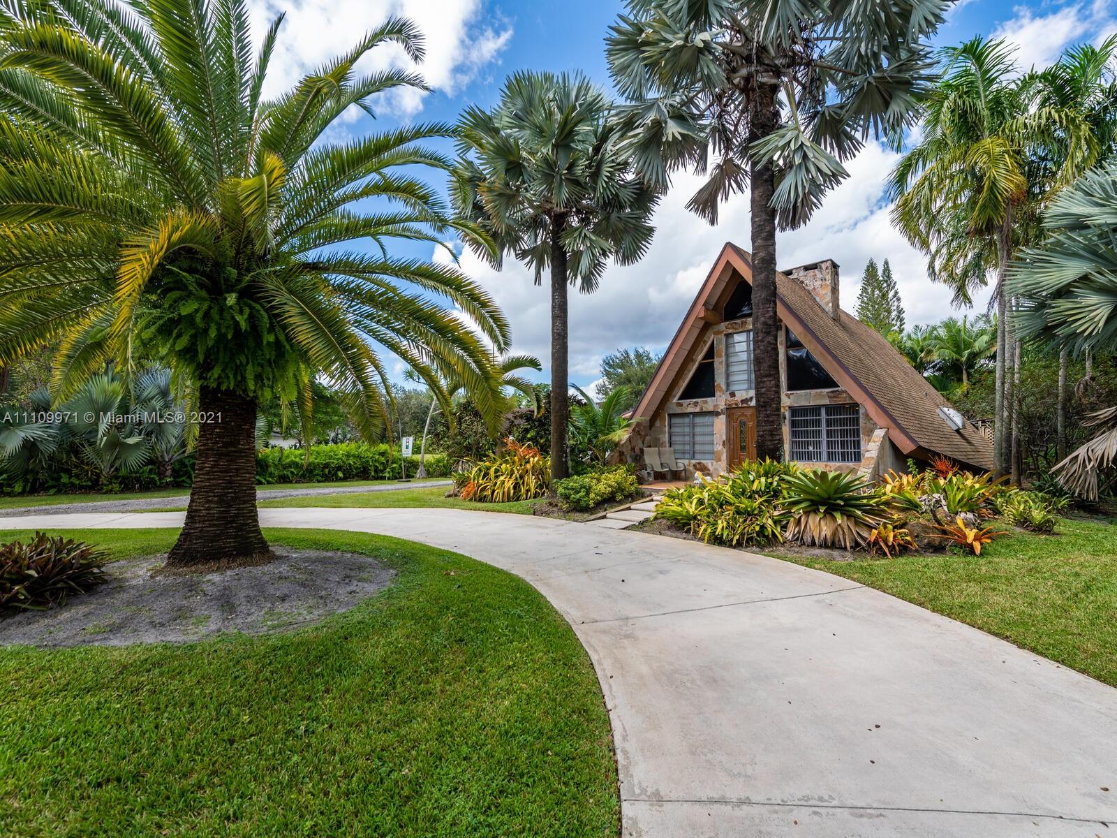 Unique A Frame 3 bedroom 2 bath pool home with guest house on just shy of an acre lot with front and rear access in a great Davie neighborhood. This home has loads of potential with great architectural angles, open kitchen, wood burning fireplace, two bedrooms downstairs that lead to the pool area, a spiral staircase to the master bedroom upstairs. Guest house in the rear of the property has a full kitchen, living space, bedroom / bath and office with private access from 23rd court. Property includes a shed with concrete floor. This property has many mature trees and plenty of room for ALL the toys!! (main house- roof 7-9 yrs., A/C 3 yrs., water heater 5 yrs. / Guest house- roof 15+ yrs., A/C 4-5 yrs., water heater 2yrs.)