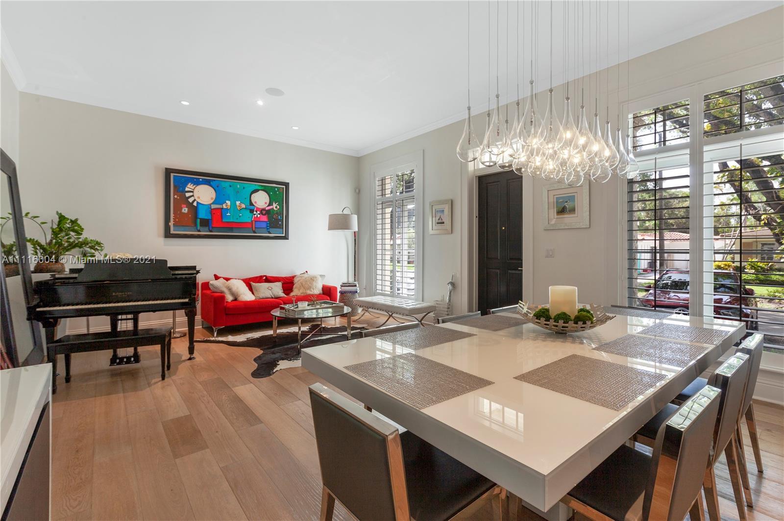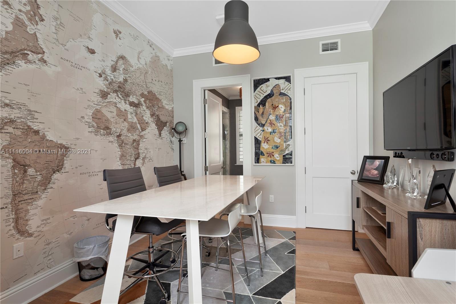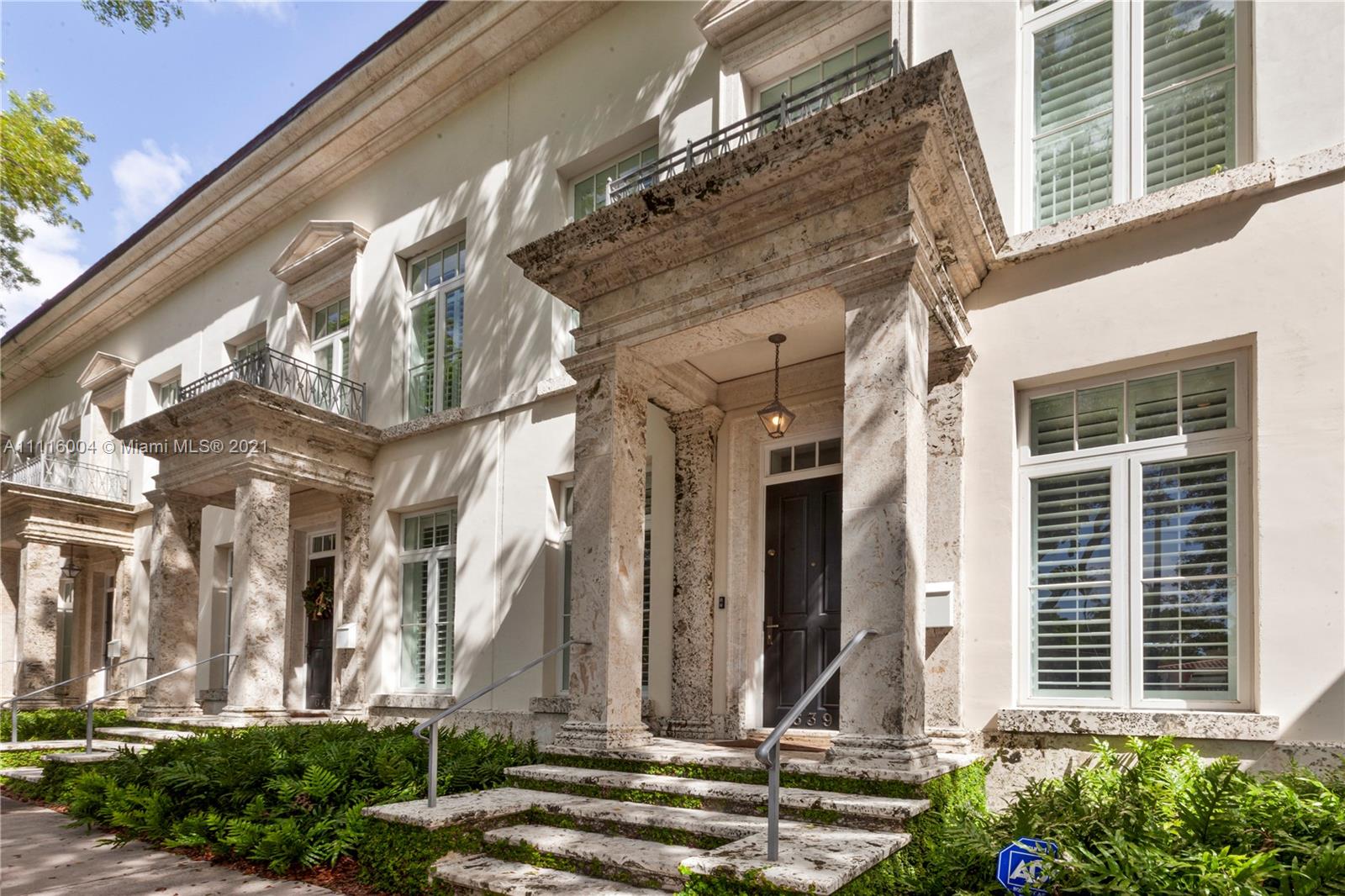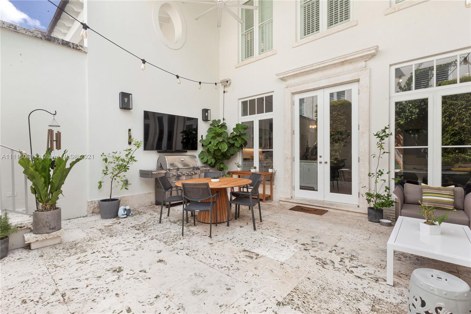 Almeria Row’s Phase II, No. 639, is graced with eleven and seventeen foot ceilings while the transom windows, marble + wood floors, wood shutters, 8-foot doors and skylight add to its allure. Almeria Row, a collective set of 10 row homes has garnered numerous architectural awards and has been featured in countless magazine articles. Offering a 2/2.5 main home + semi-detached 2/2 above the 2-car garage. The dreamy courtyard enjoys the sights and sounds of trickling water from the fountain and a roofed area ideal for al fresco dining. The home is storm-ready with its impact windows/doors and a whole-house generator that is connected to natural gas. This is a prime Gables location and very walkable to many restaurants, parks + cultural venues