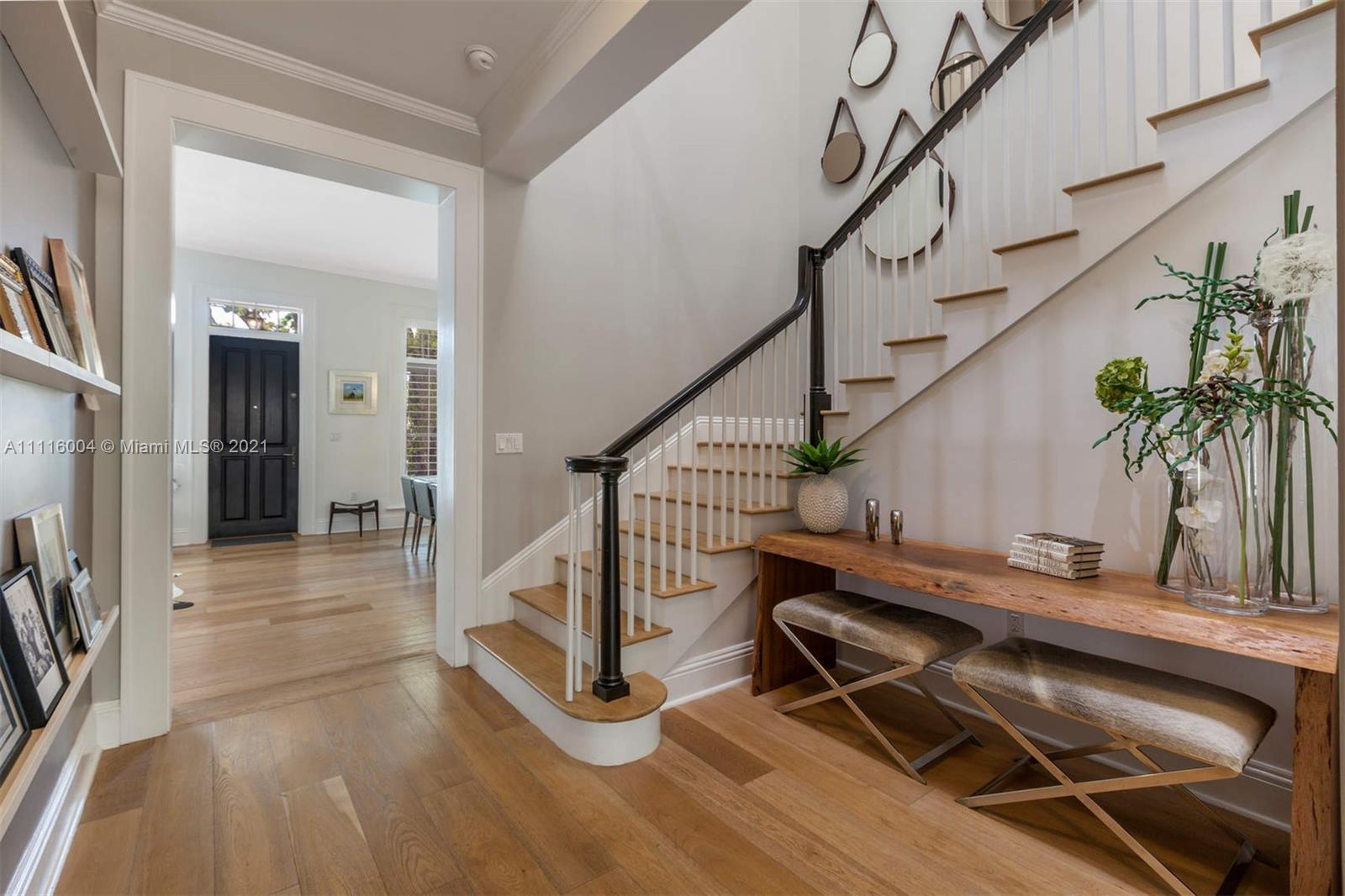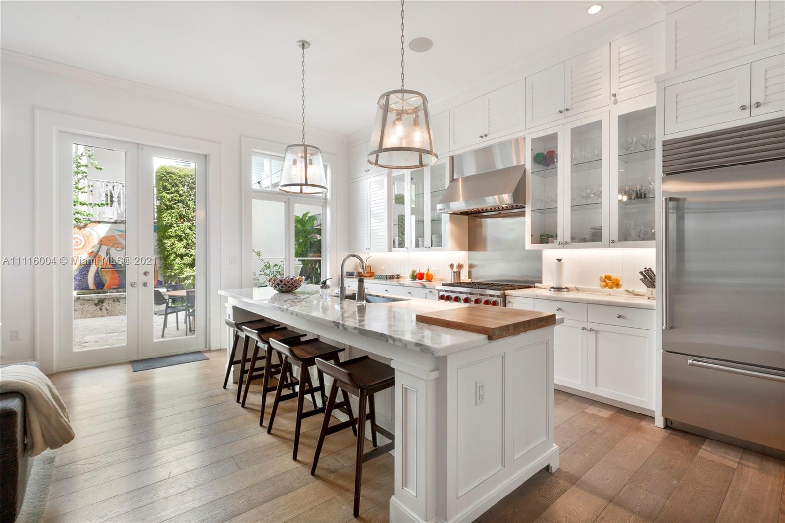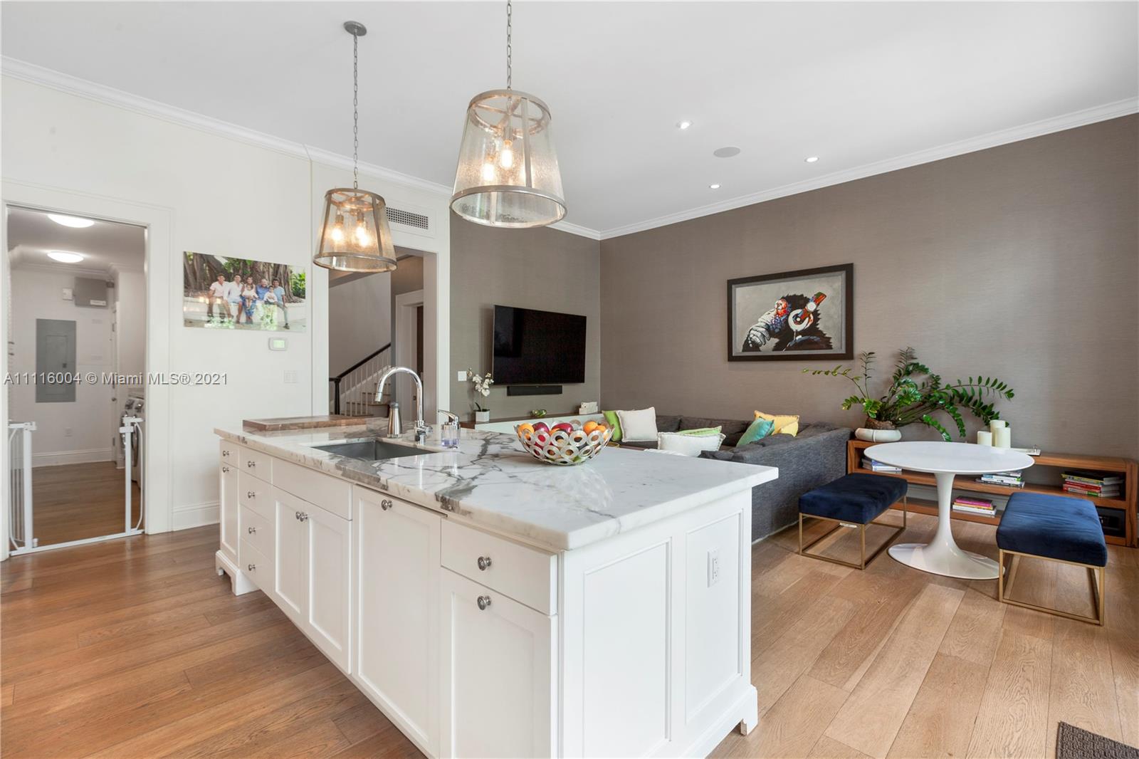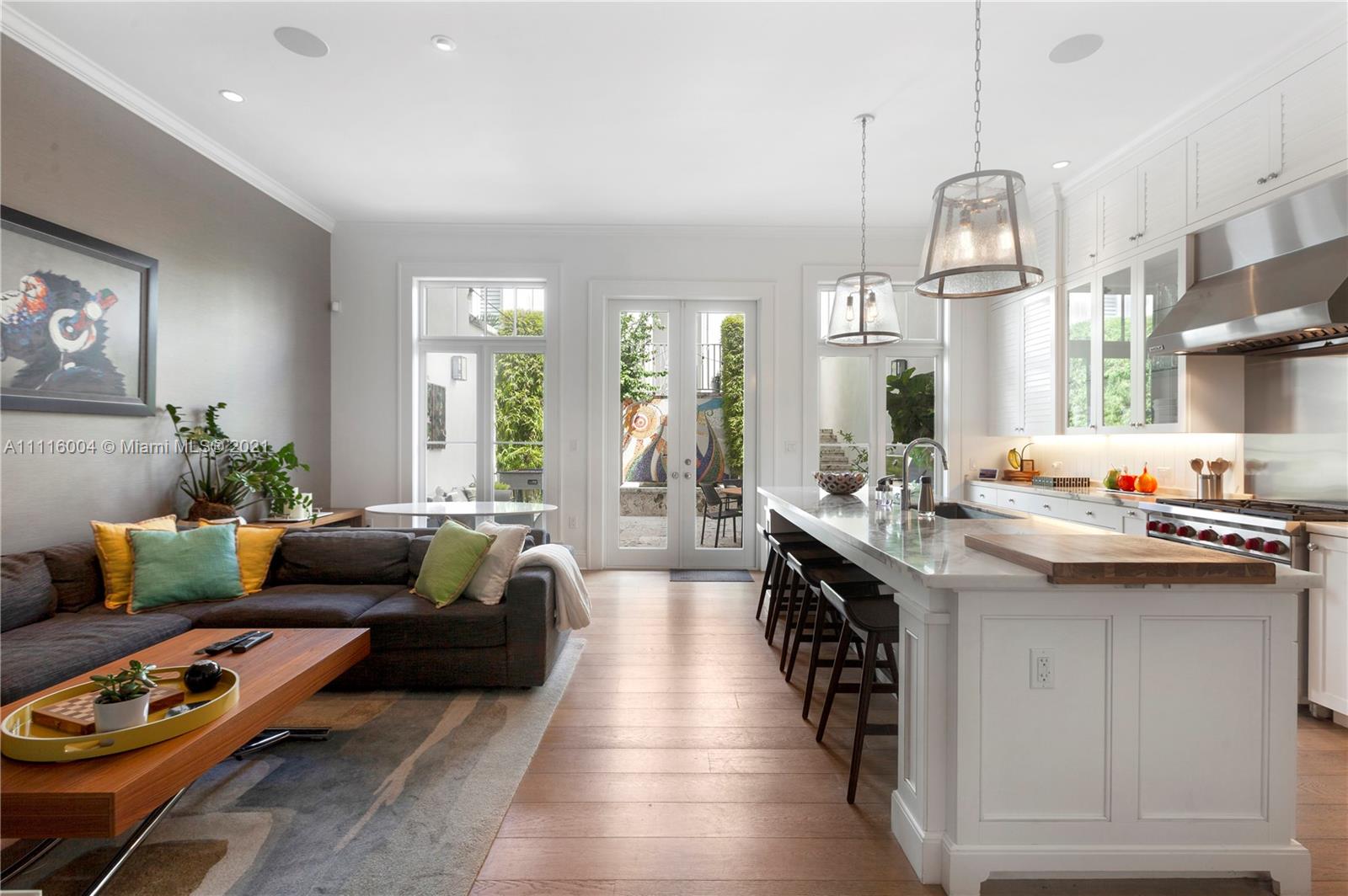 Almeria Row’s Phase II, No. 639, is graced with eleven and seventeen foot ceilings while the transom windows, marble + wood floors, wood shutters, 8-foot doors and skylight add to its allure. Almeria Row, a collective set of 10 row homes has garnered numerous architectural awards and has been featured in countless magazine articles. Offering a 2/2.5 main home + semi-detached 2/2 above the 2-car garage. The dreamy courtyard enjoys the sights and sounds of trickling water from the fountain and a roofed area ideal for al fresco dining. The home is storm-ready with its impact windows/doors and a whole-house generator that is connected to natural gas. This is a prime Gables location and very walkable to many restaurants, parks + cultural venues