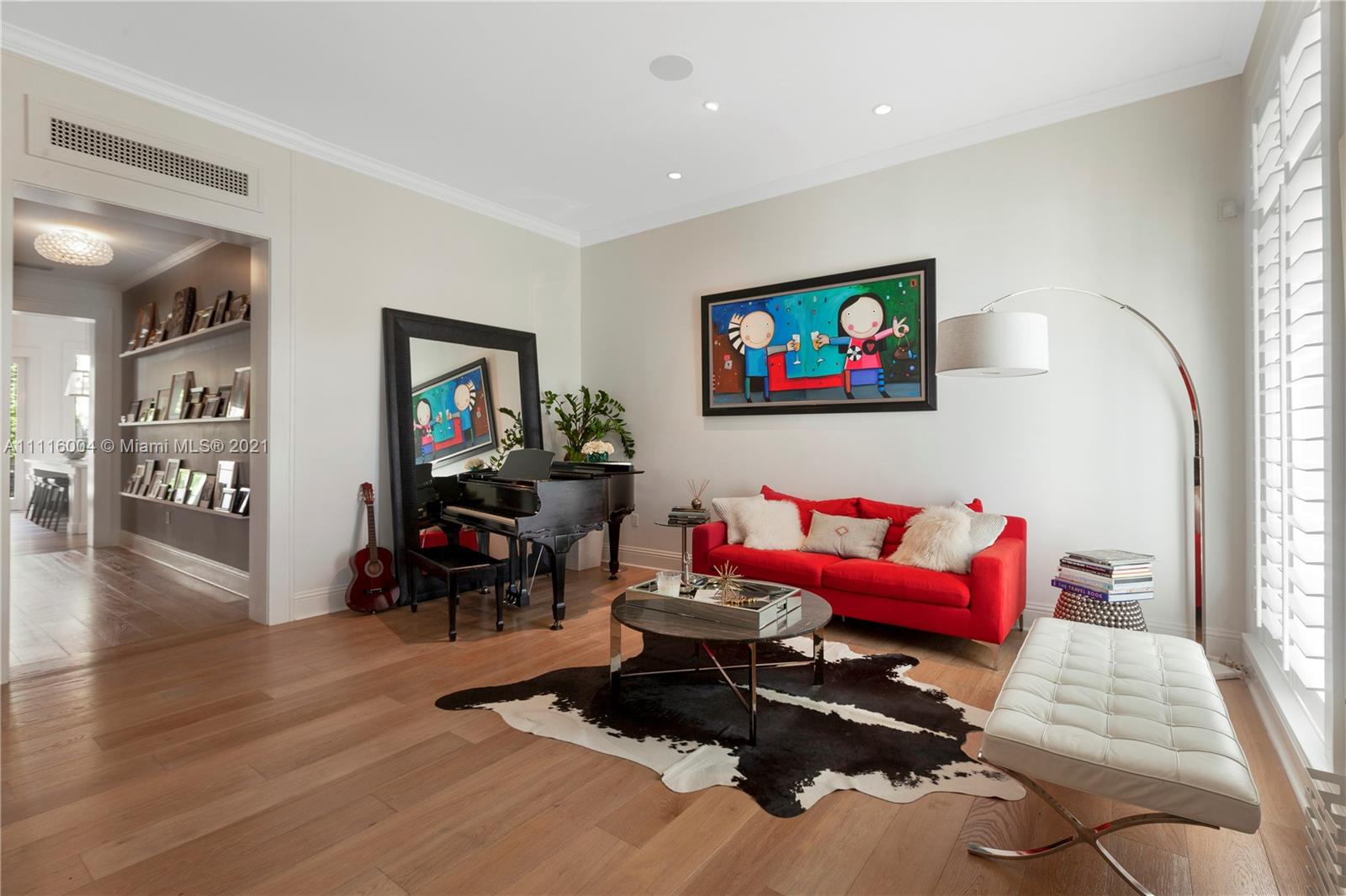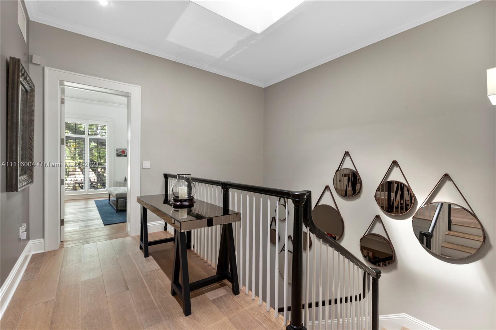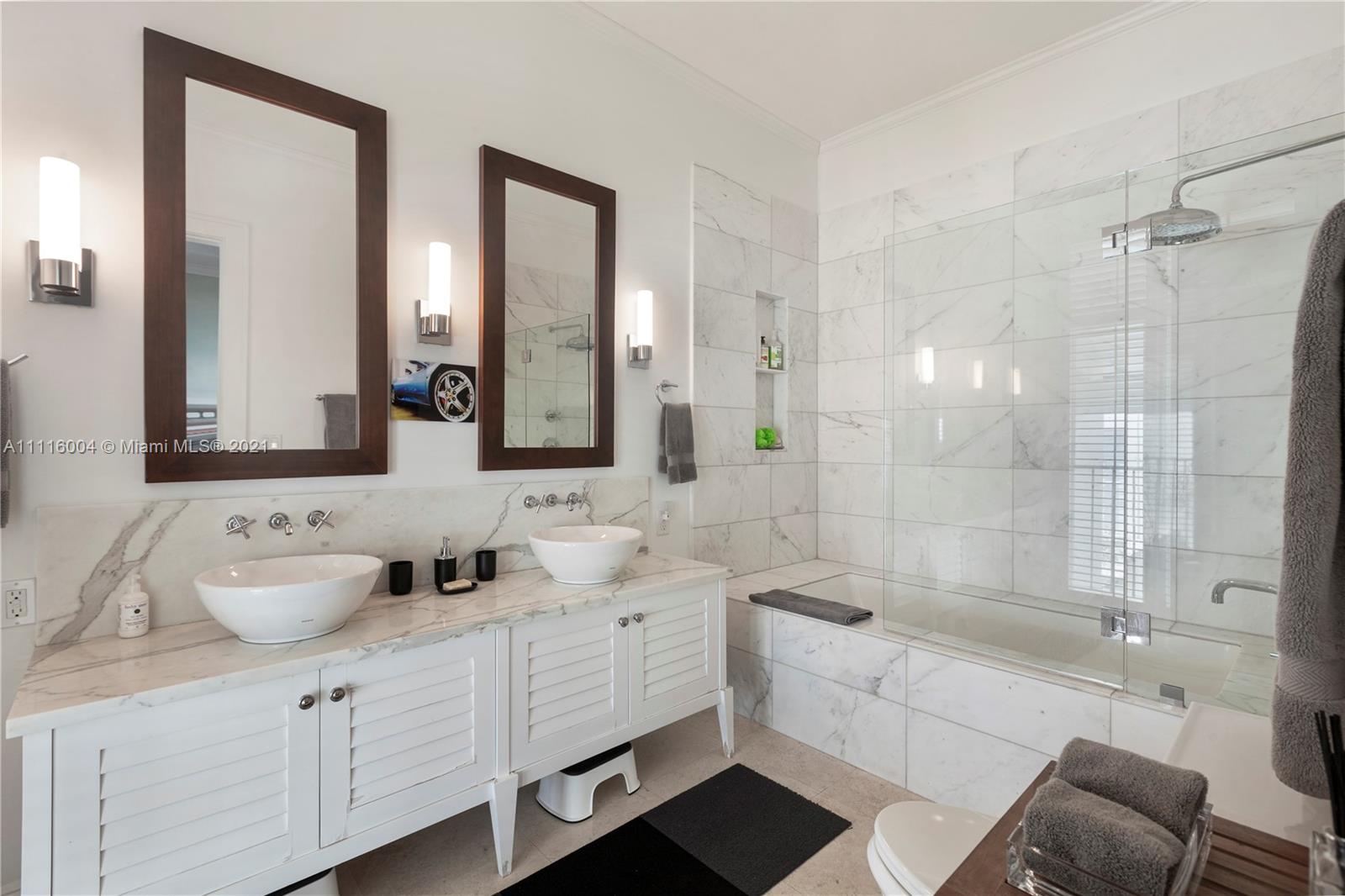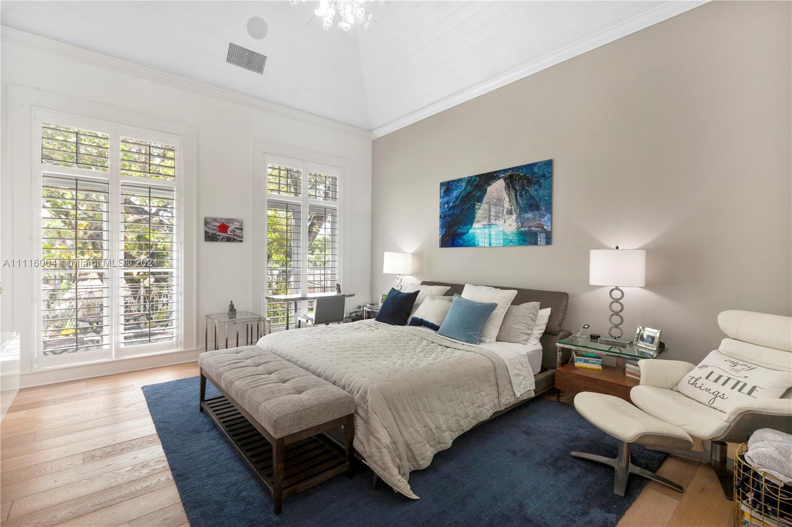 Almeria Row’s Phase II, No. 639, is graced with eleven and seventeen foot ceilings while the transom windows, marble + wood floors, wood shutters, 8-foot doors and skylight add to its allure. Almeria Row, a collective set of 10 row homes has garnered numerous architectural awards and has been featured in countless magazine articles. Offering a 2/2.5 main home + semi-detached 2/2 above the 2-car garage. The dreamy courtyard enjoys the sights and sounds of trickling water from the fountain and a roofed area ideal for al fresco dining. The home is storm-ready with its impact windows/doors and a whole-house generator that is connected to natural gas. This is a prime Gables location and very walkable to many restaurants, parks + cultural venues