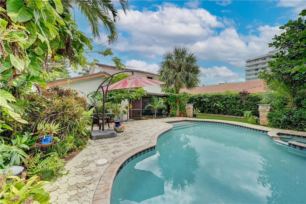 Breathtaking sunrises & Lauderdale Beach life in all its glory is only two blocks away! This 3 bed /3 bath home features a beautiful private hedged in front yard and Chicago brick driveway. Could convert to 4 or 5 Bedrooms easily... Front foyer entry leads to the formal living room and open staircase. 1 downstairs Bedroom. The kitchen remodel includes newer tile floors, fixtures, wood cabinets, granite counter tops, decorative back splash, stainless steel appliances.. Open-concept style kitchen overlooks the family room & dining with access to a large screened-in porch with Mexican tile floor. Completely fenced-in yard includes a private pool with built-in Jacuzzi & lush tropical landscaping. Additional features include hardwood & Tile floors, and a 1 car garage. Good daily rental too.