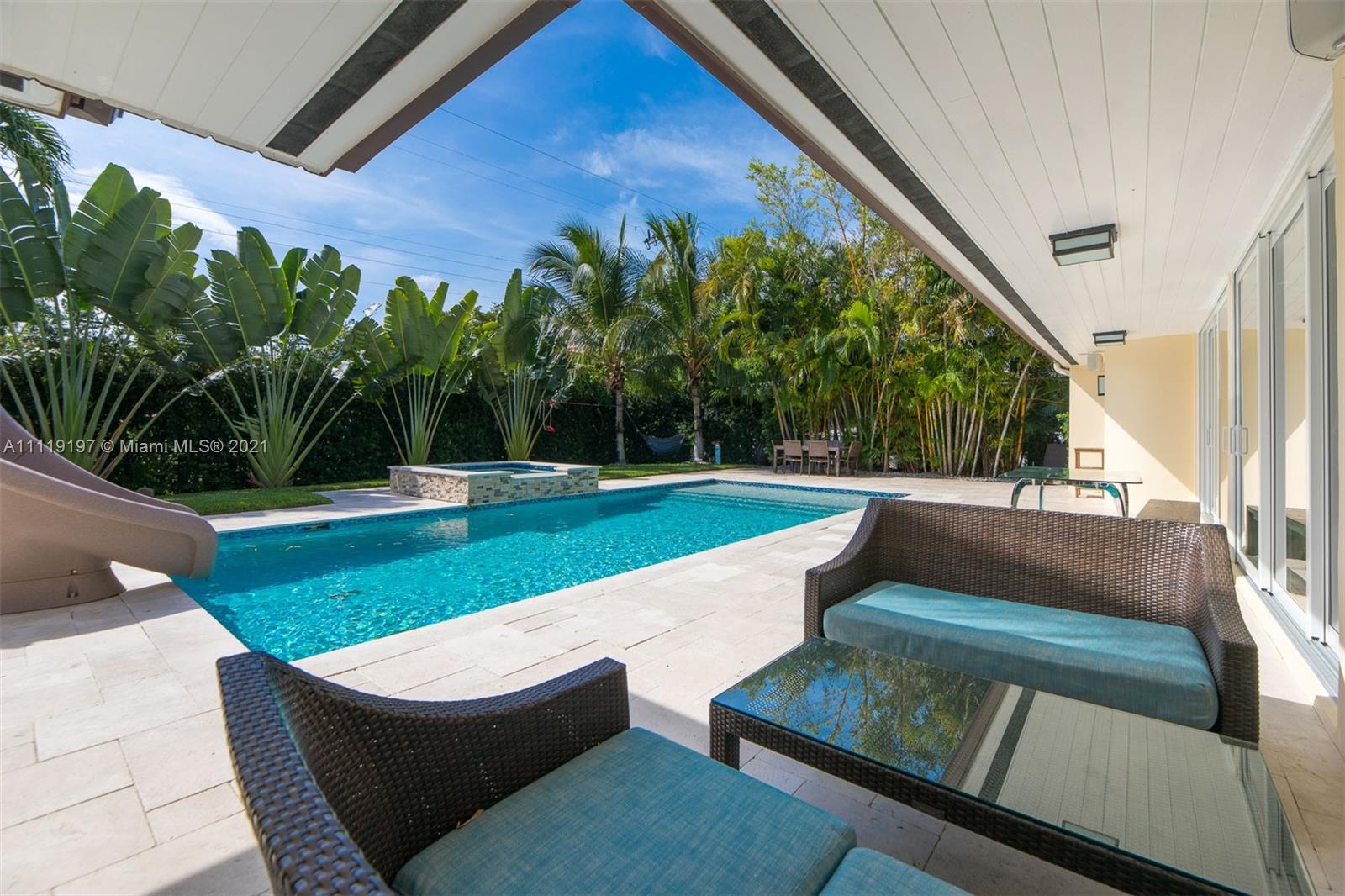 Live in one of the most sought after neighborhoods in the South Gables. Beautifully updated home with 4 bedrooms 3 full baths 1 den, superb Brazilian Teak wood floors, high impact windows, large sliding doors welcoming light, stunning kitchen with Viking/ Subzero stainless-steel appliances, new electric, new plumbing, security system and cameras, indoor and outdoor surround system, 12,000 sq/ft lot, and remodeled large heated salt water pool surrounded by beautiful landscaping. Amazing location in Coral Gables in a quiet, secluded and tree lined street one block away from Sunrise Park and short bike ride to Coconut Grove.