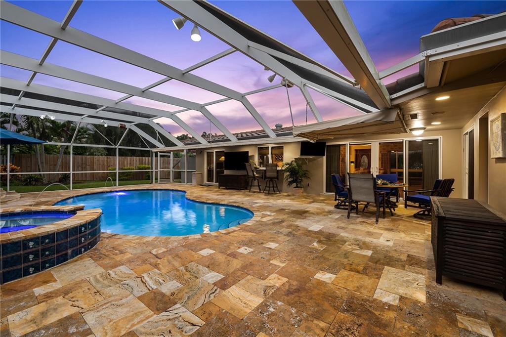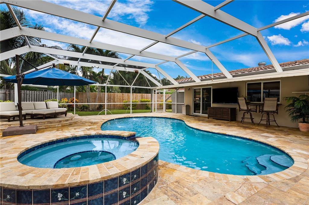Welcome to the highly desirable Imperial Point. This spectacular single story home boasts 3 bedrooms, 2 bathrooms, long Chicago brick driveway & 2 car garage. Meticulously landscaped with privacy gate and Koi pond at entrance: the curb appeal is like no other. Spacious family room and kitchen overlook sprawling, screened-in Travertine patio with heated salt water pool, spa, outdoor shower, and fenced-in yard. Galley kitchen with stainless steel appliances, wood cabinets, granite countertops, breakfast area. Built-in cabinet storage in laundry room & garage. Master suite has access to the pool from bedroom slider and bathroom cabana door. Roof 2009, AC 2010, impact windows & doors (front door with panels). Close proximity to Westminster Academy & Pine Crest Private Schools, shops & beaches!