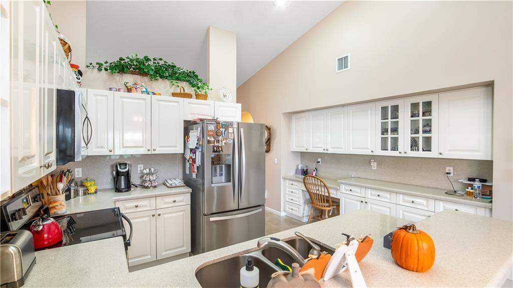 Stunning lake views greet you from every window as you enter this beautifully updated 4 bedroom 2.5 bath in much sought Nob Hill Palms neighborhood! Modern kitchen with white shaker cabinets and expansive quartz countertops!