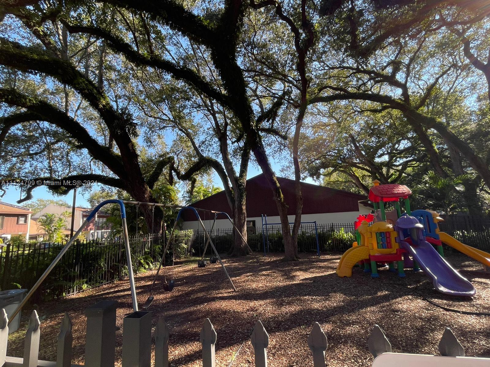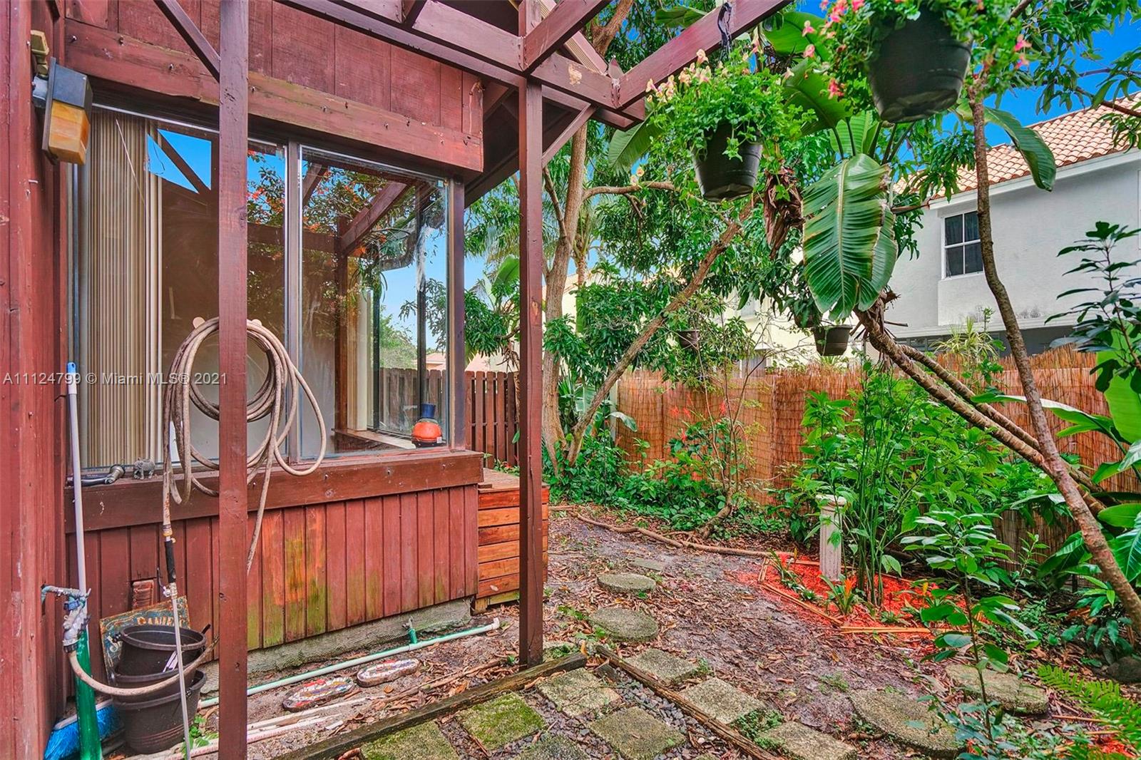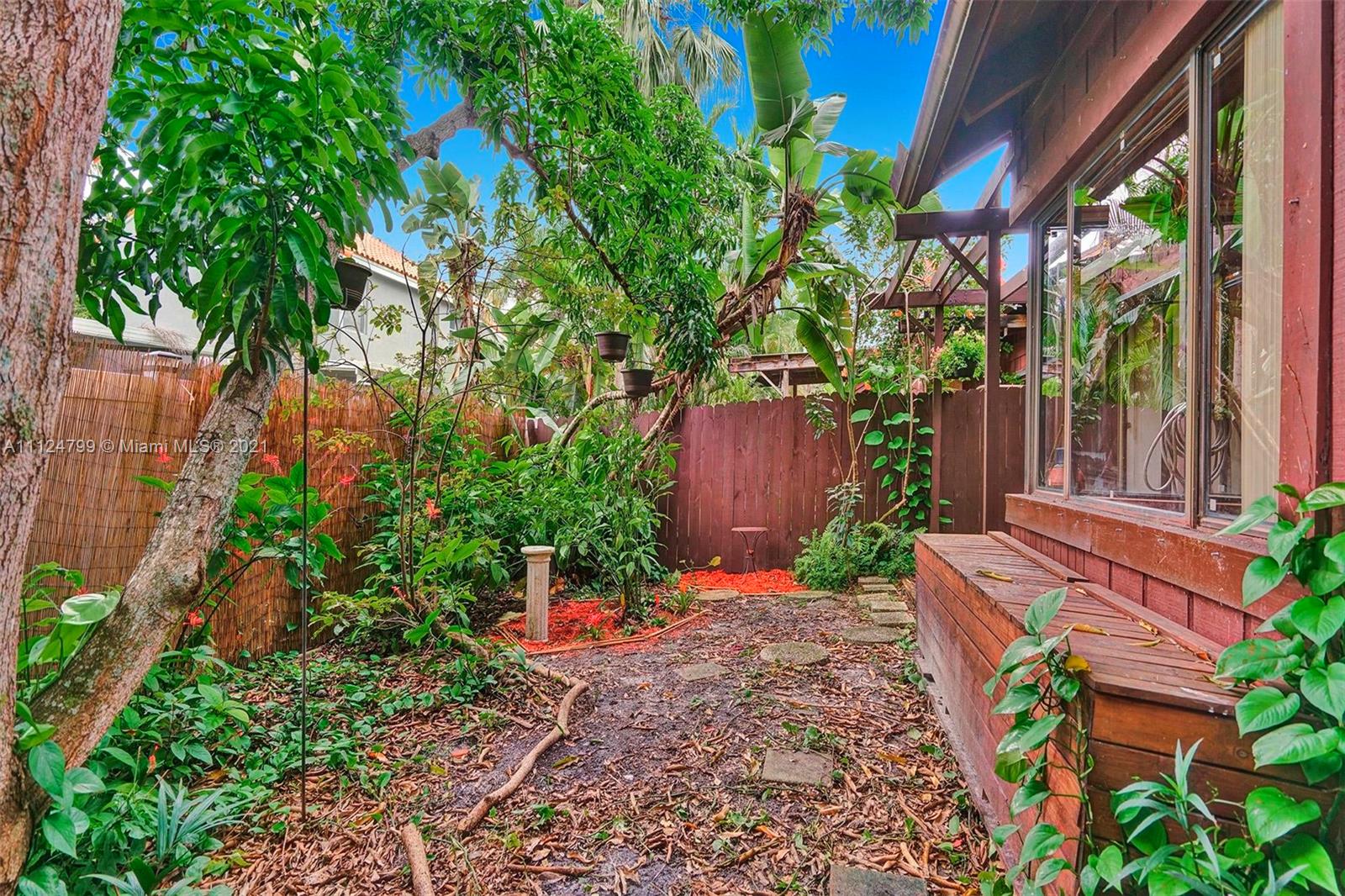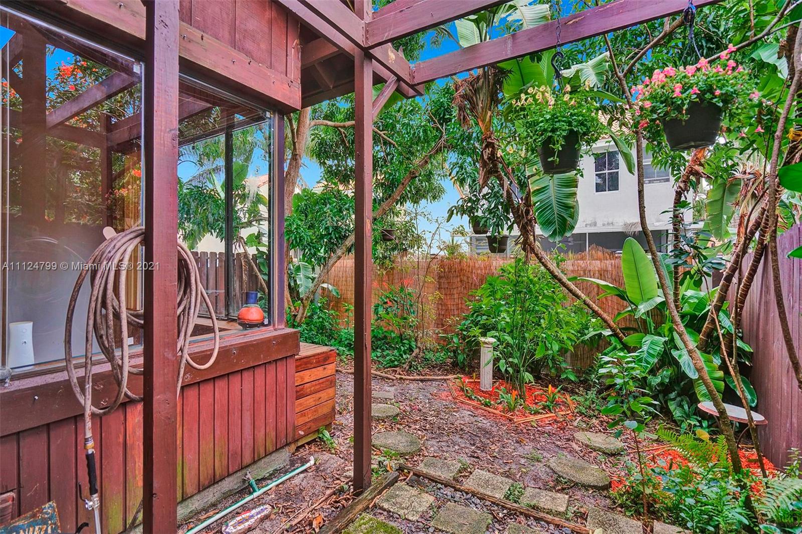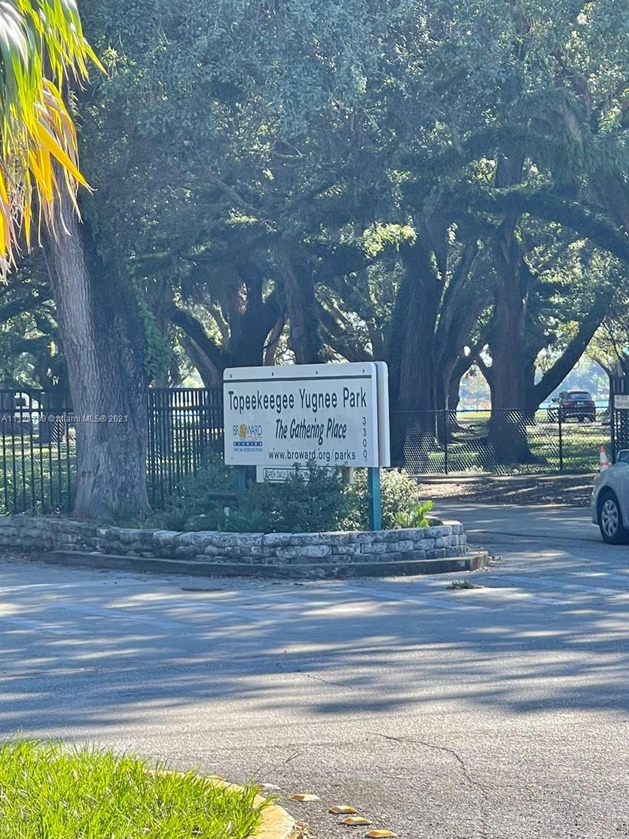 Spacious and bright 3/2 townhouse in a beautiful, leafy community across the street from TY Park in Hollywood. Quiet end unit with tall wood beam ceilings, great for entertaining and relaxing. Literally backs up to the association's private dog park, tennis court, pickle ball courts, basketball court, and steps to the swimming pool and playground. Walk to nearby houses of worship, restaurants and stores, and a short drive to Dania Pointe, Oakwood Plaza, Downtown Hollywood and Hollywood Beach. Exceptional landscaping and amenities in a well-maintained community with low monthly maintenance. Windows upstairs and downstairs look out to many big trees and shrubs. Perfect home for nature lovers, families, dog lovers and active lifestyles.