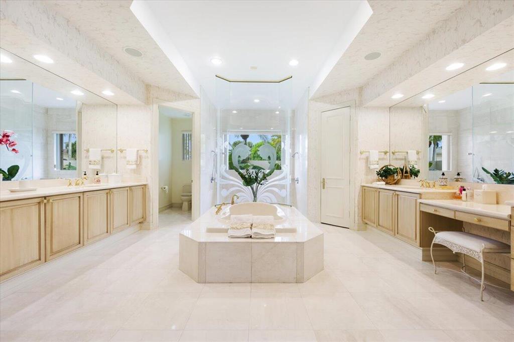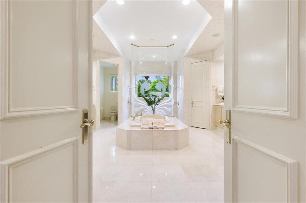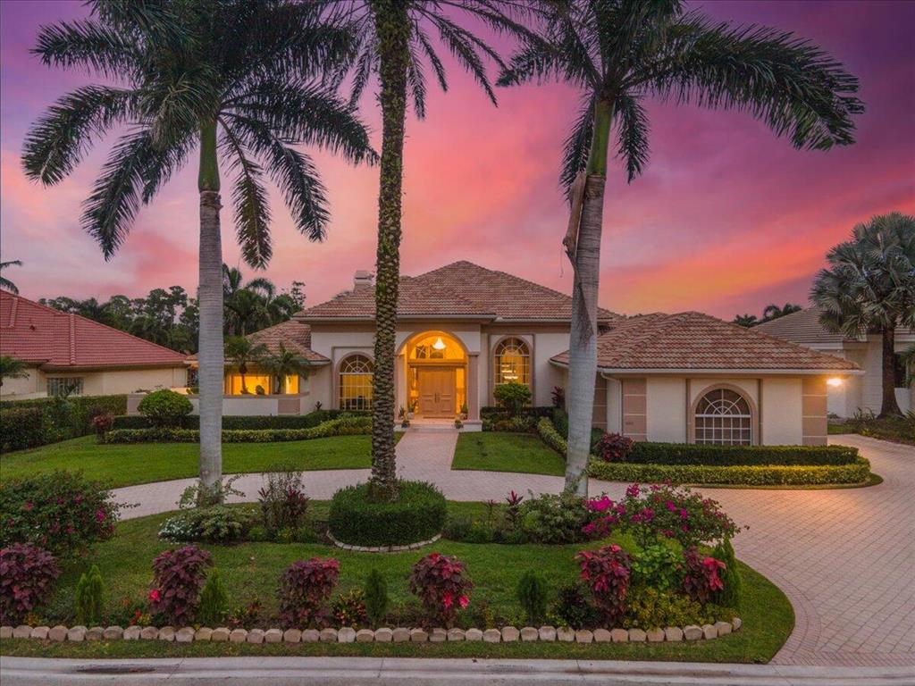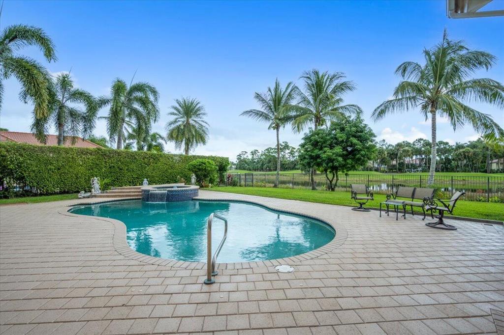 Prime location in beautiful gated community of Breakers West in West Palm Beach! Located on premier cul-de-sac street with stunning water & golf views along the Breakers Rees Jones 11th green. Elegant circular driveway leads to this spacious home with almost 4,800 AC Living Area and 4 BR, Office, 4.5 BA and full 3 car Garage with side entry. New tile roof installed 2016. Impressive Living Room with floor-to-ceiling windows overlooking pool, 16 ft ceilings & marble fireplace. Marble floors in main living areas & wood floors in bedrooms. Lg center island kitchen has 2 sinks, double ovens, granite countertops and pantry closet. An additional catering kitchen for entertaining was added with separate refrig, oven & sink. This flexible space could also be used as an art studio or home gym.