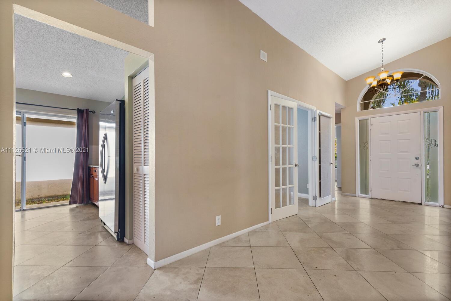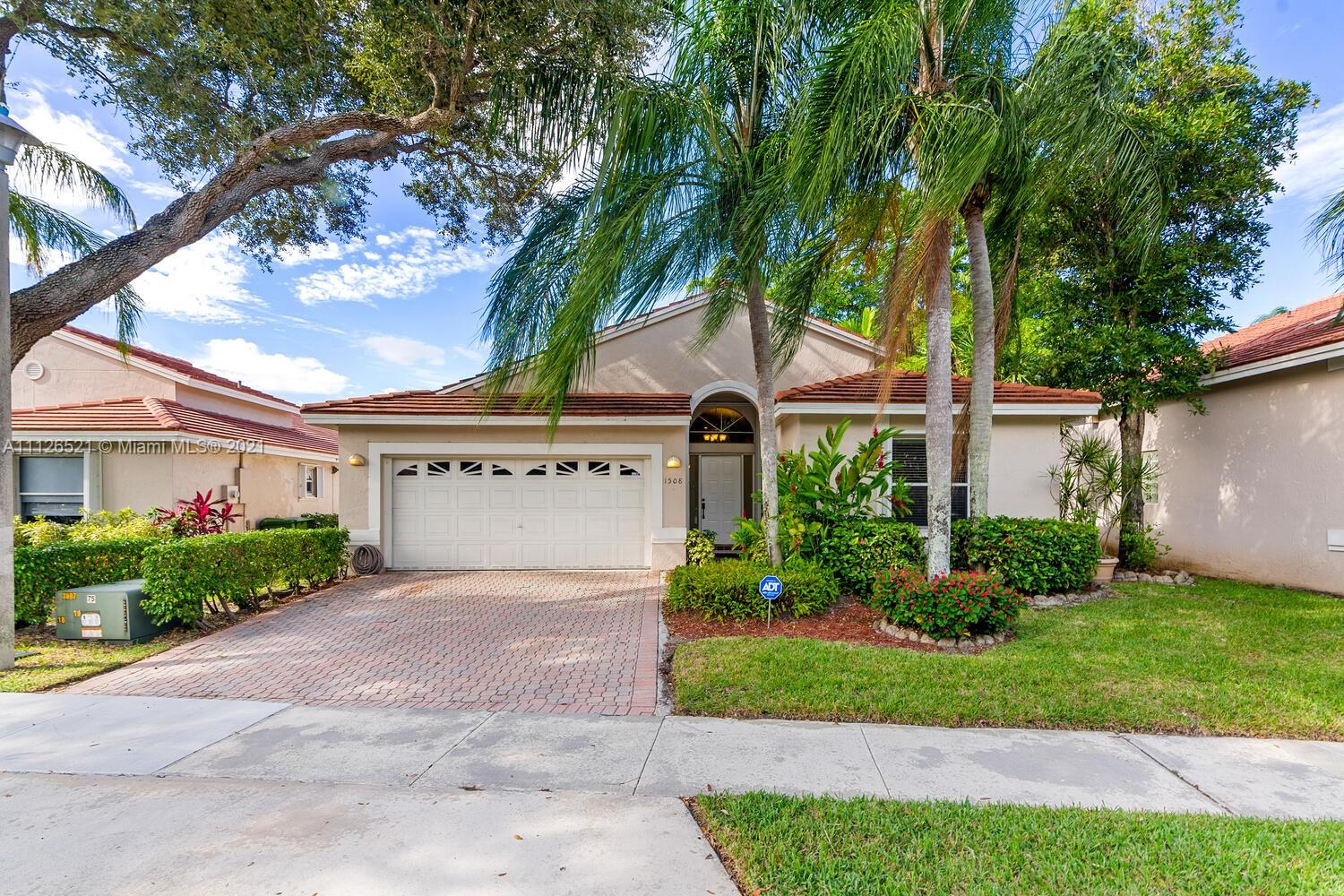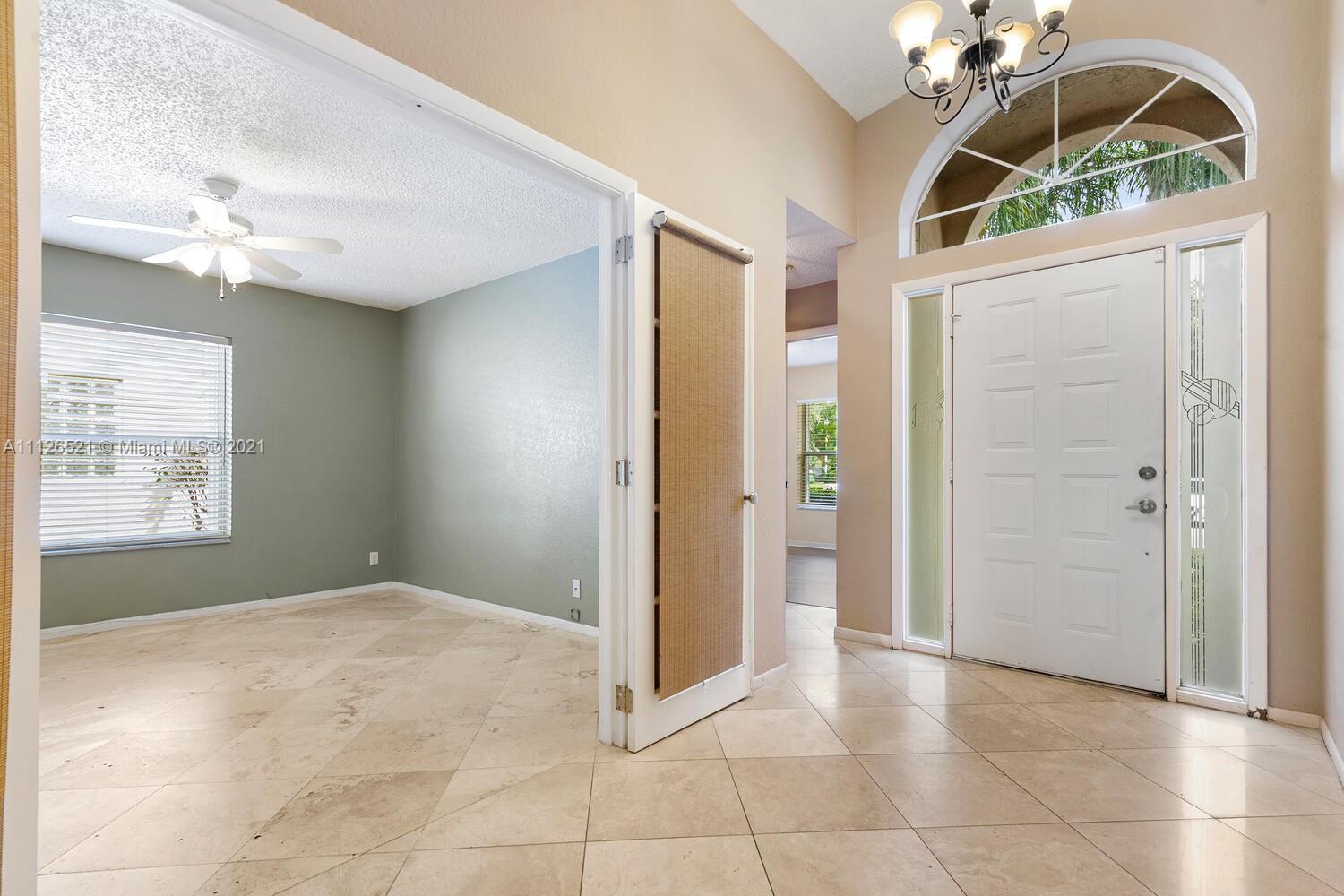 Renovated home on the beautiful Grand Palms Golf Course Community. Travertine flooring (diamond shape) throughout. Custom made wood kitchen cabinets, granite countertops and stainless steel appliances. A split floor plan with a large master bedroom with beautiful view looking over the lake. High vaulted ceilings throughout the home. Screened in patio with travertine flooring with beautiful views of the lake and community pool. Roof is 3 years old. Association fee includes community pool, guard gate, cable, all landscaping (front and back), alarm monitoring and exterior painting of the home.