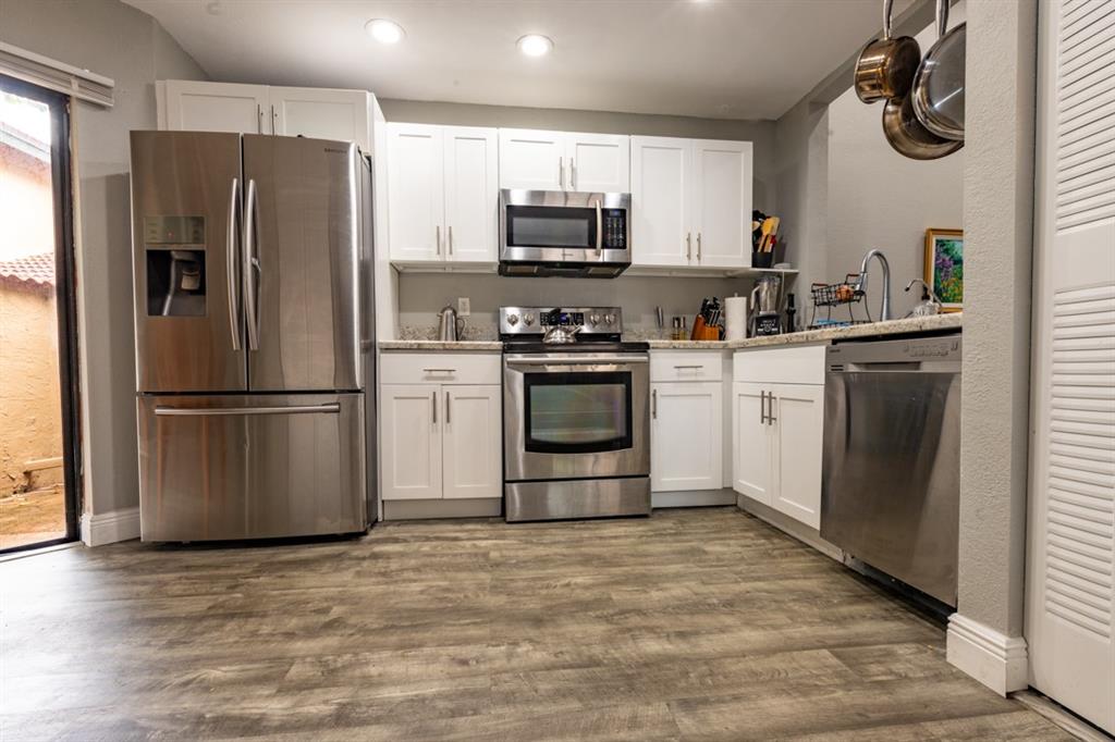 In the heart of Plantation, welcome to your almost stand alone villa with a lake view, & a One Car Garage! This 3 bedroom 2 bath home was remodeled in early 2020, complete newer Samsung stainless steel appliance set, real wood transitional shaker white cabinets with hardware, granite countertops, laminate wood flooring throughout, recessed lighting, fresh paint for the entire home, high ceilings, custom surround tile shower, new plumbing in master bathroom, new baseboards, newer upgraded model washer/dryer, new landscaping mulch, BBQ area outside of kitchen slider, & a 2nd screened for entertaining with an exit to walk your dog. The polybutylene piping has been replaced with copper throughout the home. Welcome to your new home, and nothing to do but move in.