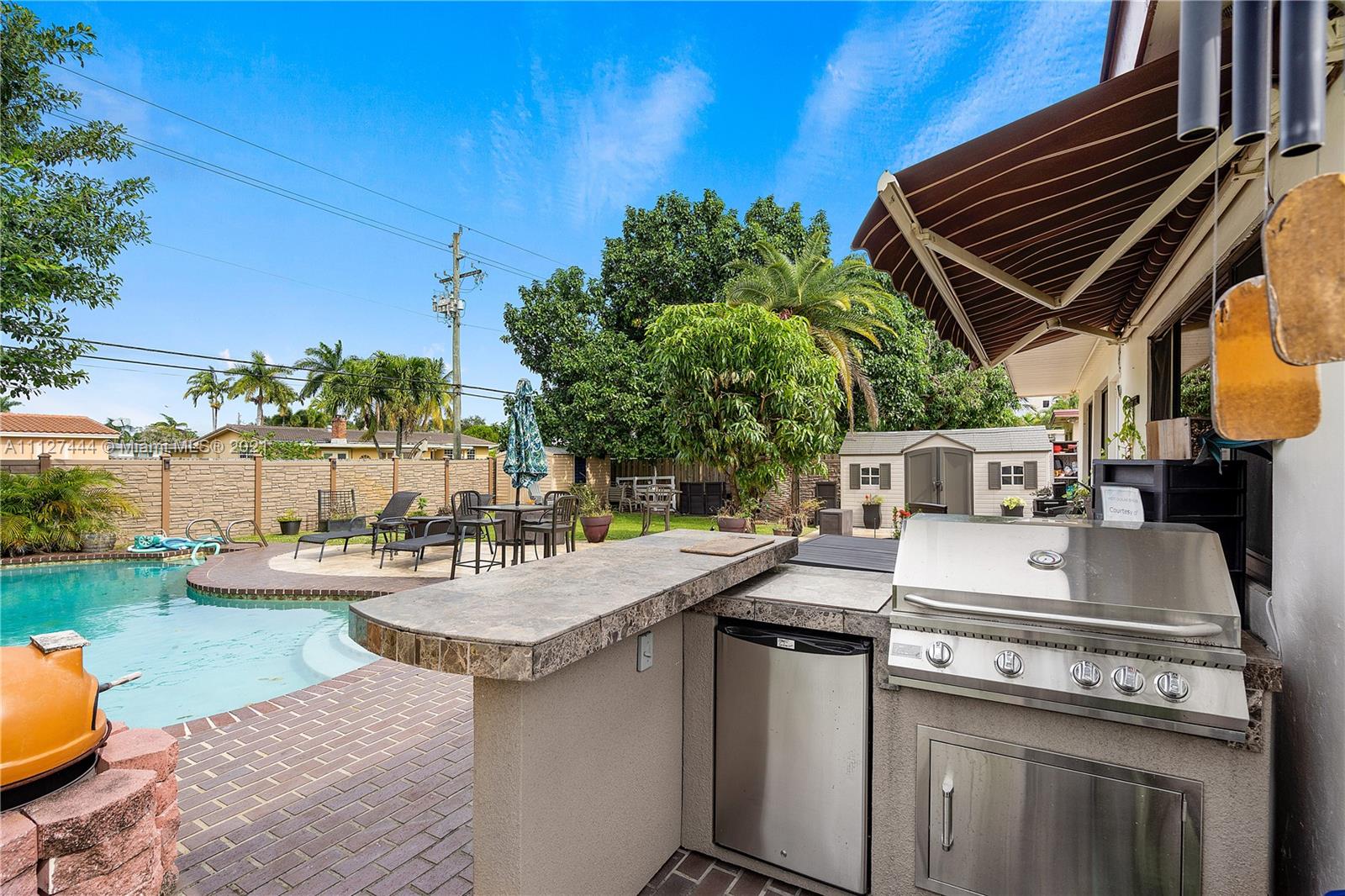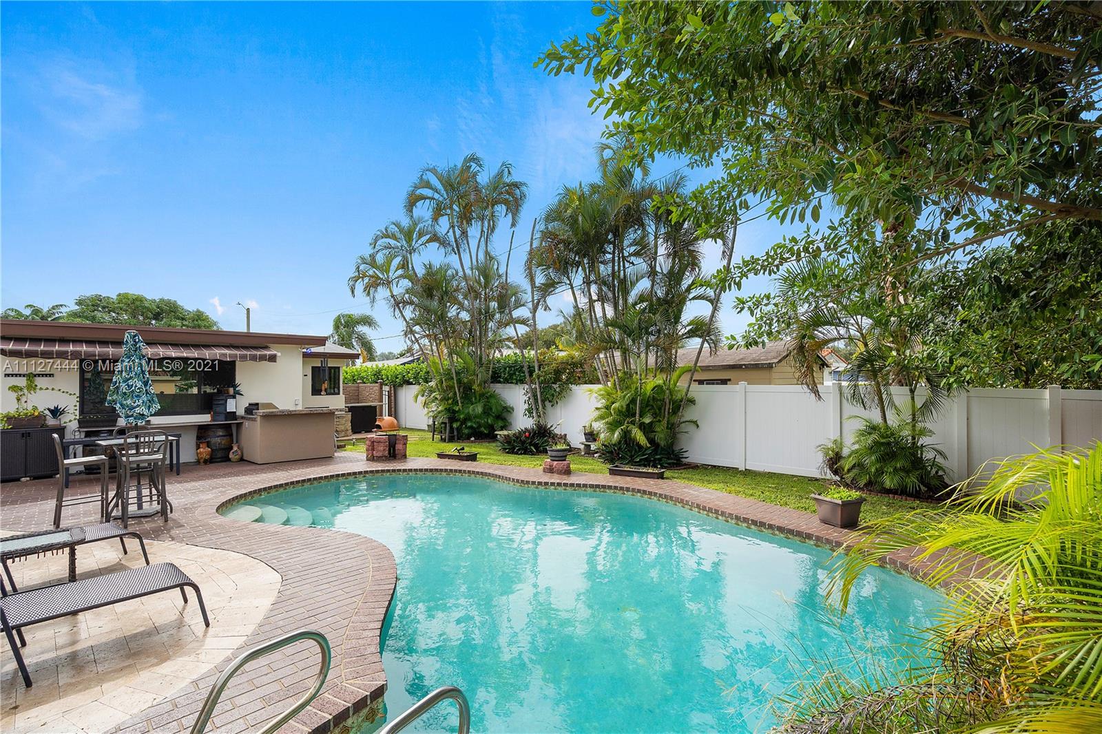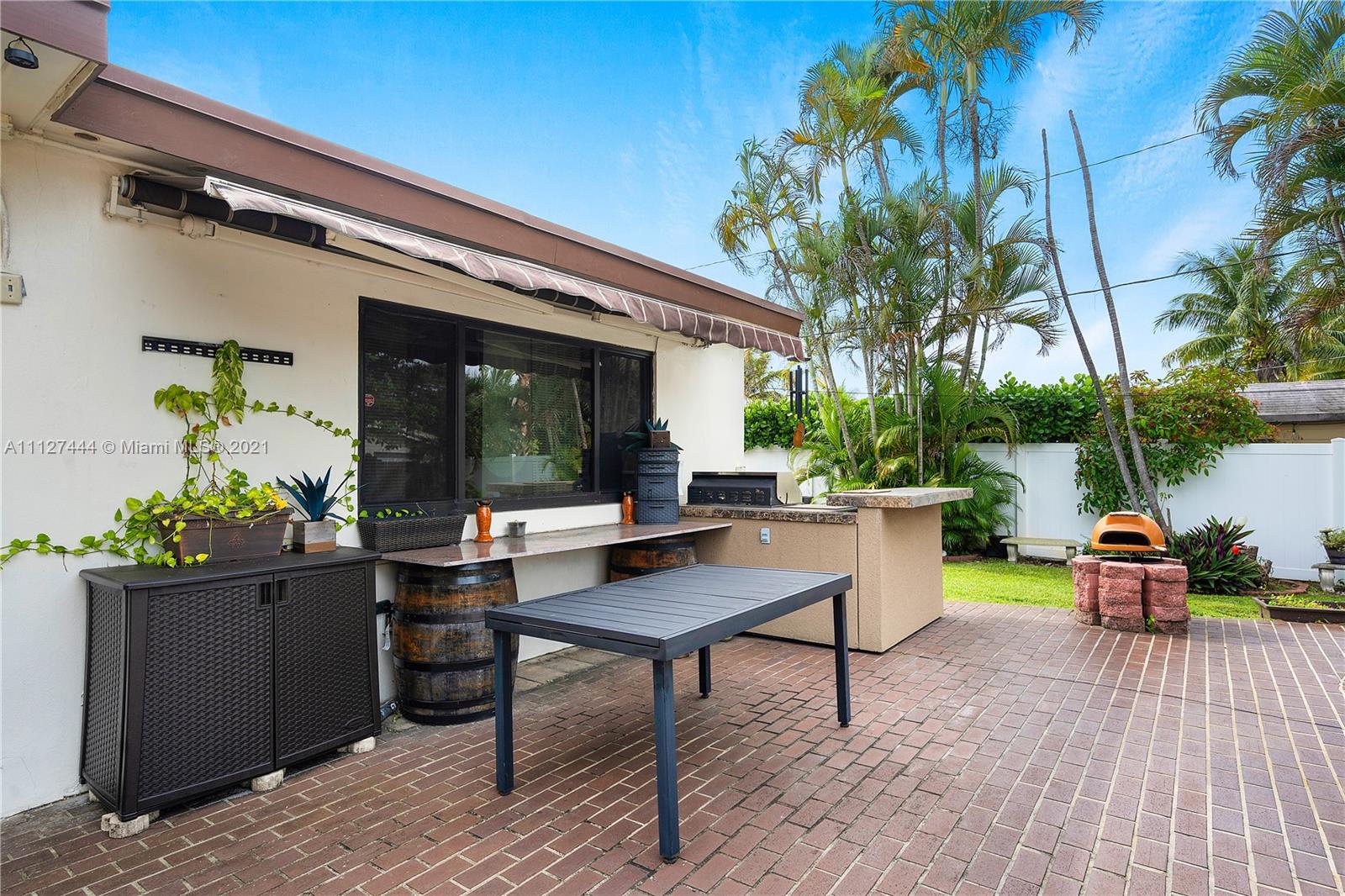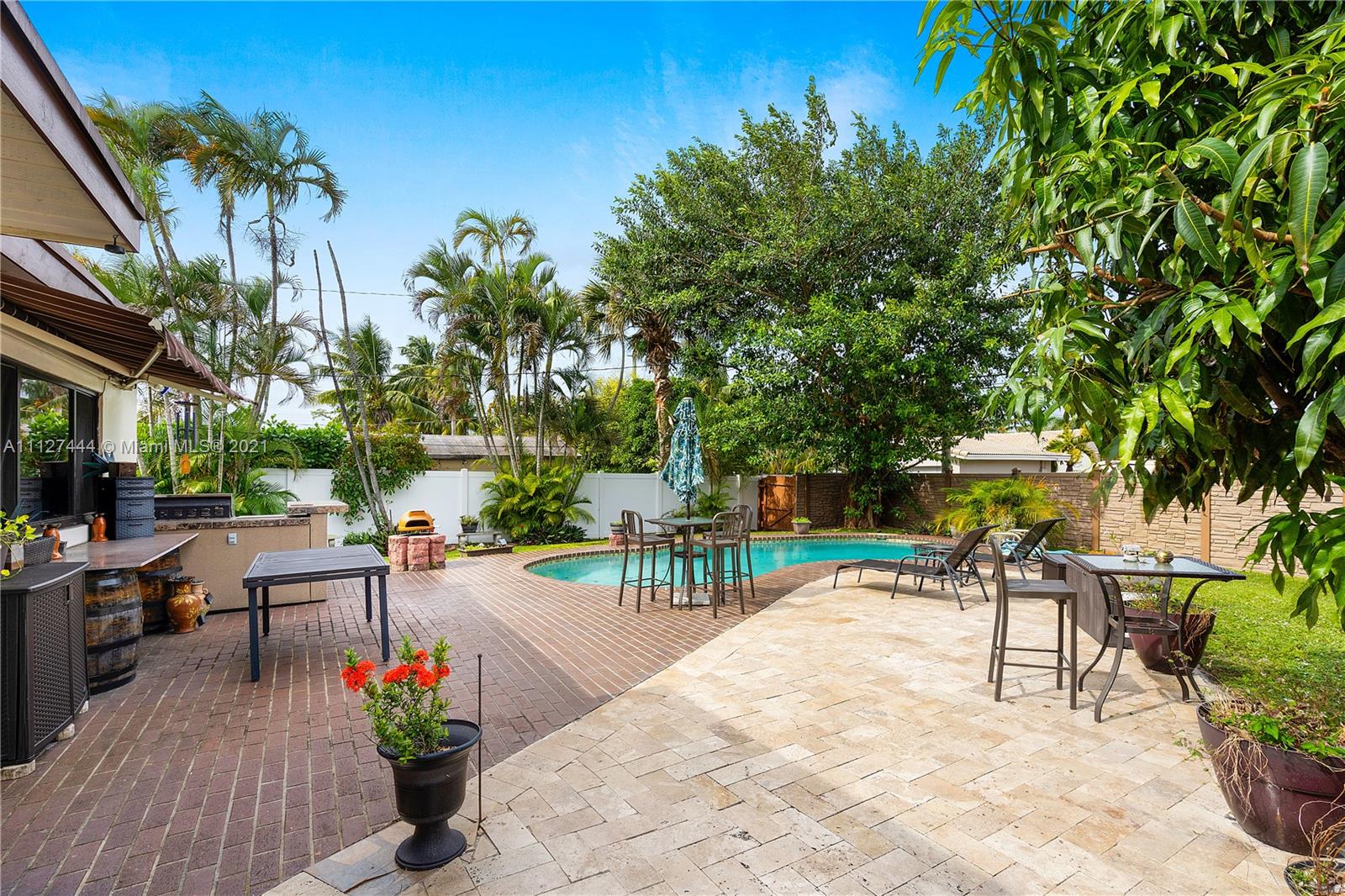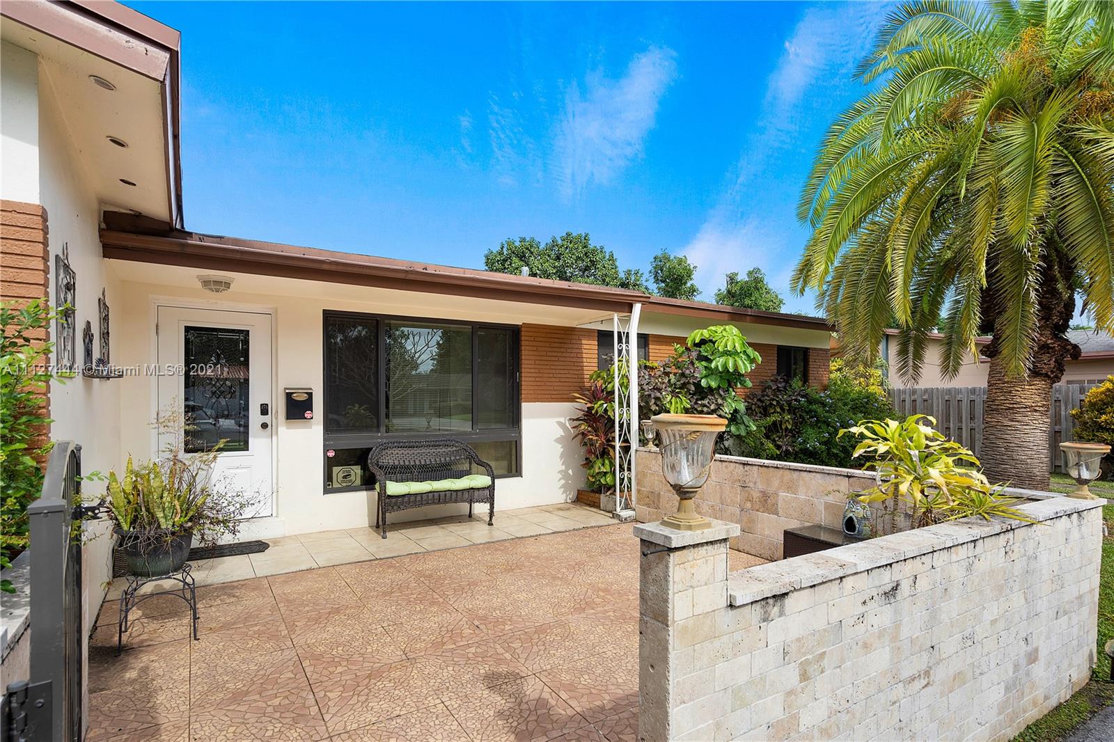 Enter through the front doors with the new paver patio that is gated. 1,690 sqft 3/2 with bonus in-law suite (could be a fourth bedroom) Recently remodeled throughout, tile floors, hurricane proof windows, new travertine pavers, long circular driveway with extended drive on the side of the house and stainless steel appliances. Outside is a fabulous oasis for relaxation, entertaining and grilling on the new BBQ island. Yard is fenced in with resin fencing, new shed, mango tree, rare palms, and solar shower for when you are done swimming in the pool. Located on the back and side of the house are remote control awnings.