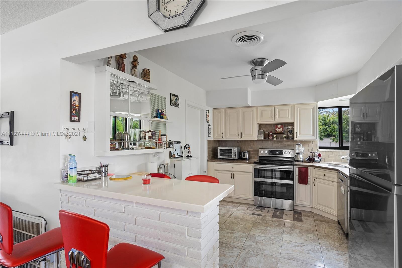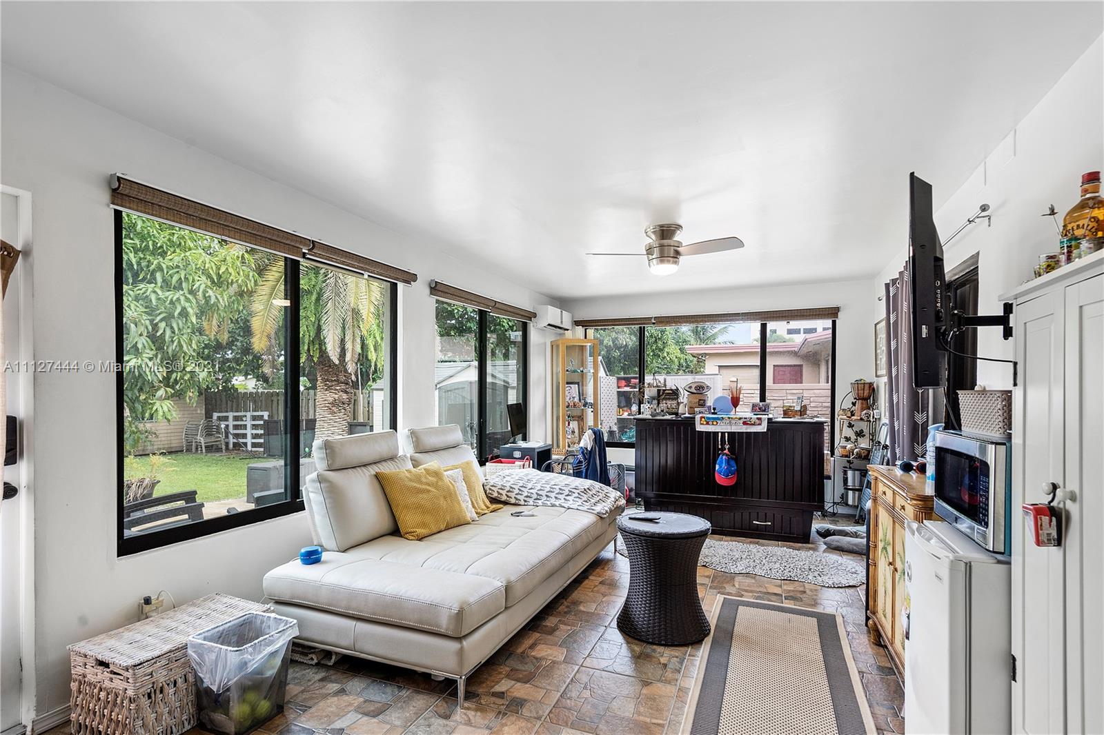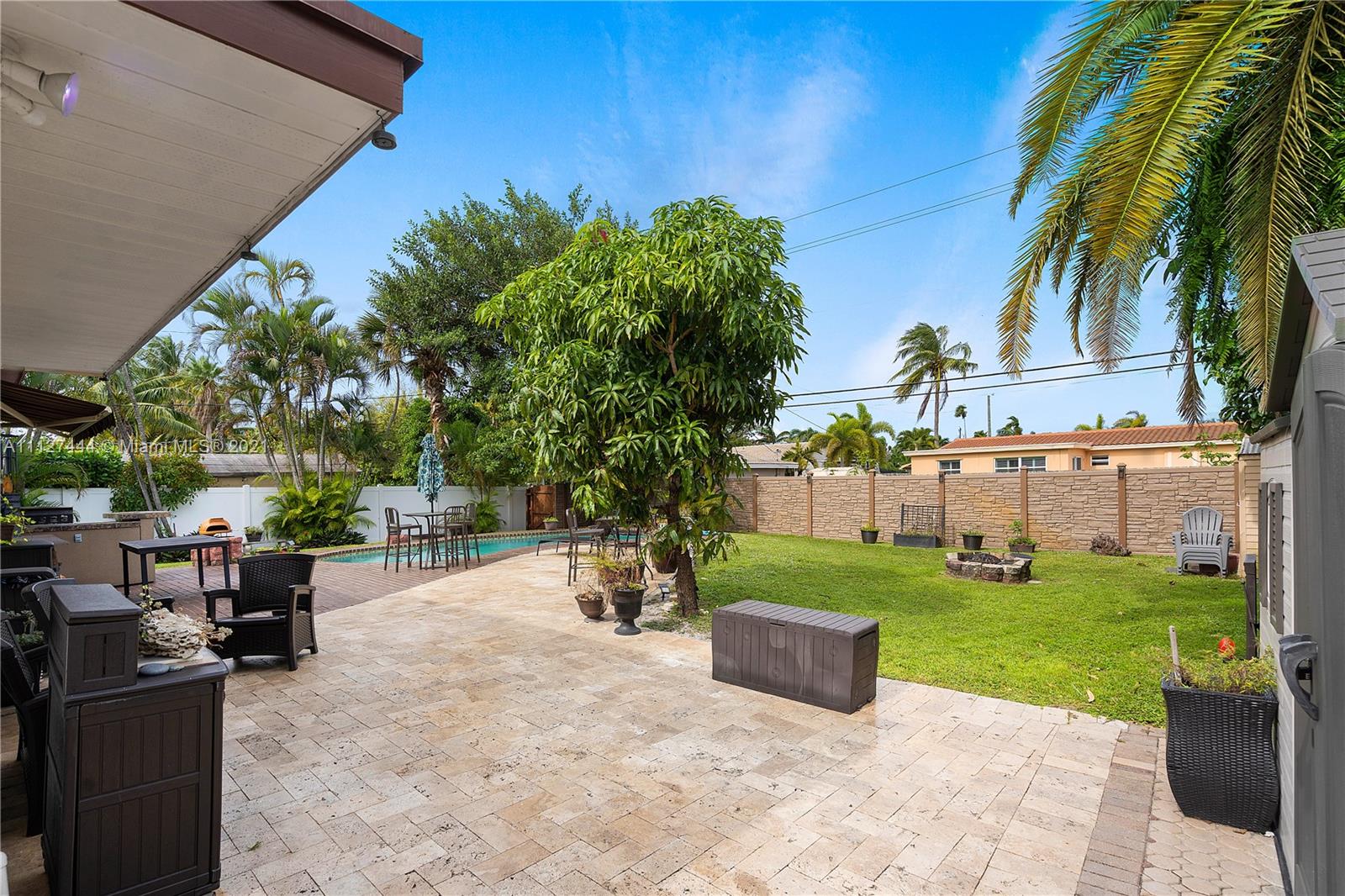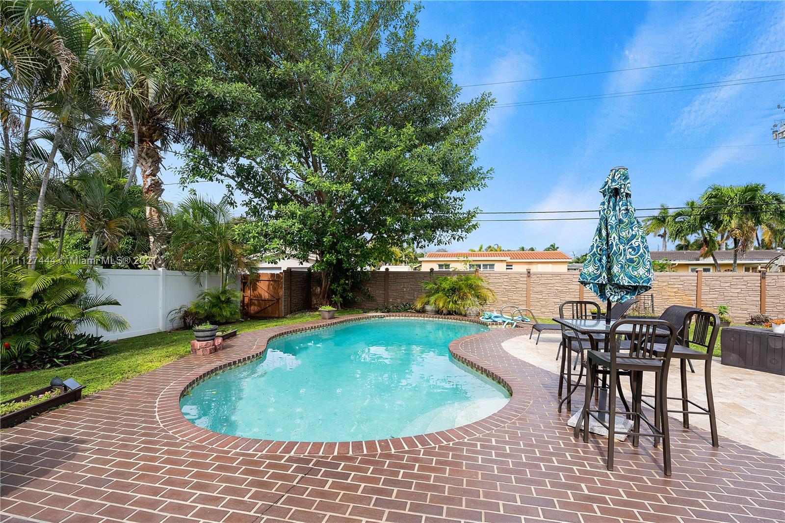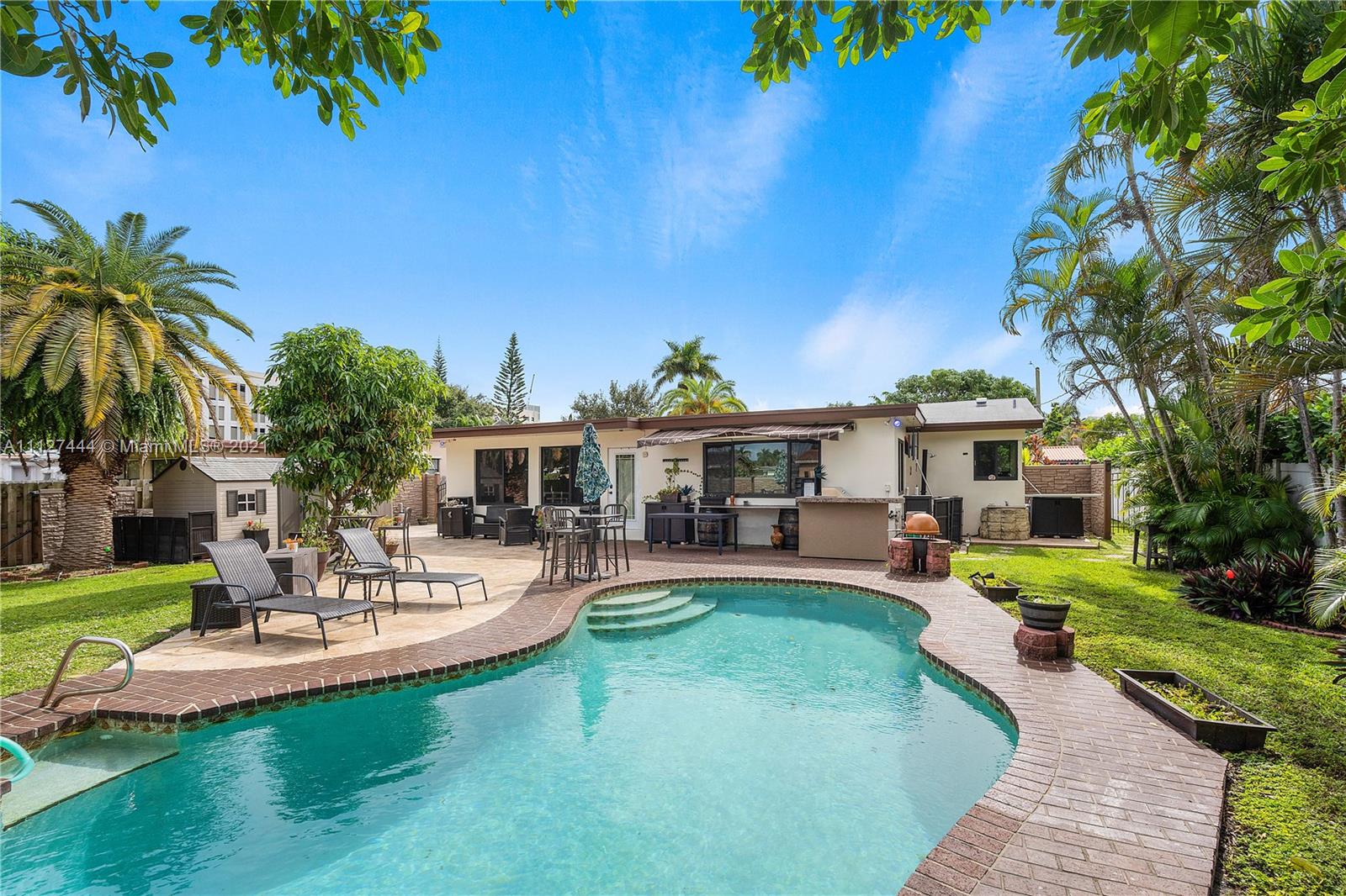 Enter through the front doors with the new paver patio that is gated. 1,690 sqft 3/2 with bonus in-law suite (could be a fourth bedroom) Recently remodeled throughout, tile floors, hurricane proof windows, new travertine pavers, long circular driveway with extended drive on the side of the house and stainless steel appliances. Outside is a fabulous oasis for relaxation, entertaining and grilling on the new BBQ island. Yard is fenced in with resin fencing, new shed, mango tree, rare palms, and solar shower for when you are done swimming in the pool. Located on the back and side of the house are remote control awnings.