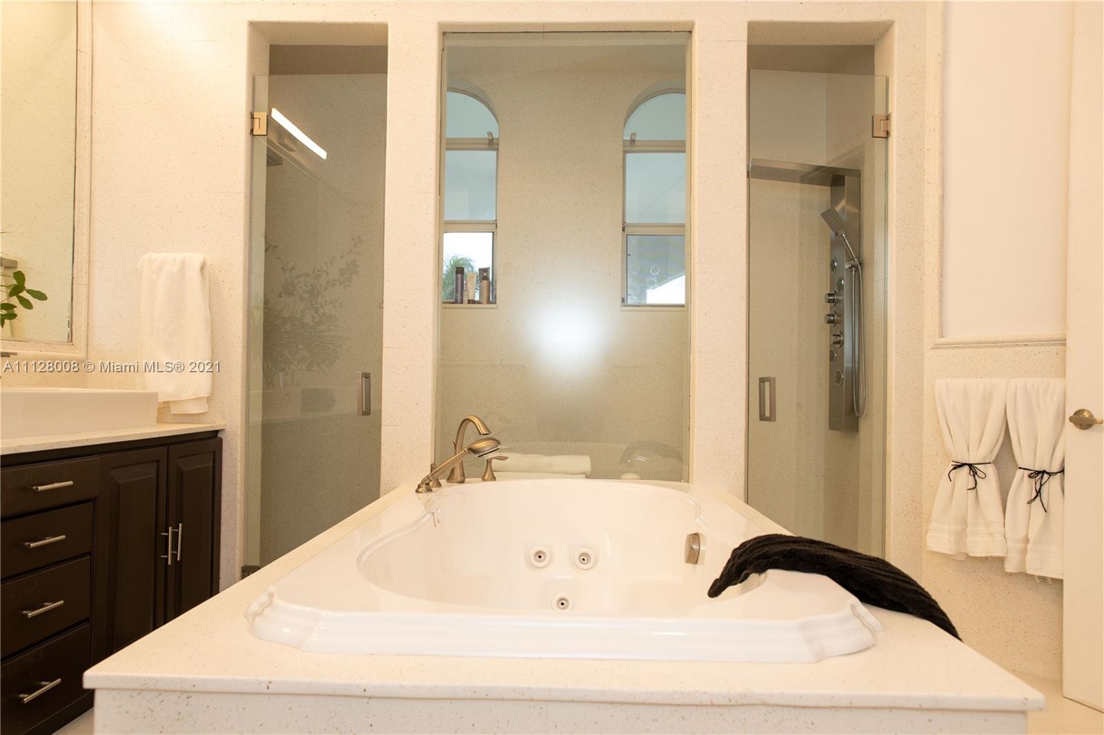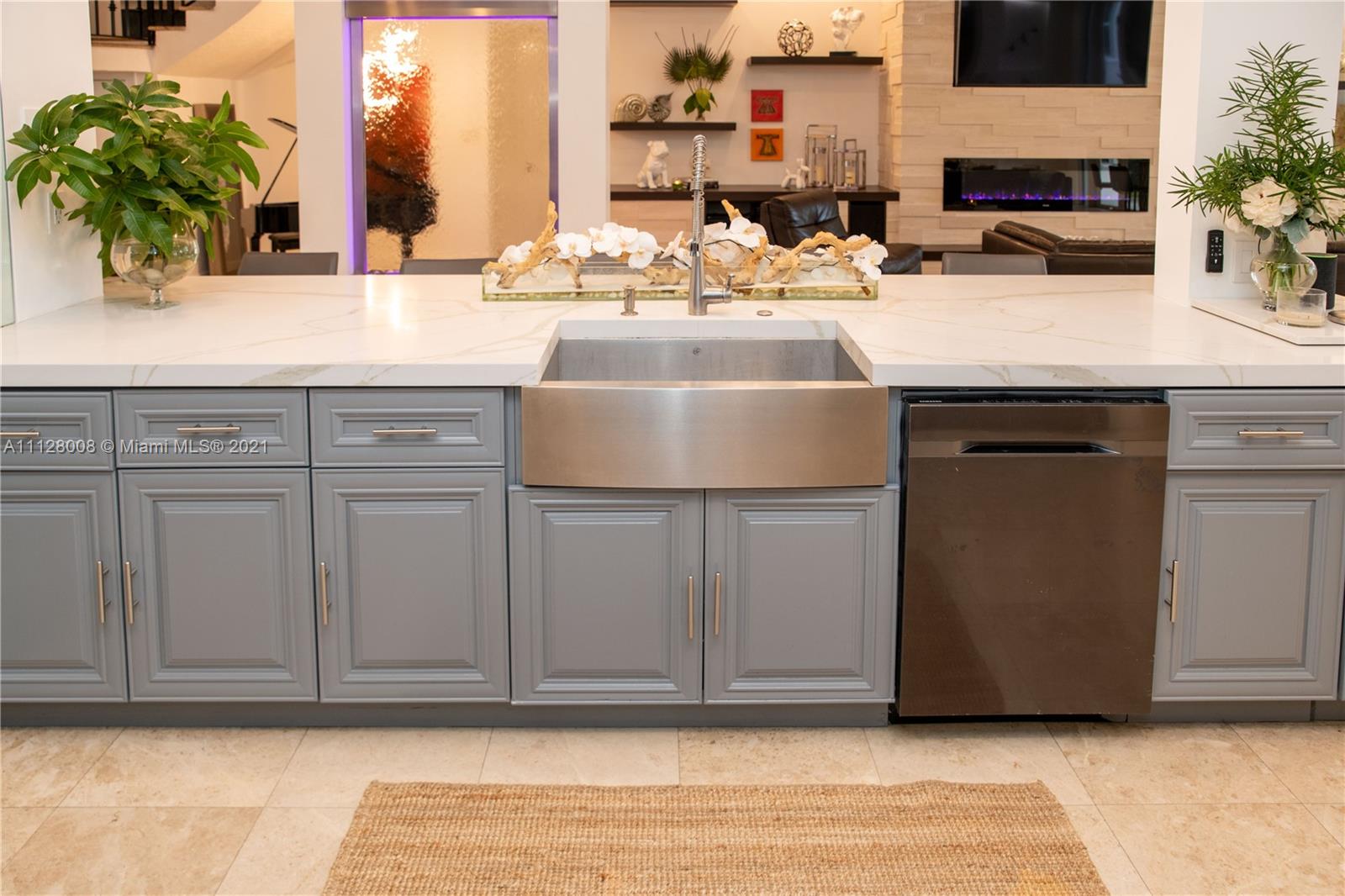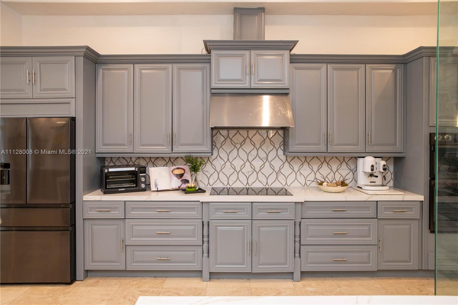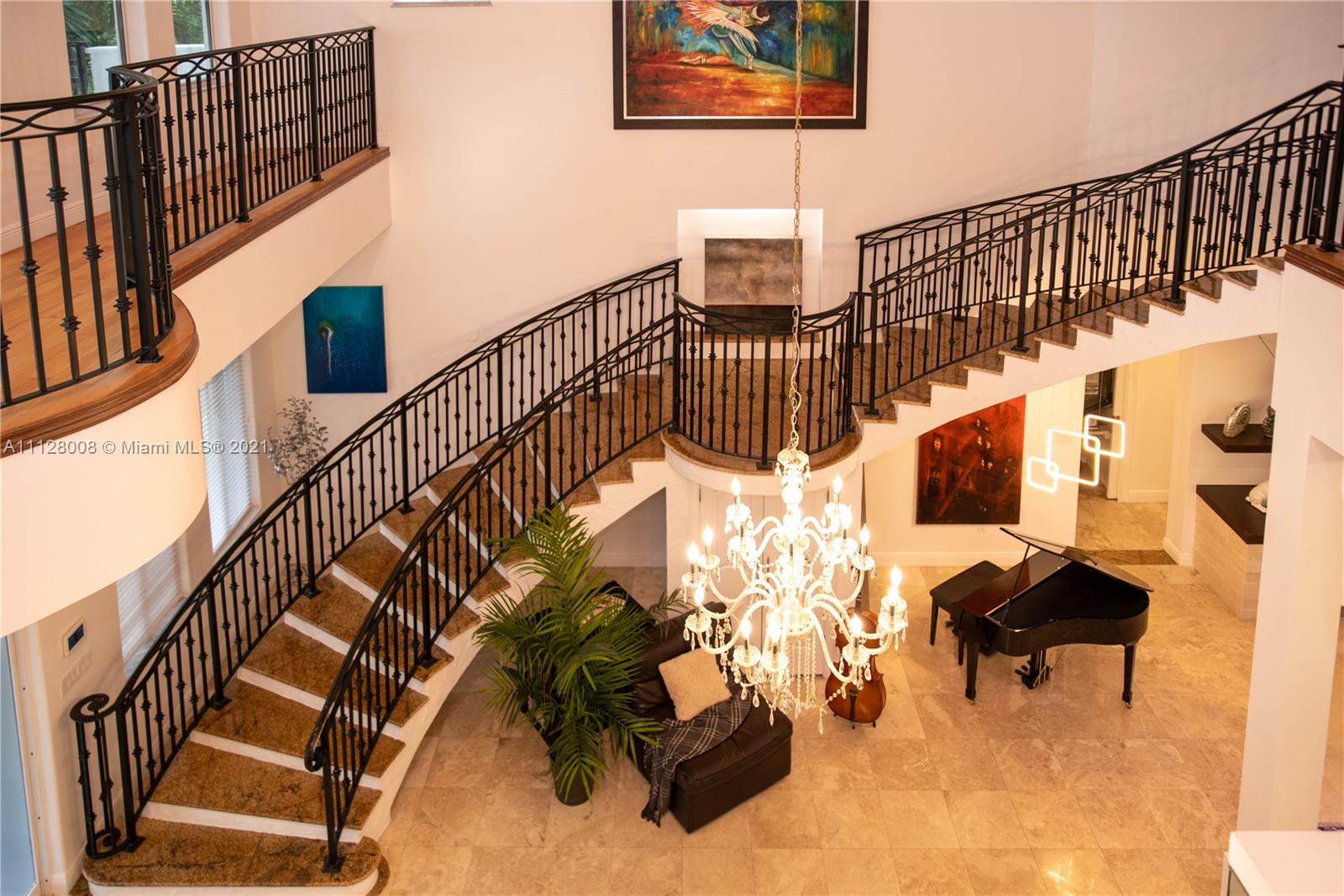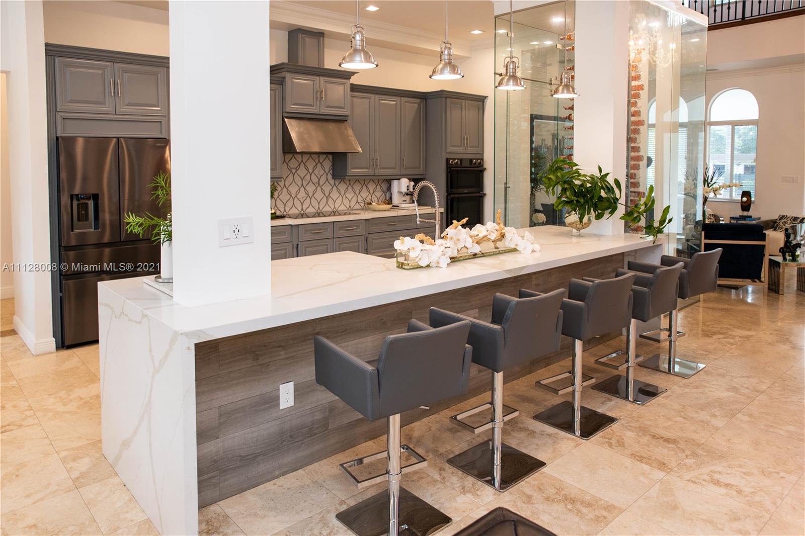 This architecturally stunning 6B+4B (7,598 sf | 1 acre lot) 2014 home displays exquisite sophistication & thoughtful details throughout. This Modern home, seamlessly combines a traditional w/ a modern twist, creating a balance that boasts comfort, natural light, & warmth. From the moment you enter you are greeted with soaring 31 foot high cedar ceilings, and a one of a kind exquisite granite and wrought iron staircase. Family room excels in designer soffit ceilings and fireplace to offer a large social gathering space around an elegant Chef Kitchen w/ stunning Calacatta countertops on display. A wine glass room backed by a large, elegant island with 4 chrome pendant lights over the sink that illuminate the bright gray design of this kitchen and provides space for cooking and entertaining.