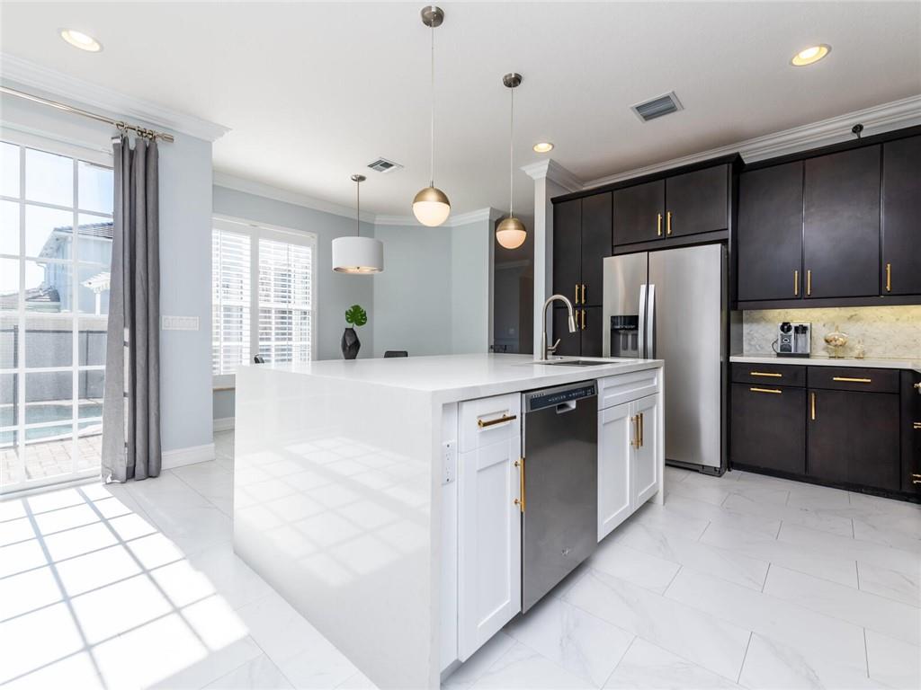4/2.5 plus loft, pool, & 2 cg. This beauty offers impact windows & doors, remodeled kitchen w/ quartz waterfall island, wood cabinetry, marble back splash, SS apps. & breakfast area. Dual A/C, tile roof, porcelain tile on first floor, spacious master suite w/ tray ceilings, & walk-in closets, Mstr bath w/ dual vanities, tub & shower, laundry rm w/ cabinets, tub, & W/D. Volume ceilings, foyer, 8’ interior doors & freshly painted 2017. Formal dining, living & family rm have French doors overlooking the pool. Recent upgrades include new A/C 2021, built-in cabinet w/ wine fridge, porcelain tile floors, irrigation system, outdoor lighting w/ motion sensors, doorbell camera (nest), fans, lighting i.e. recessed led lights, powder rm renovated w/ floating vanity & quartz counter.