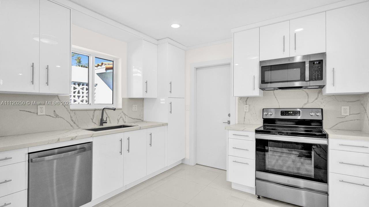Wonderful opportunity to live in the Gables! Completely remodeled home, 3 BR, 2 BA, 1 car garage. Open floor concept with white porcelain floors throughout, large master bedroom with walking closet, a beautifully renovated bathroom, second bathroom is also completed remodeled with double sinks, beautiful kitchen with brand new stainless steel appliances, quartz waterfall countertops and back splash, bright family room overlooking the large backyard, plenty of room for a pool, brand new roof, impact windows and doors, brand new impact garage door, modern light fixtures, freshly painted inside and outside, close to Merrick Park Shopping Center, downtown Gables, Miami Airport and great schools.