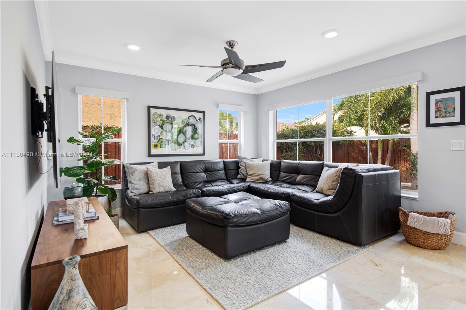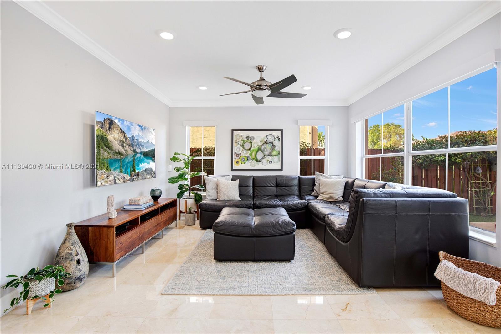 Hidden Gem in gated community HIDDEN LAKE. This gorgeous two story, 3 bed + office room /2.5 bath home. Freshly painted and completely RENOVATED. Marble floors and custom window treatments throughout. Accordion shutters on second floor, crown molding, led flush mount lighting in kitchen, family room, bathrooms and halls. NEW Stainless Steel Appliances and granite countertops. NEW Washer and Dryer. REMODELED Bathrooms with Devon Italian faucets, modern vanities, fabulous lighted frameless mirrors and rain showers. Ring video doorbell and three outdoor wireless cameras. Spacious fenced backyard with concrete floor and gorgeous landscaping, palm trees and lighting. 2 car garage with storage cabinets. HOA Master:$355 Quarterly + Hidden Lake $55 monthly. YOU CAN'T MISS THIS OPPORTUNITY!!