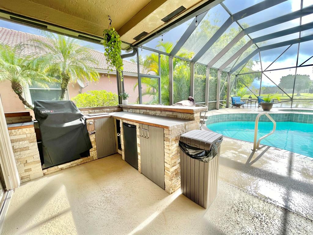 Tranquil South Exp 5 Bed 2.5 Bath One Story Lakefront Screened Pool Home in Highly Sought Boca Falls w/ Peaceful Outdoor Space w/ Beautiful Lake/Park views, Freeform Salt Water Pool operated through phone w/ Spa, Waterfall, Pool Heater, and Screened Patio, Outdoor kitchen w/ BBQ & Mini Refrigerator. Wired for Surround sound inside and out, Sprinkler off Lake, Hurricane protection, Remodeled Kitchen w/ Granite countertops & custom cabinets open to Family Room, Stainless Steel appliances, Master Bdrm w/ two closets, Master Bathroom with Granite Countertops, double vanity,ALL closets with Built-in's, 2nd bath/cabana bath w/ double granite vanity, wood cabinets, & custom mirror, Laundry Room off updated 1/2 bath. Boca Falls HOA incl. Basic Cable ,Internet &6HBOs ,Clubhouse, 6 tennis cts,& more