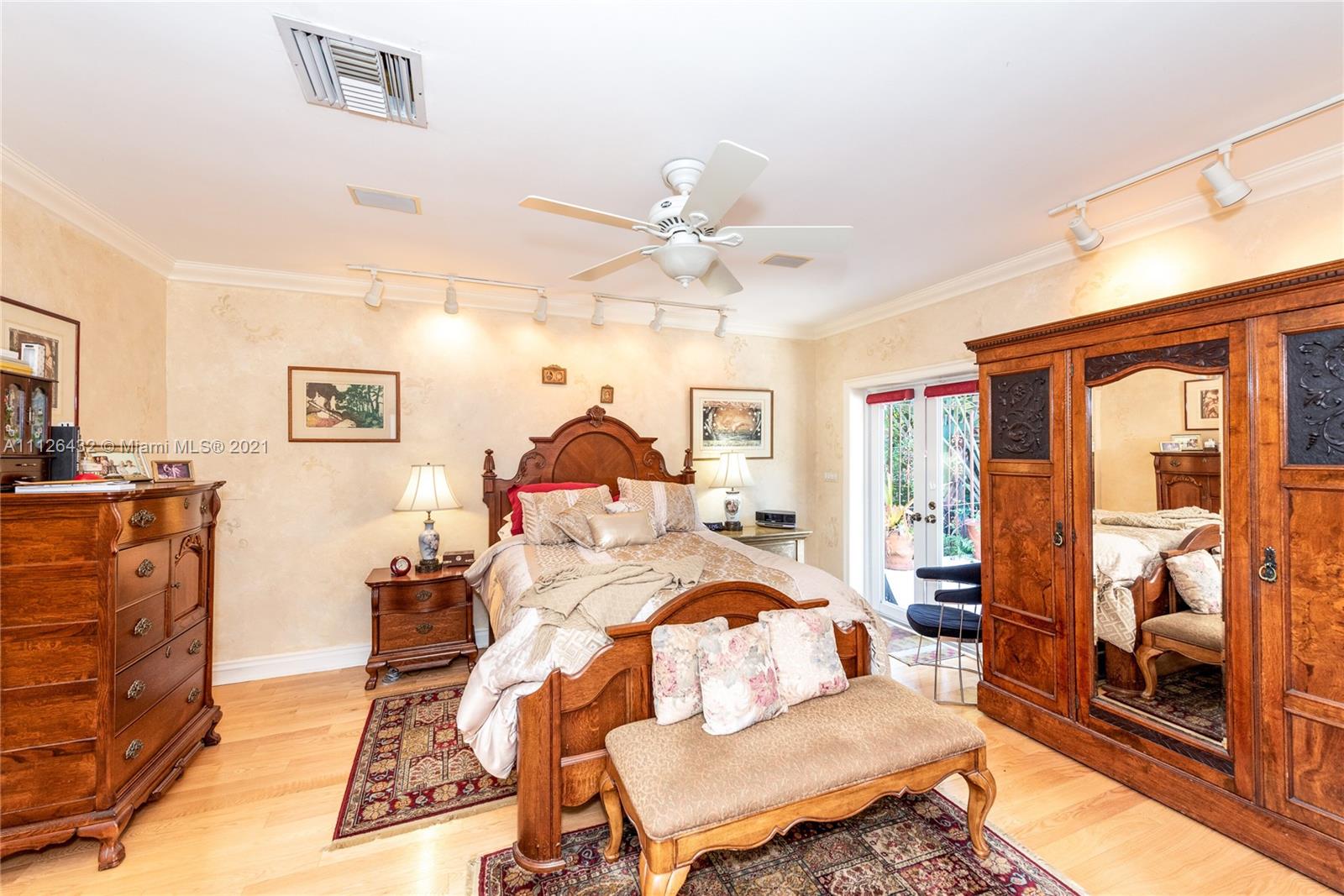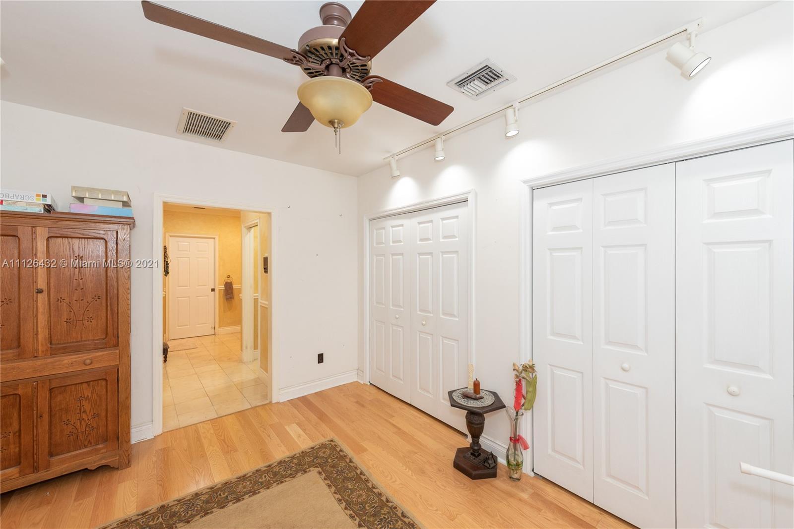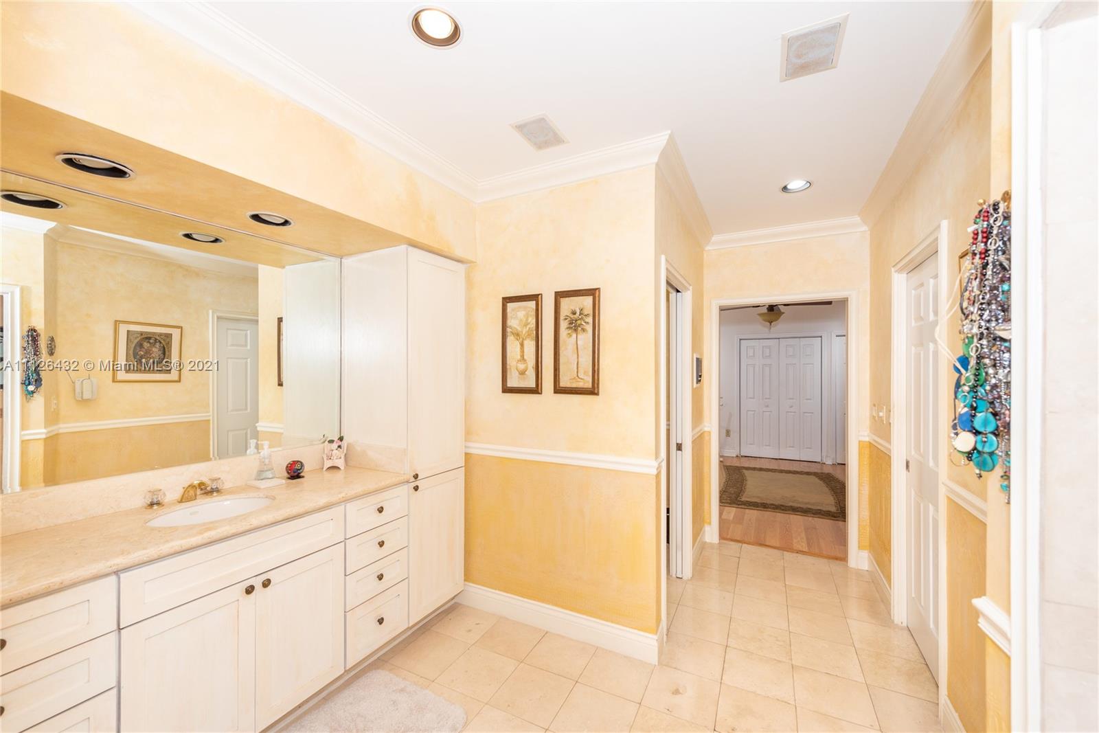 New Listing in South Gables right across the street from the Grove. Quiet area. This late 50's home sits on an 11,385 ft. lot with almost 3700 adj.sq.ft. Circular drive to large covered entrance porch. Foyer with hall to left that has bath,one bedroom and another bedroom that has been closed off to make a larger master closet but could be reopened back to a four-bedroom. Across from foyer is a very large, high ceilinged living room with fireplace. Dining room to right. Kitchen with walk-in pantry. Master suite in rear.. Large Family room with walls of impact glass opening to pool. Spacious patio. Small office. Maid/guest room/bath is next to the two-car gar. Impact windows or accordion shutters. Lots of light. Home has potential to become a very contemporary abode. Well priced.