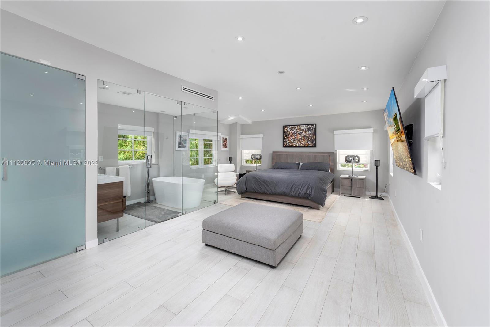 This Iconic Art Deco 'Palm View Historic District' masterpiece home w/ an automatic gate that opens to your beautifully manicured & paved driveway with a checkered grass inset. 1 car carport & enough room to park 10+ vehicles to entertain. Renovated to perfection w/custom luxury finishes. An exquisitely remodeled 2Bed 2.5Bath home w/ an oversized 1Bed/1Bath detached guest cottage. Vaulted ceilings in the main living w/faux fireplace, open floorplan, next to your newly renovated kitchen & dining area that leads to a separate den. 1Bed downstairs w/ensuite bath, & enormous primary suite upstairs. Huge walk-in closet, glass-enclosed primary bath with its own free-standing tub & separate shower. The expansive backyard with enough room for a large pool and dining and grill entertainment area.
