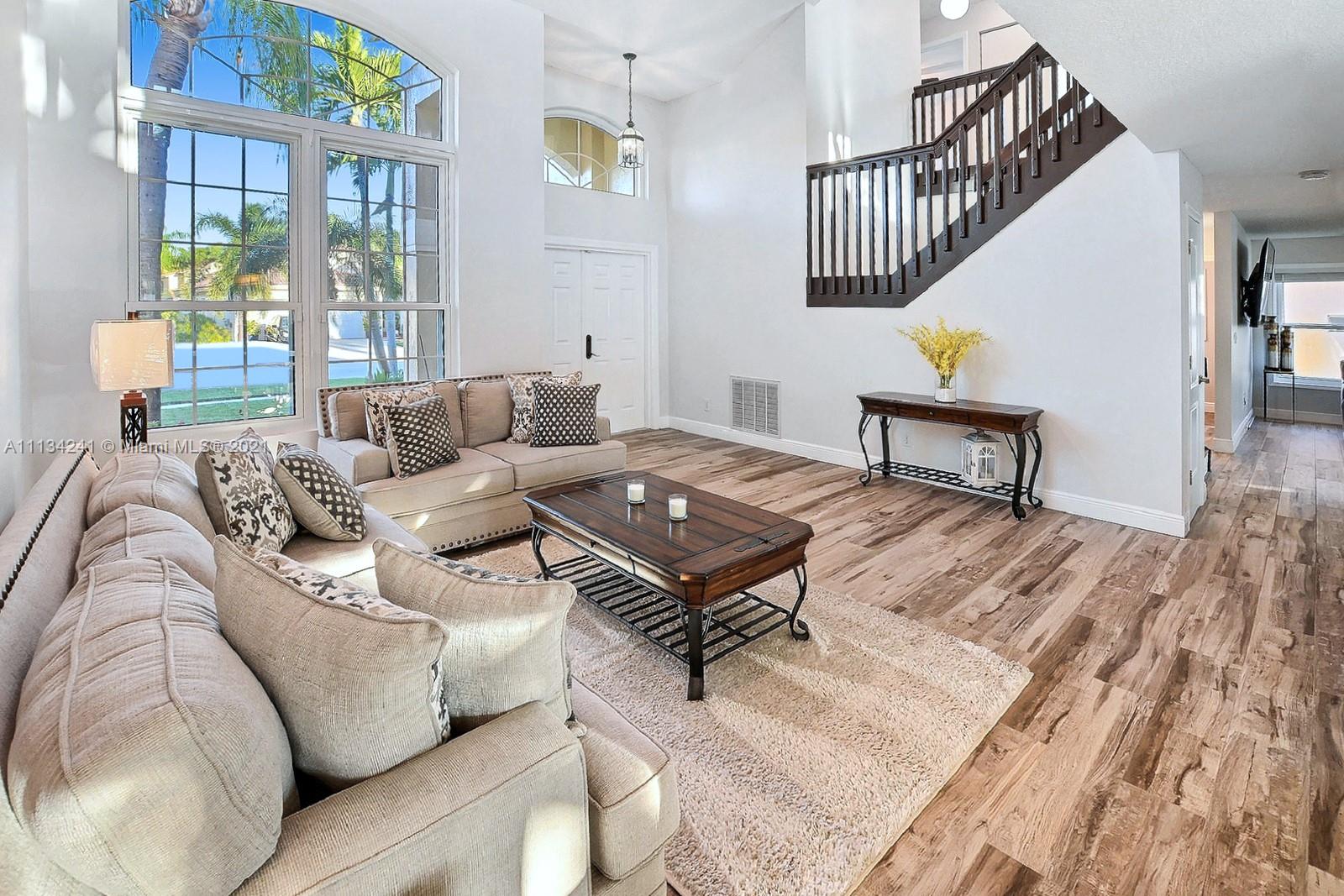 STUNNING 4 BED 2.5 BATH HOME IN HIGHLY DESIRABLE SILVER LAKES IN PEMBROKE PINES EXUDES CURB APPEAL FROM TASTEFUL LANDSCAPING TO COVERED PORCH ENTRY. ELEGANT DOUBLE DOORS OPEN INTO A TWO STORY FOYER. ENJOY SPACIOUS LIVING AREAS FILLED W NATURAL LIGHT, SPECTACULAR MODERN WOOD-LOOK TILE. GORGEOUS KITCHEN W DREAMY WHITE SHAKER CABINETS, STAINLESS STEEL APPLIANCES & BREAKFAST NOOK OVERLOOKING THE YARD. UPSTAIRS PRIMARY SUITE HAS HUGE WALK-IN CLOSET & ENSUITE BATH COMPLETE W 2 VANITIES, SHOWER, & ROMAN TUB. 4TH BEDROOM USED AS AN OPEN LOFT. PRIVATE YARD IS FULLY FENCED, HAS ROOM TO PLAY & OFFERS A CHARMING COVERED PATIO PERFECT FOR OUTDOOR DINING. IMPACT WINDOWS. ALL IN A FABULOUS COMMUNITY SURROUNDED BY LUSH LANDSCAPING, WINDING STREETS & MEANDERING LAKES WITH PROXIMITY TO SHOPS & RESTAURANTS.