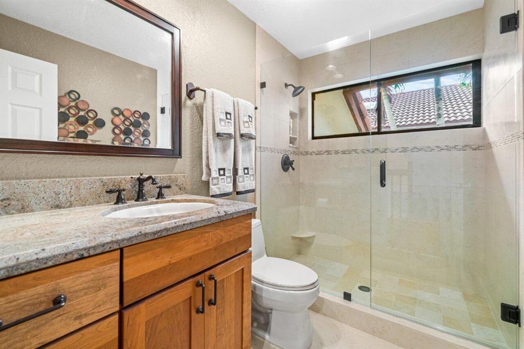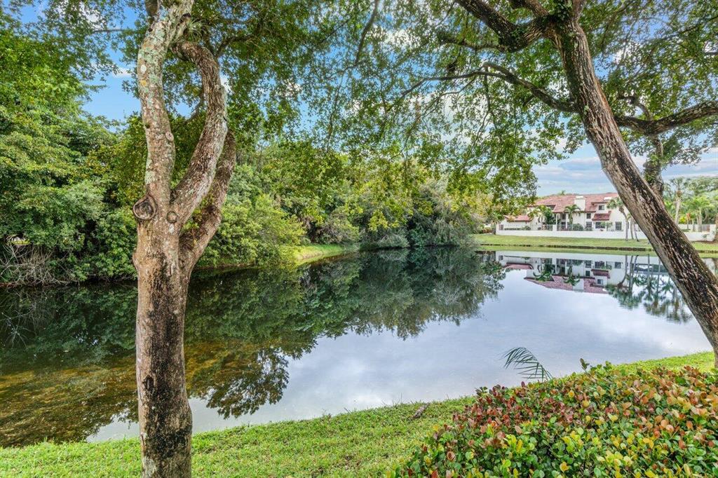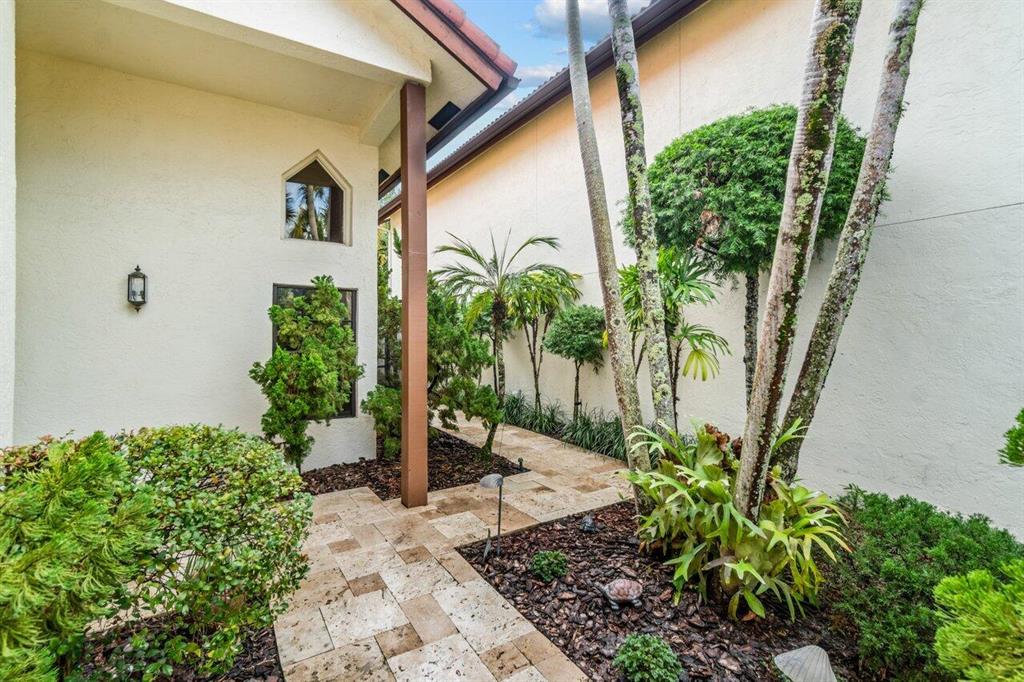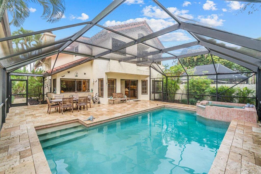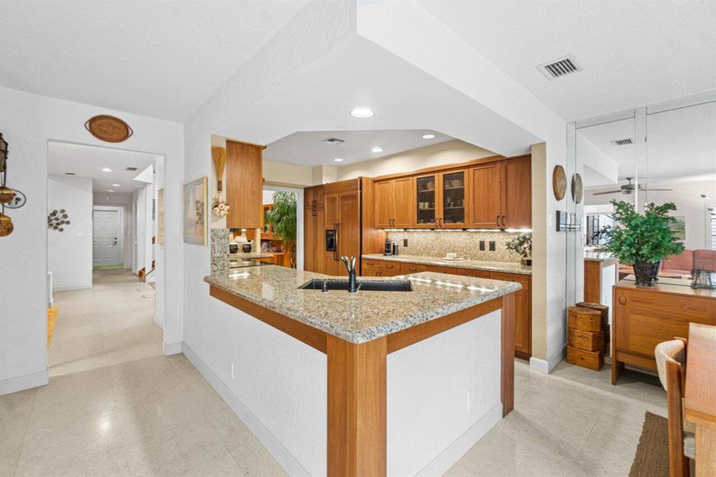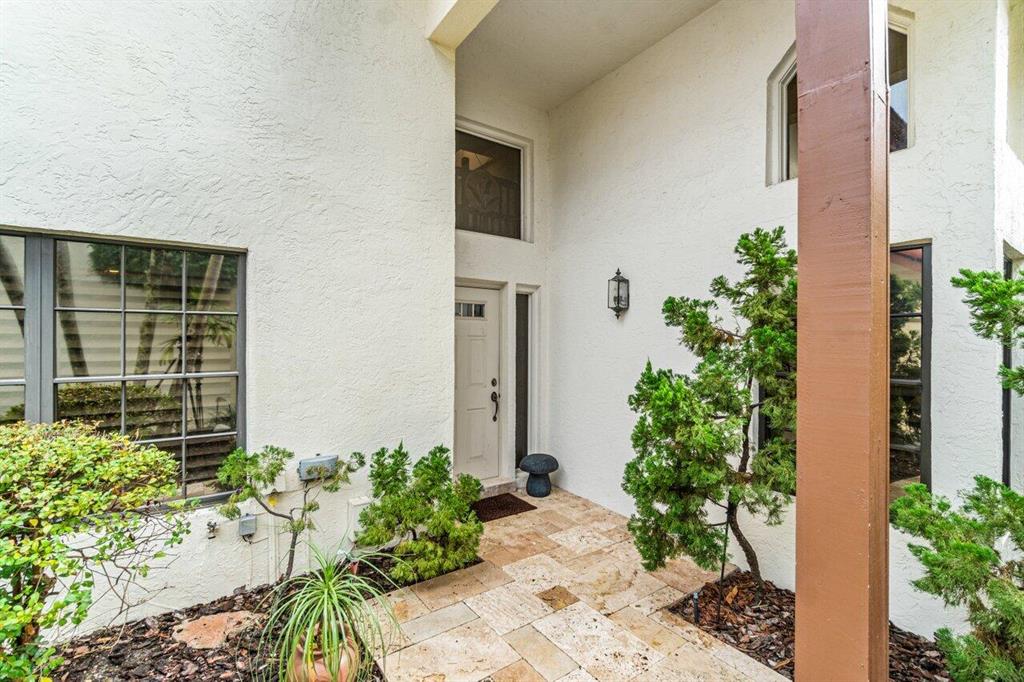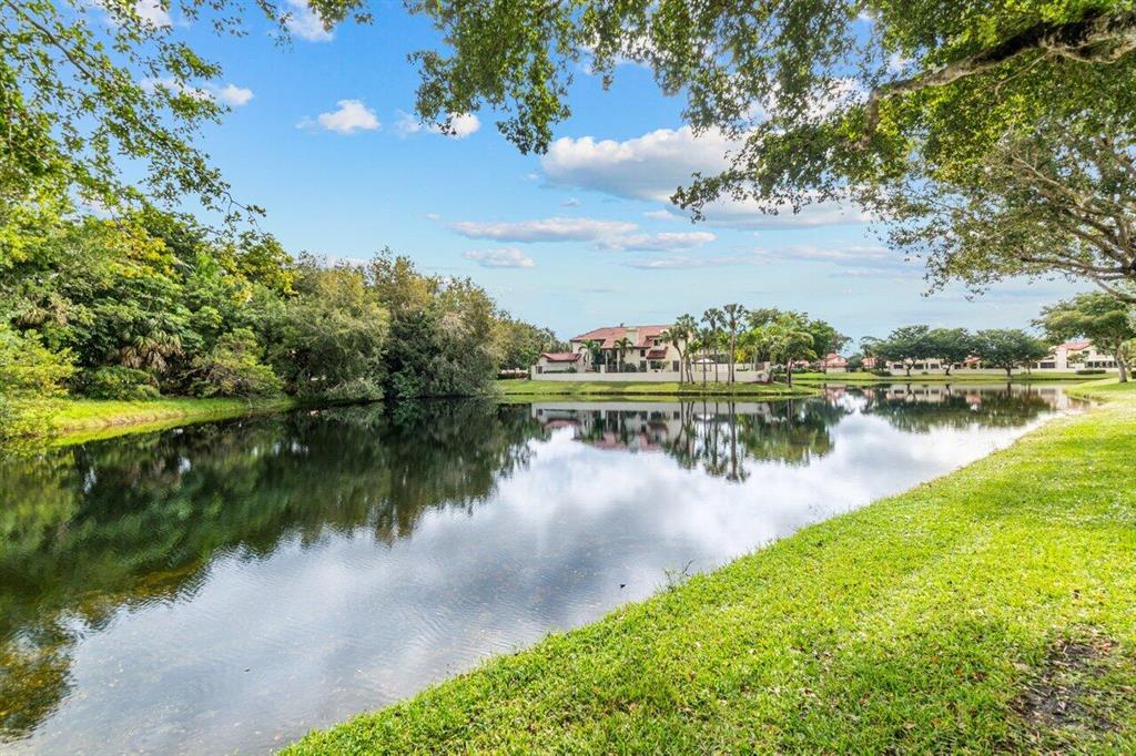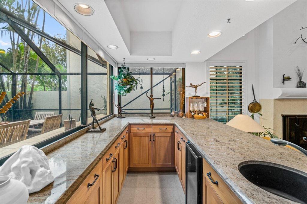 Beautifully updated two story lakefront Dominica model. This 4/3 smartly designed open floorplan boasts soaring ceilings, clerestory windows, smooth Jerusalem stone and Brazilian tiger wood flooring. Formal living room with floor to ceiling fireplace. Beautiful custom kitchen with paneled KitchenAid refrigerator & appliances, pantry w/pullouts, granite tops & backsplash. Step down wine bar opens to living room & patio. Sunny breakfast room & family room overlooking pool/patio. Second floor primary suite offers vaulted ceilings, beautiful bath w/spa tub, separate shower & dual vanities. Peaceful private lakefront setting offers travertine patio, sparkling pool & heated waterfall spa. Perfect for entertaining. Professionally landscaped courtyard with a collection of tropical plants.