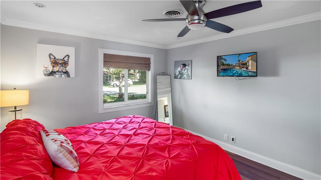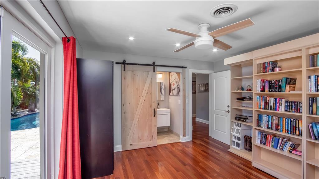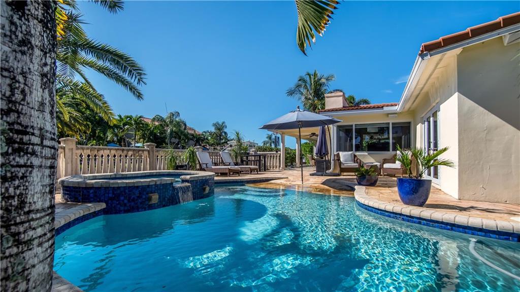 One of a kind private outdoor paradise! South Florida living at it's best: brand new seawall, ocean access with your own boat lift; free form heated kidney shaped pool with hot tub; travertine pavers, built in barbecue; composite wood deck, so many places to relax and entertain in fenced yard. Indoor remodeled to encompass open floor plan for indoor/outdoor living. Hurricane impact window and doors. Open area kitchen with island and workspace, and working fireplace in living area. Real Mahogany hardwood floors throughout with marble floor in kitchen. 3 of the 4 bedrooms have en suite bathrooms that are newly redone. Guest room with built in shelving that opens to Murphy bed, has private deck to relax on. Too much to list - must be seen! No HOA