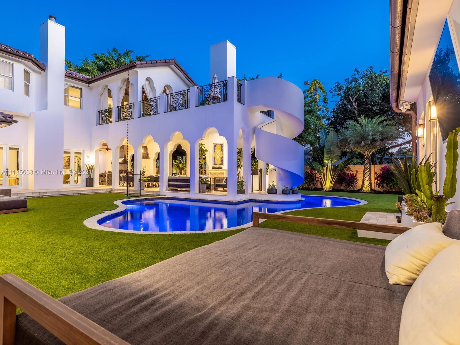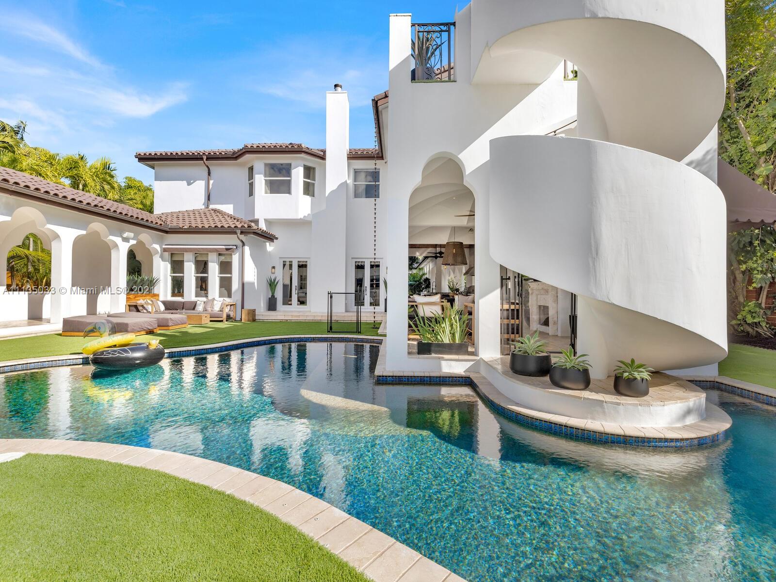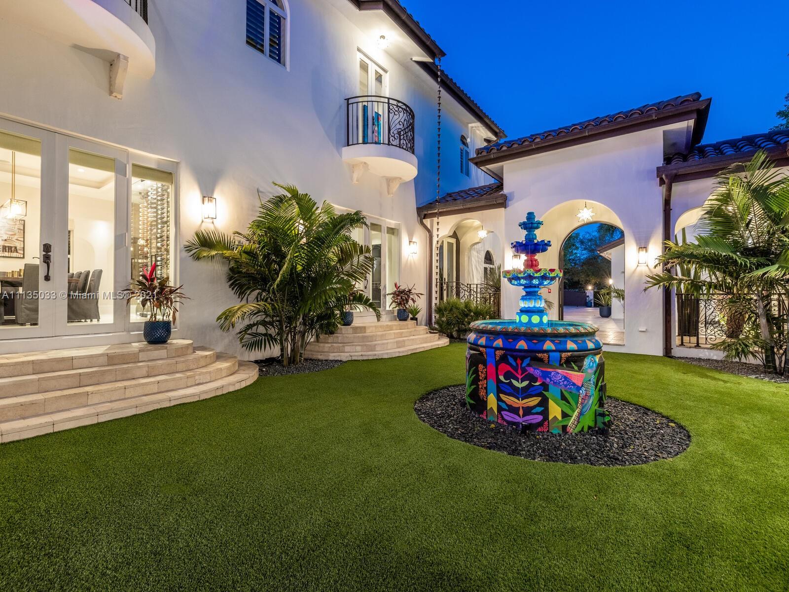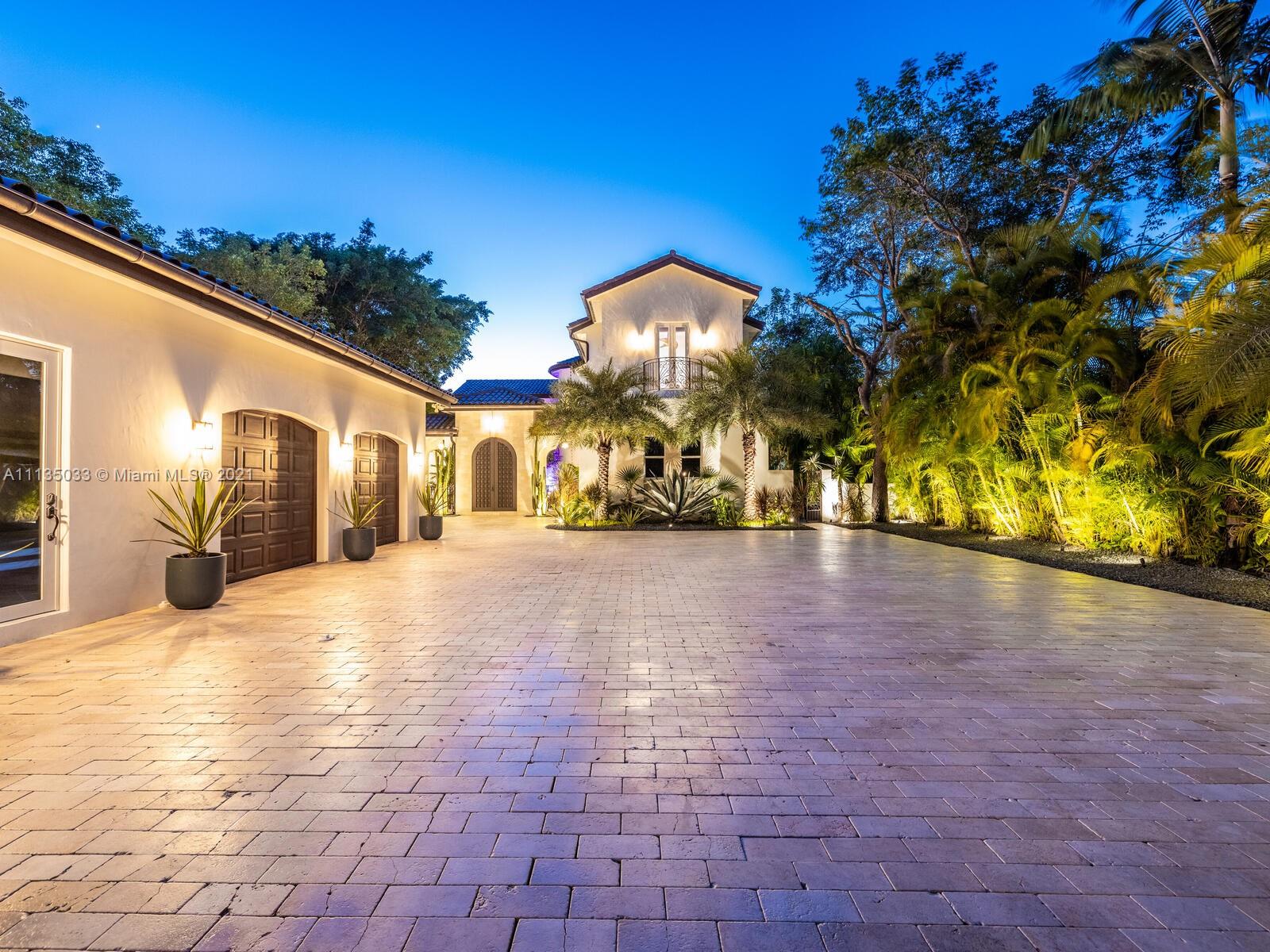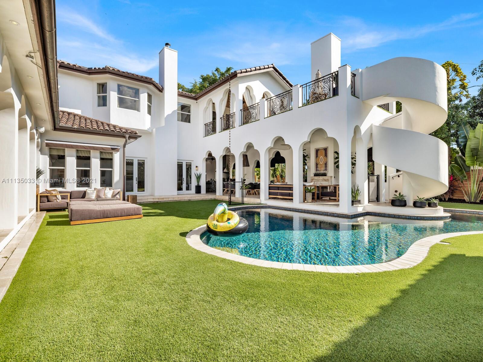 This Modern-Mediterranean resort style home is expertly designed for Miami entertaining, including a 2-bed Guest house! Impressive arrival through oversized doors lead to hacienda inspired courtyard with custom water fountain and koi pond, complete with viewing deck. Highly coveted covered outdoor entertainment area including full outdoor Mia Cuccina kitchen with top appliances. All new lush landscape, premium turf, and light system installation. Spectacular Lagoon style pool curls around stunning outdoor spiral staircase leads to oversized loggia, perfect for sunset viewings. Extensive interior renovation-all new custom designer bathrooms, surround sound movie theatre, wine bottle display, and entertainment bar to name a few. Separate living quarters and plenty of parking.Turn-key estate.