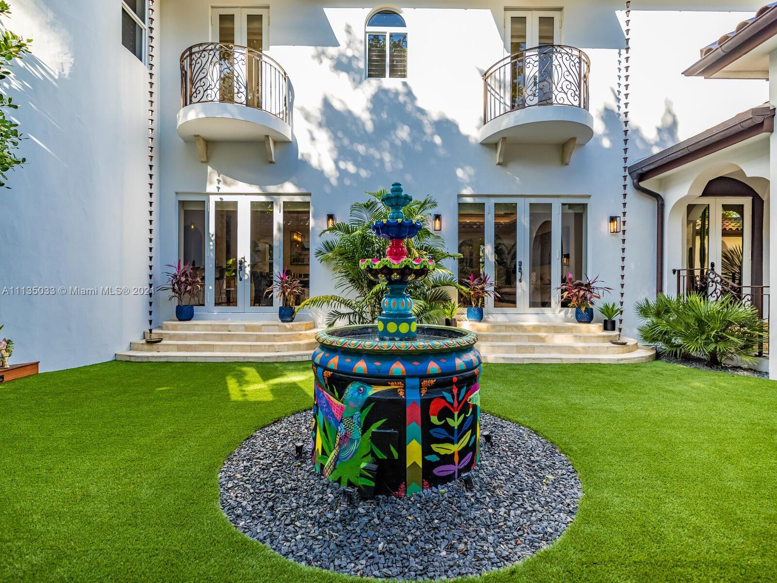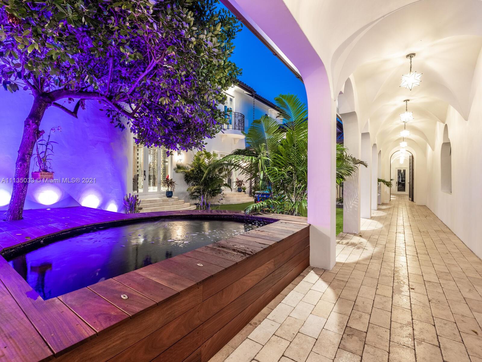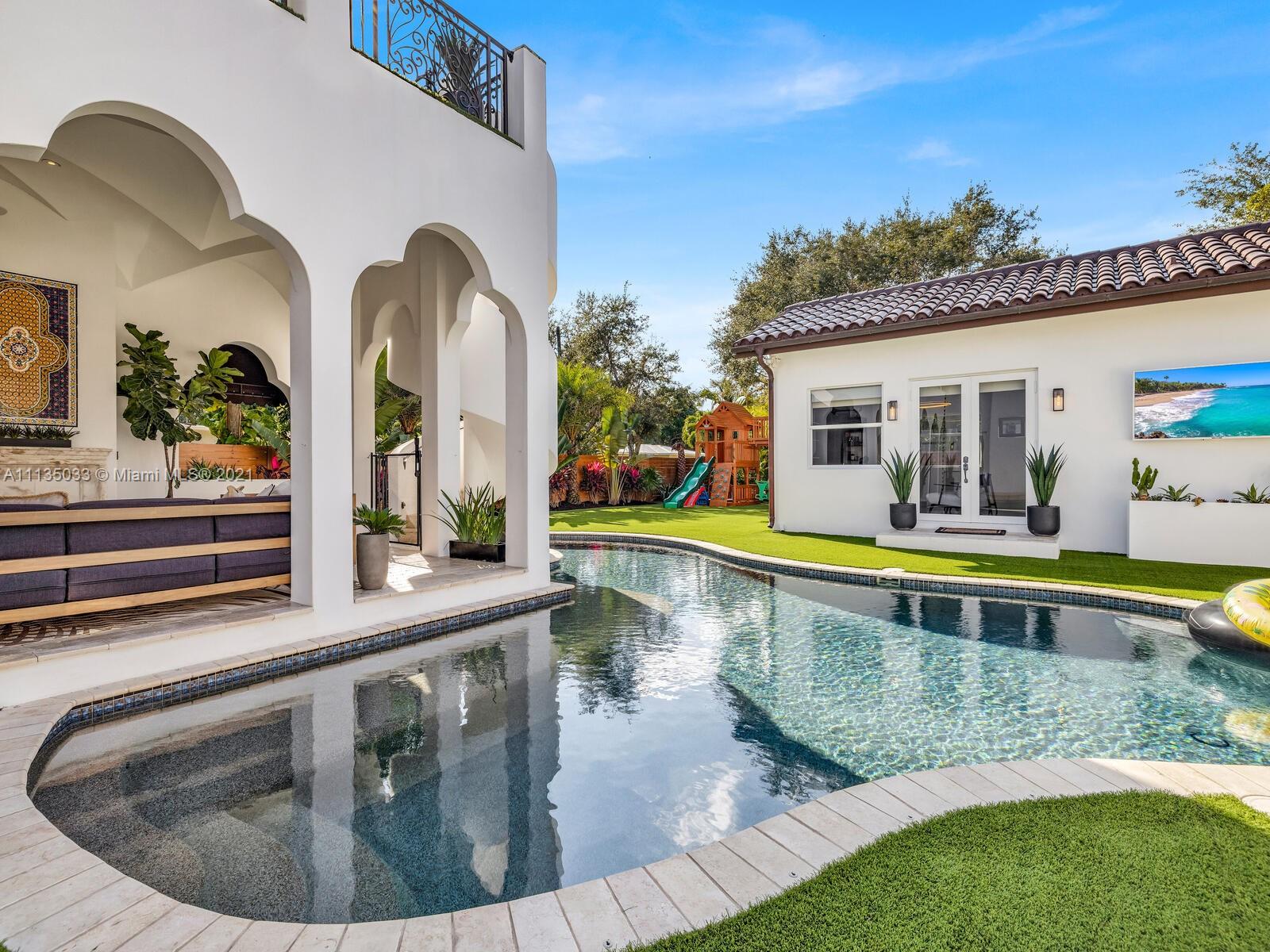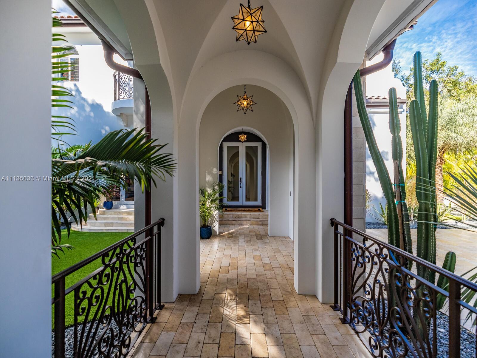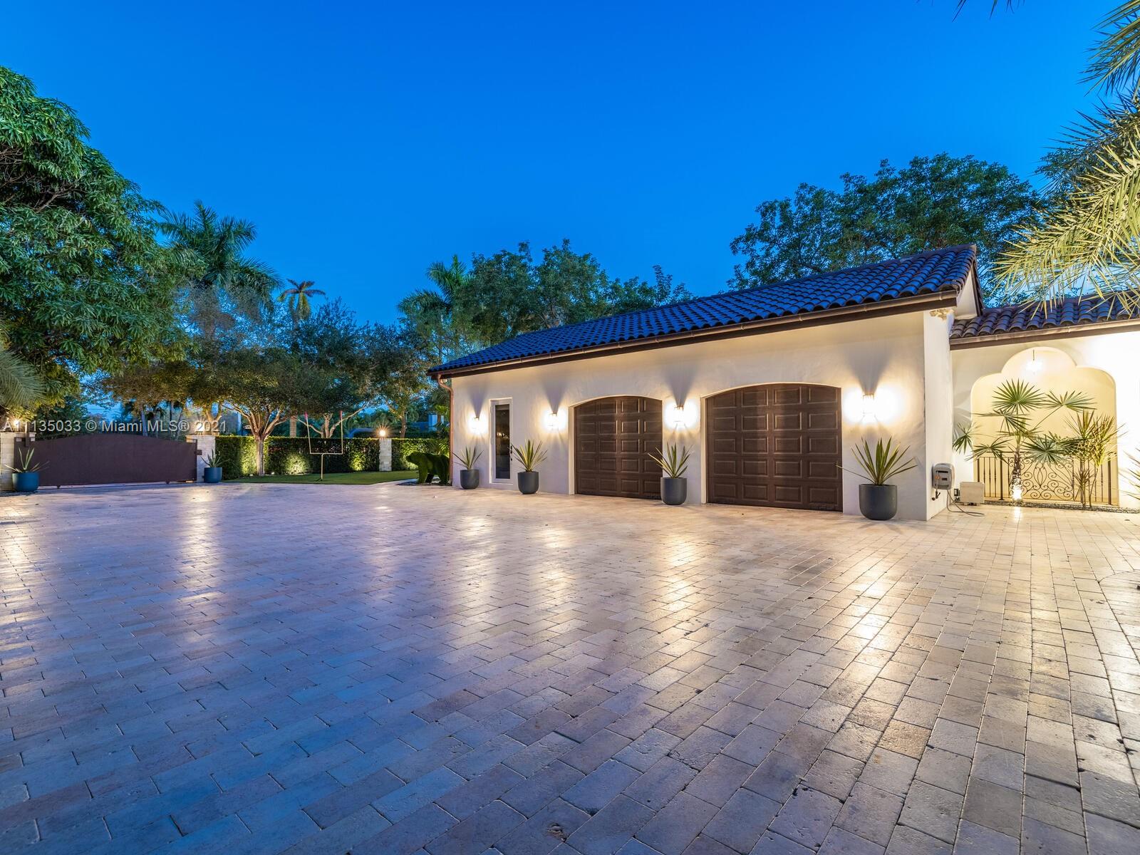 This Modern-Mediterranean resort style home is expertly designed for Miami entertaining, including a 2-bed Guest house! Impressive arrival through oversized doors lead to hacienda inspired courtyard with custom water fountain and koi pond, complete with viewing deck. Highly coveted covered outdoor entertainment area including full outdoor Mia Cuccina kitchen with top appliances. All new lush landscape, premium turf, and light system installation. Spectacular Lagoon style pool curls around stunning outdoor spiral staircase leads to oversized loggia, perfect for sunset viewings. Extensive interior renovation-all new custom designer bathrooms, surround sound movie theatre, wine bottle display, and entertainment bar to name a few. Separate living quarters and plenty of parking.Turn-key estate.