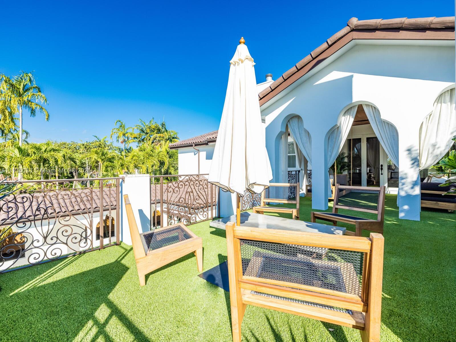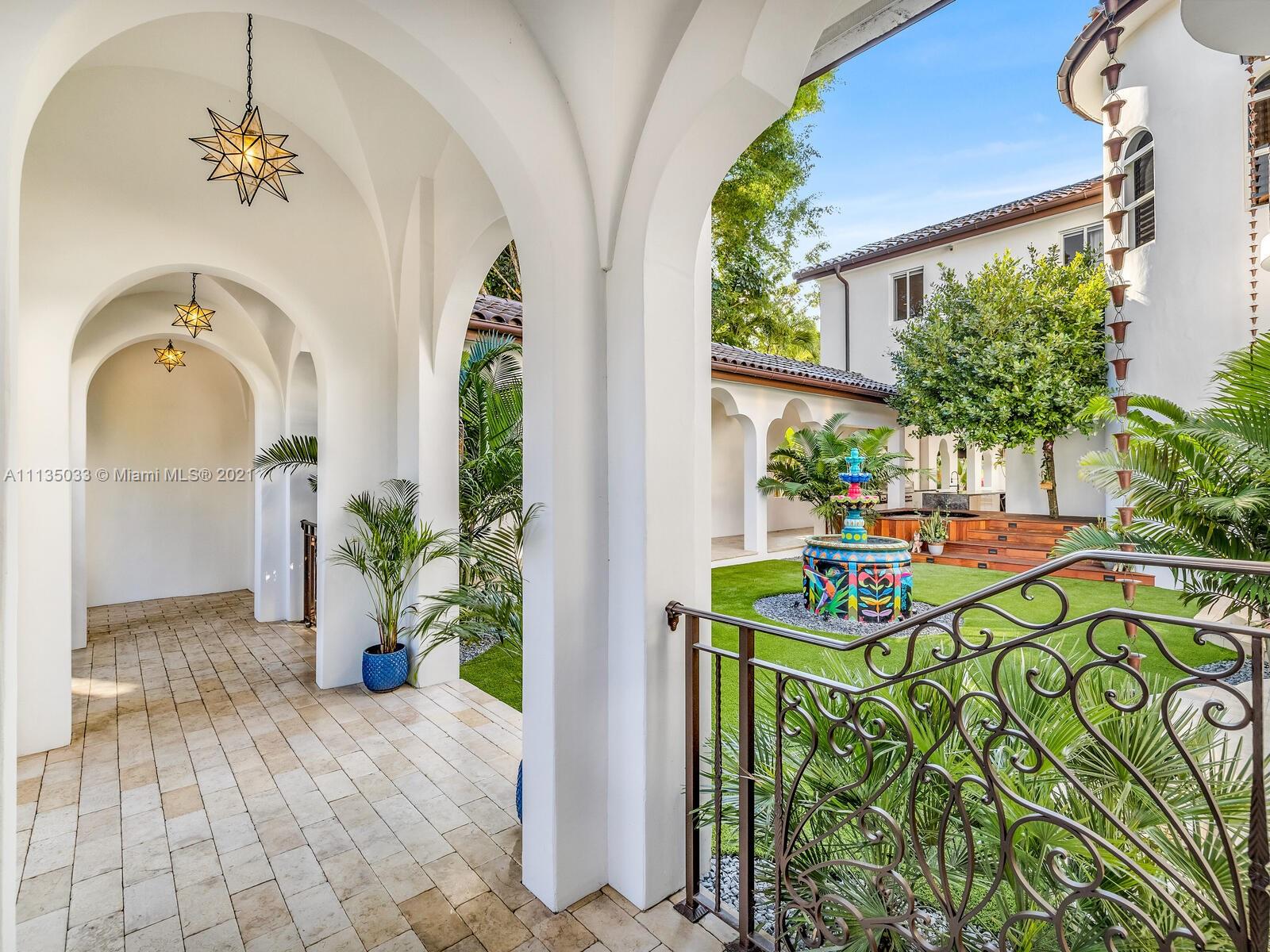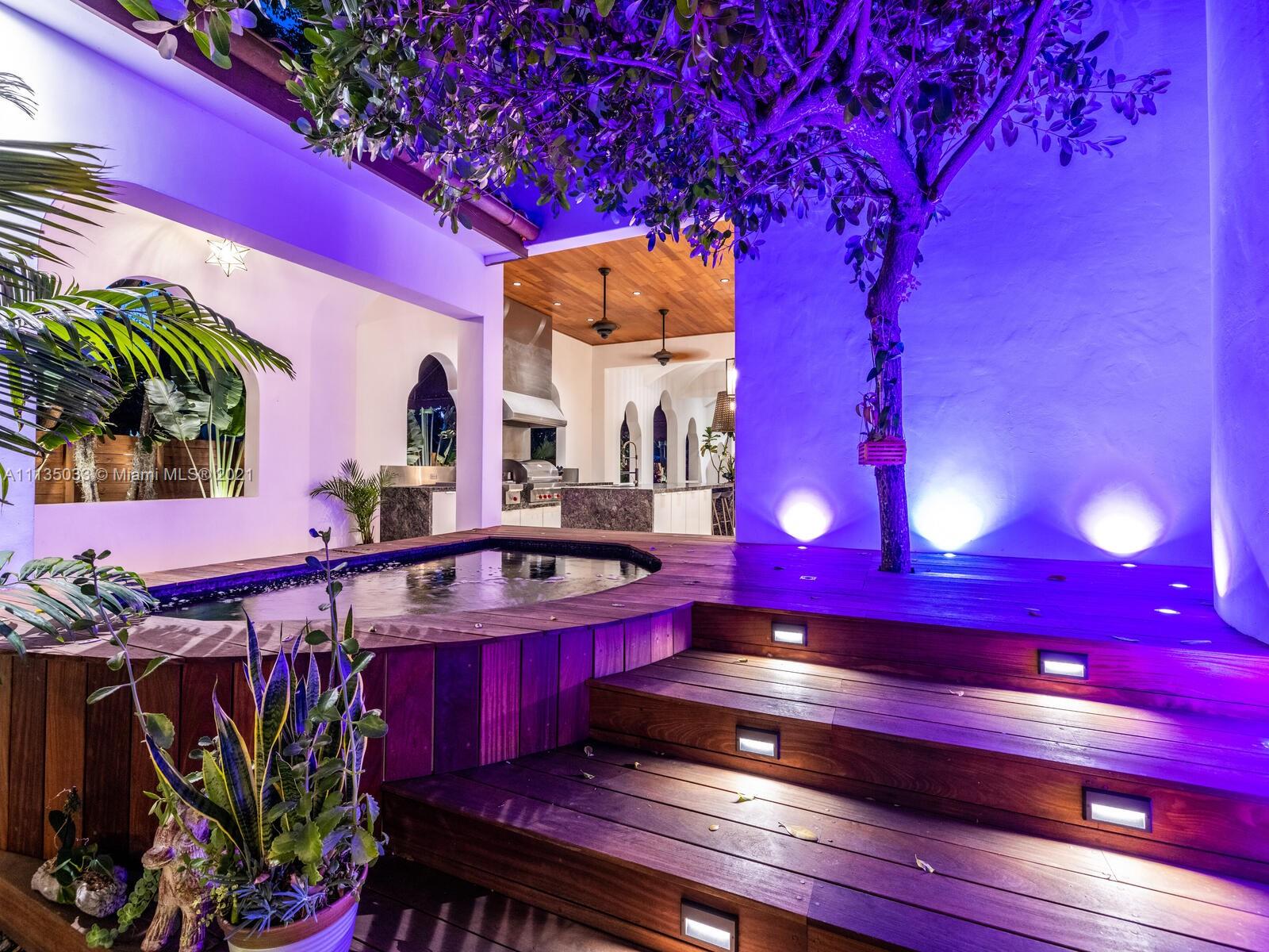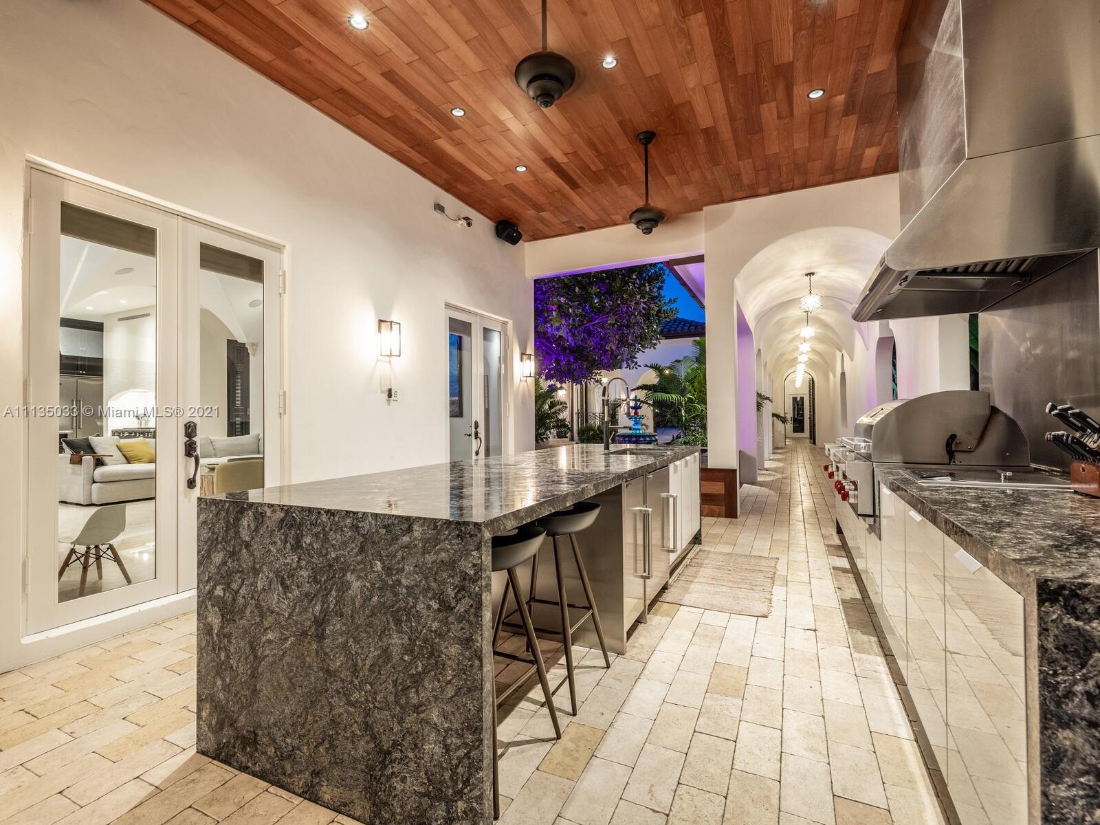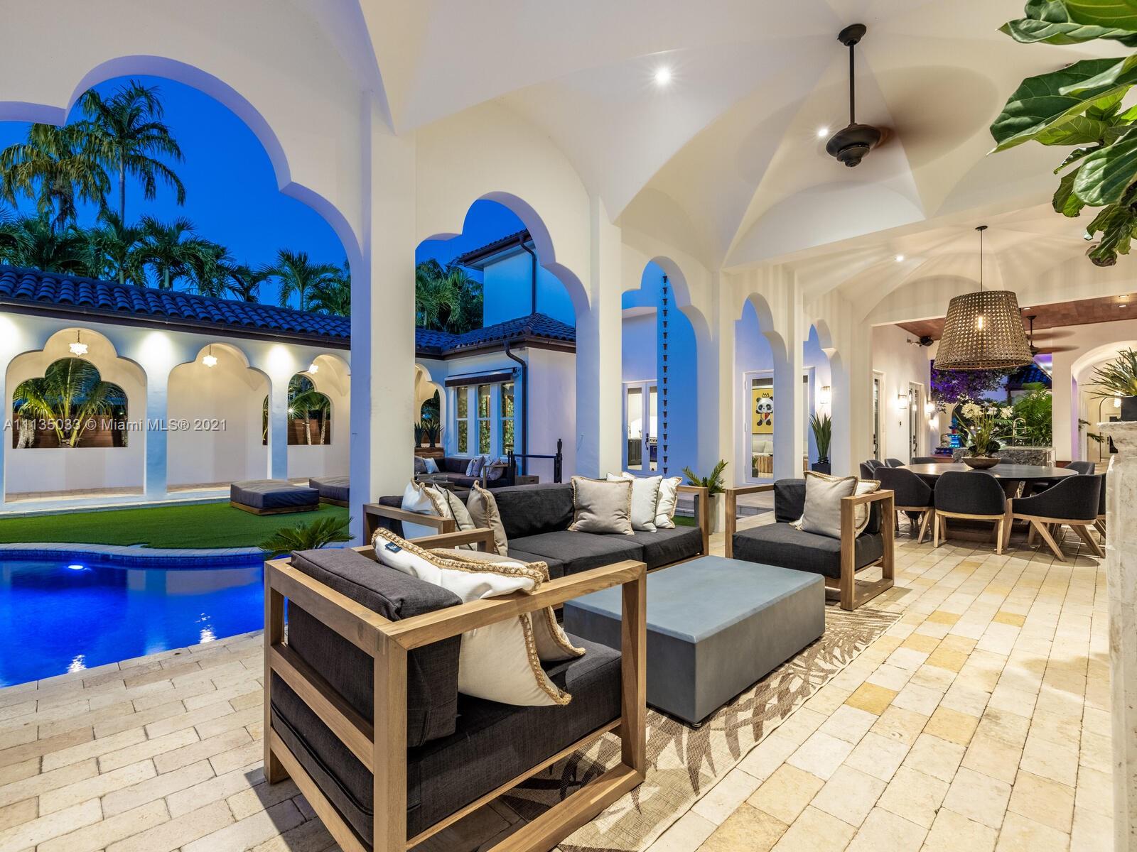 This Modern-Mediterranean resort style home is expertly designed for Miami entertaining, including a 2-bed Guest house! Impressive arrival through oversized doors lead to hacienda inspired courtyard with custom water fountain and koi pond, complete with viewing deck. Highly coveted covered outdoor entertainment area including full outdoor Mia Cuccina kitchen with top appliances. All new lush landscape, premium turf, and light system installation. Spectacular Lagoon style pool curls around stunning outdoor spiral staircase leads to oversized loggia, perfect for sunset viewings. Extensive interior renovation-all new custom designer bathrooms, surround sound movie theatre, wine bottle display, and entertainment bar to name a few. Separate living quarters and plenty of parking.Turn-key estate.