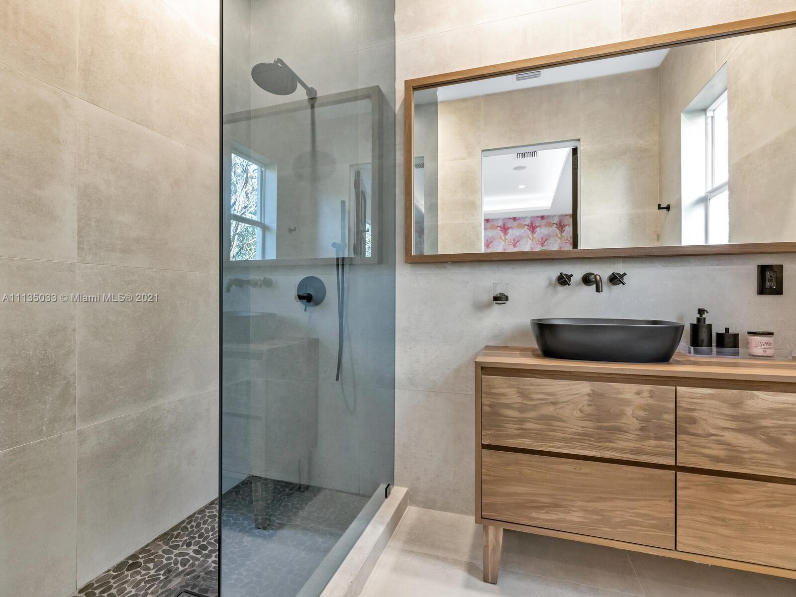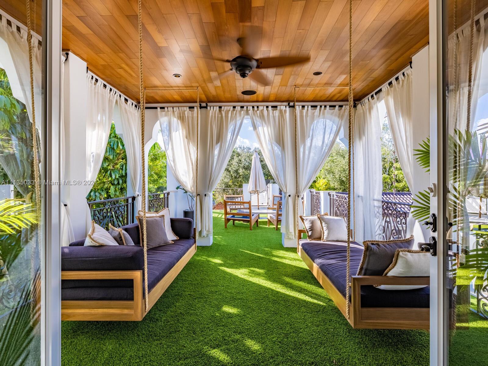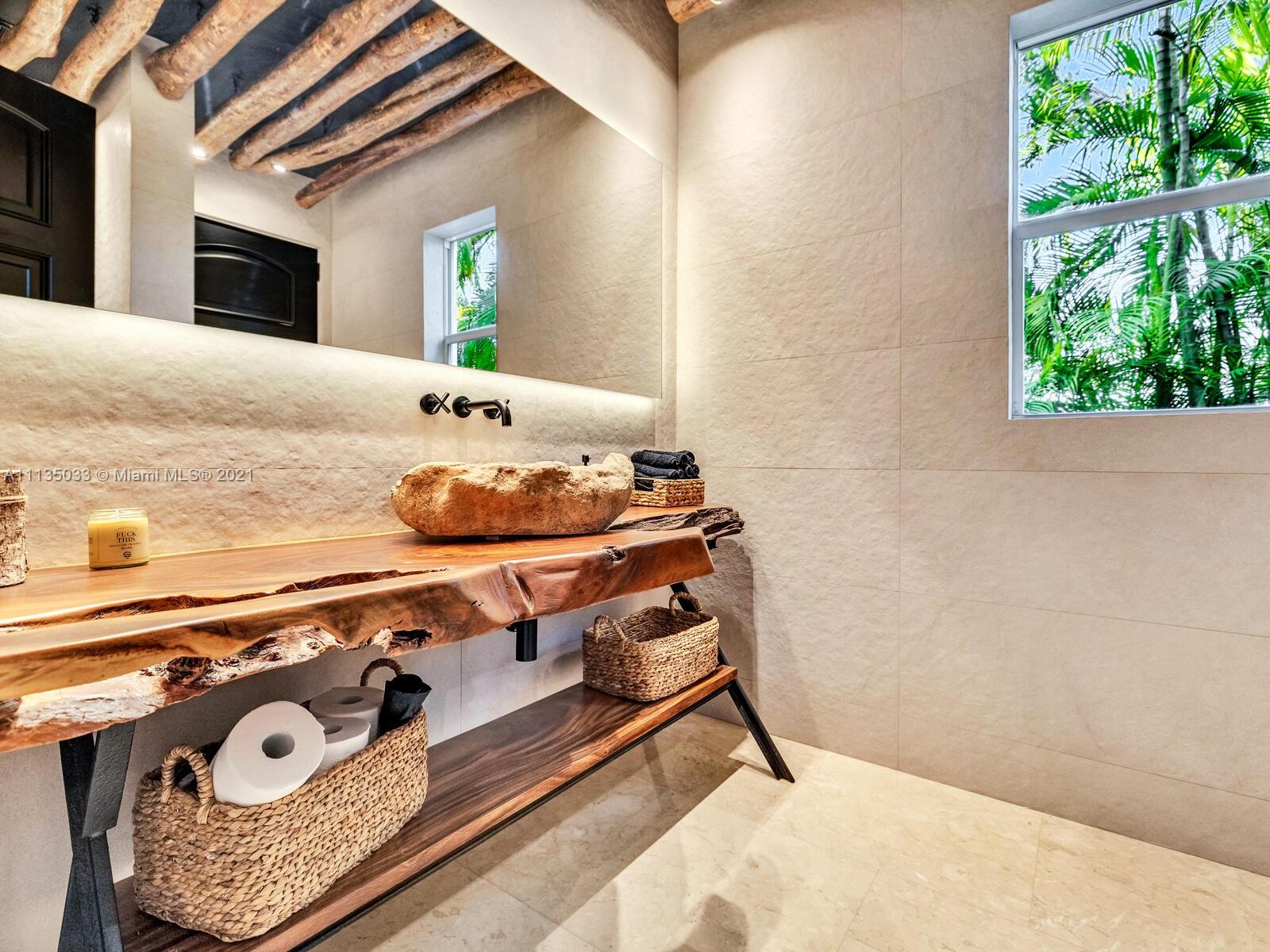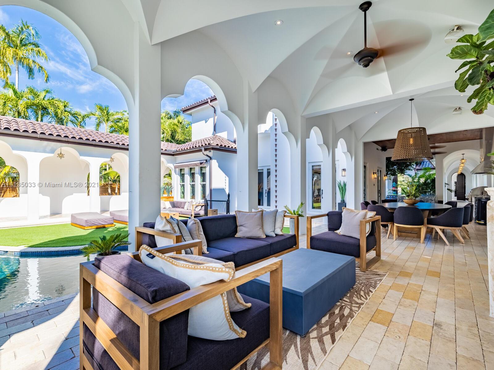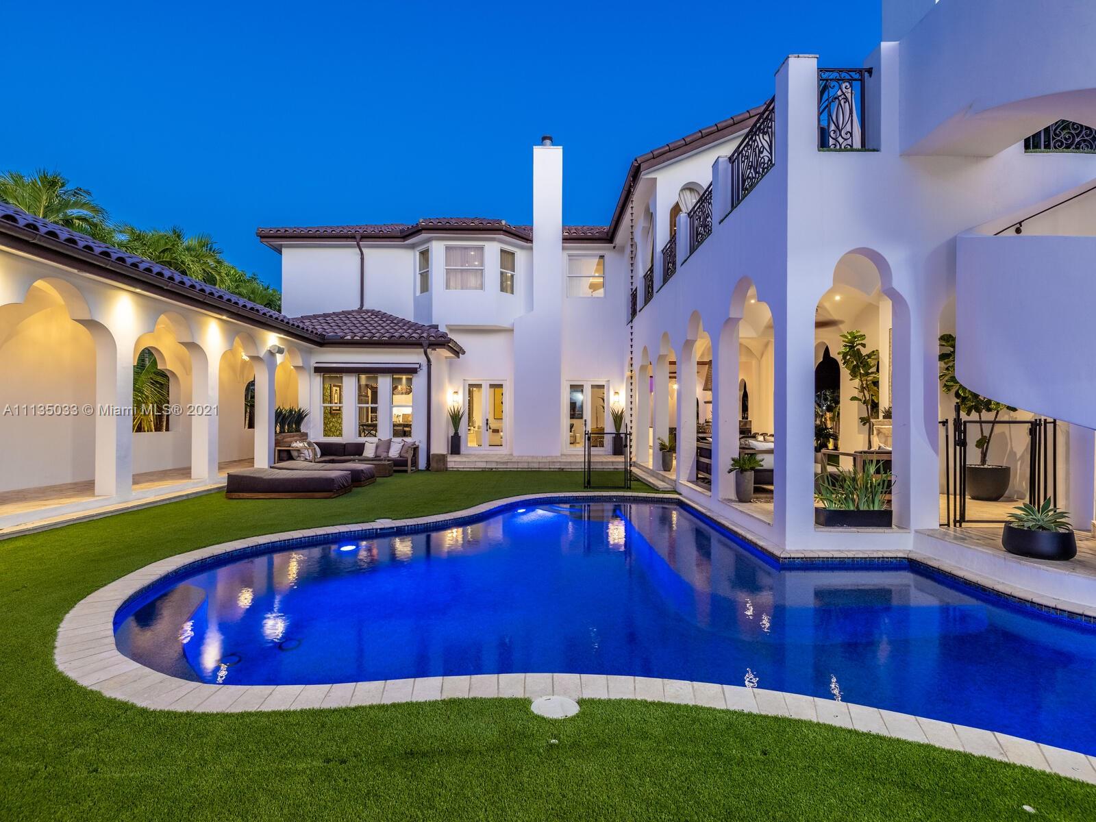 This Modern-Mediterranean resort style home is expertly designed for Miami entertaining, including a 2-bed Guest house! Impressive arrival through oversized doors lead to hacienda inspired courtyard with custom water fountain and koi pond, complete with viewing deck. Highly coveted covered outdoor entertainment area including full outdoor Mia Cuccina kitchen with top appliances. All new lush landscape, premium turf, and light system installation. Spectacular Lagoon style pool curls around stunning outdoor spiral staircase leads to oversized loggia, perfect for sunset viewings. Extensive interior renovation-all new custom designer bathrooms, surround sound movie theatre, wine bottle display, and entertainment bar to name a few. Separate living quarters and plenty of parking.Turn-key estate.