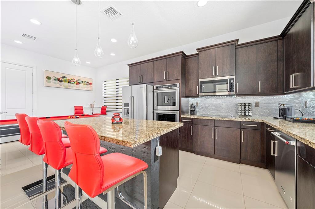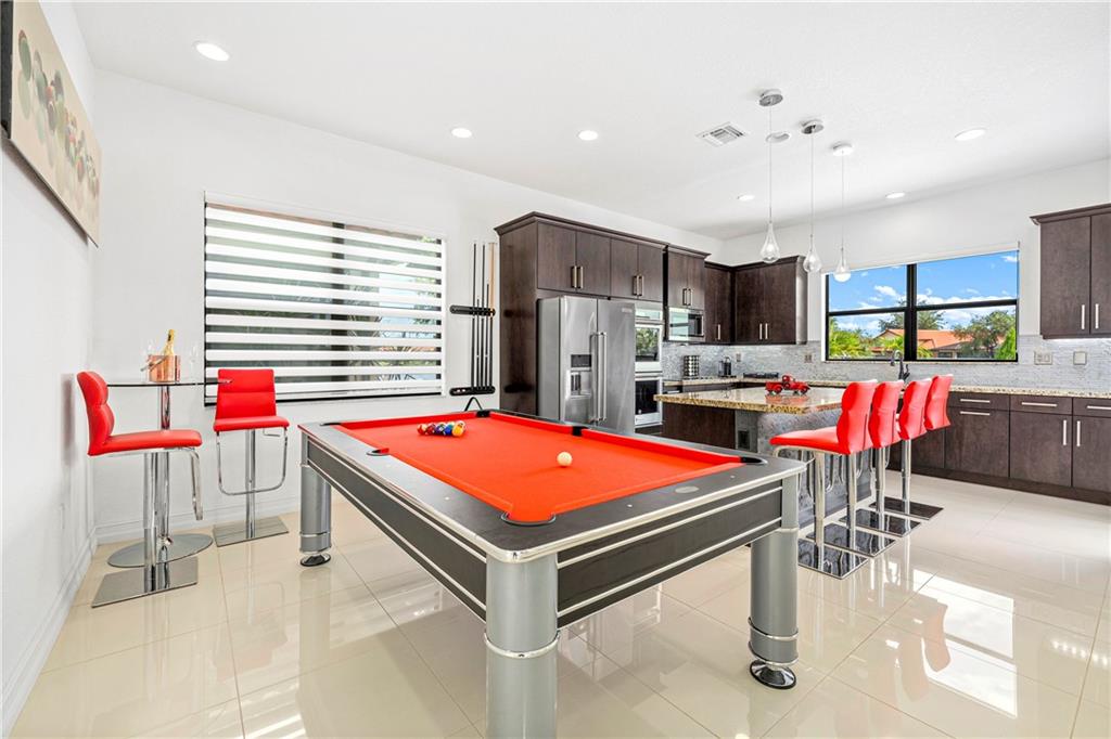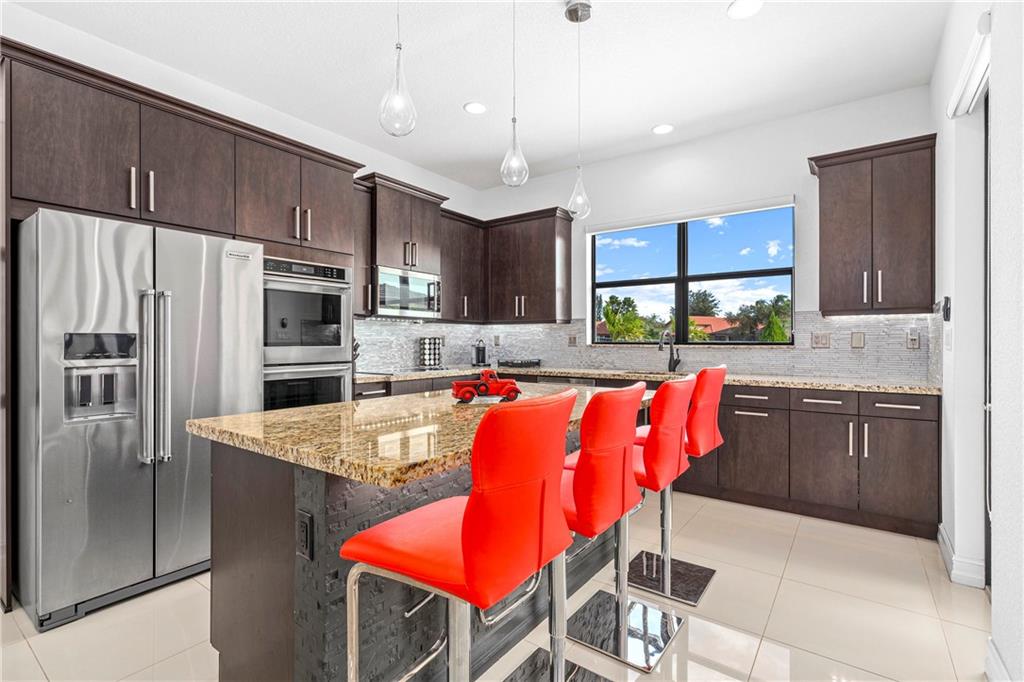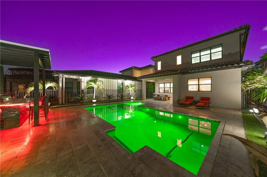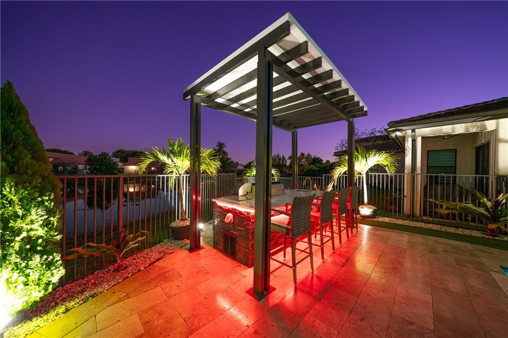 The ultimate tropical retreat, this light-filled lakefront residence is built to impress. The 4 bed, 2.5 bath home plus office offers a perfectly appointed open concept with high ceilings and pristine interiors. Patio overlooking the water is designed to enjoy outdoor living featuring a heated saltwater pool with sun ledge, covered terrace, and summer kitchen with a gas grill for entertaining. Indoors, a gourmet kitchen showcases top-of-the-line appliances, granite countertops, and a large island with a breakfast bar. The expansive master bedroom offers his and hers walk-in closet and master bath with dual-sinks and soaking tub. Fully equipped two-car garage with golf cart included. Experience gated privacy and luxury community amenities including 24-hour security,