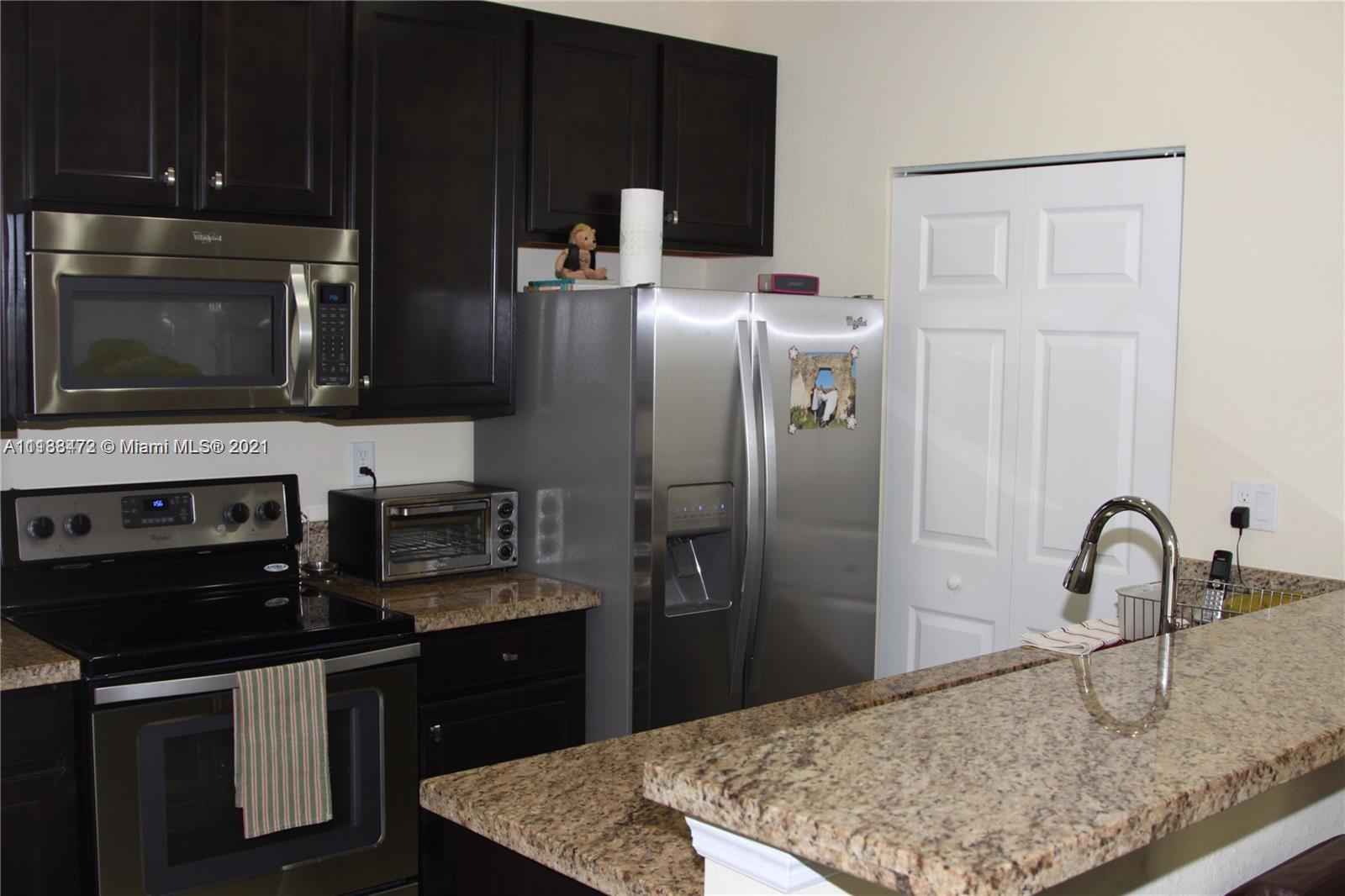Gorgeous 3 bedrooms 3 full baths and a 2 car garage, two-story Townhouse in the Gated Community at Cobblestone. High ceilings, open concept living & dining room, one bedroom in a full bath on the first floor, granite kitchen countertops with all stainless steel appliances, pantry, impact glass windows, Plantations Shutters in all windows. Wood floors downstairs, carpets on the 2nd floor, and ceramic floor in all bathrooms. Two bedrooms upstairs with walking closets, balcony, and a den that can be converted as office/family room. This is a very centrally located community close to I75, Pembroke Garden Mall, and many shopping centers and restaurants.