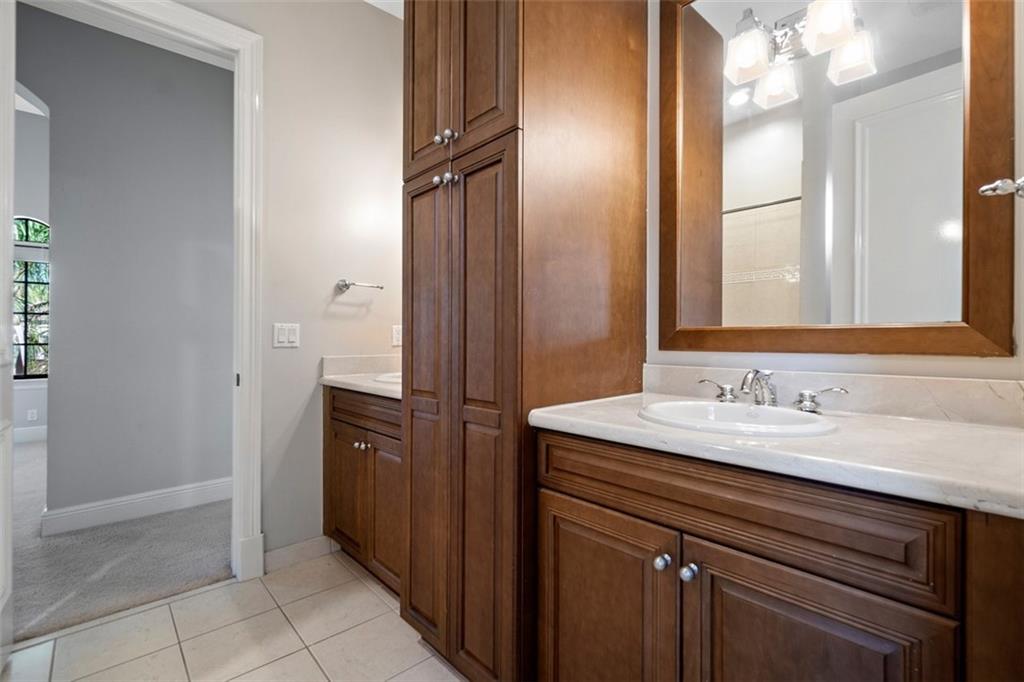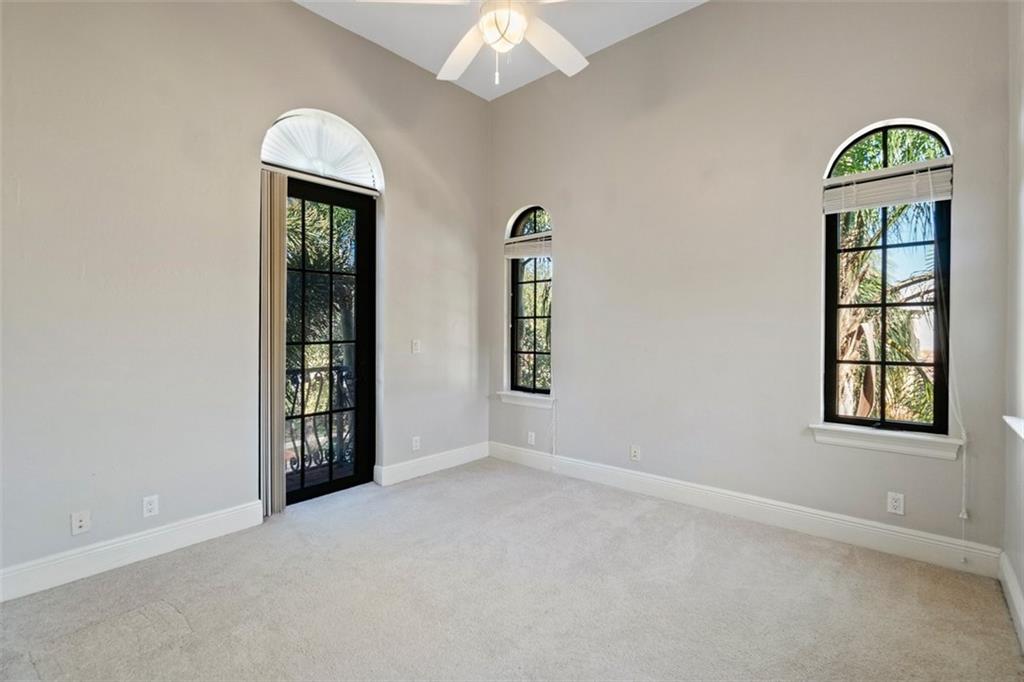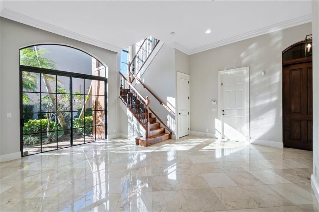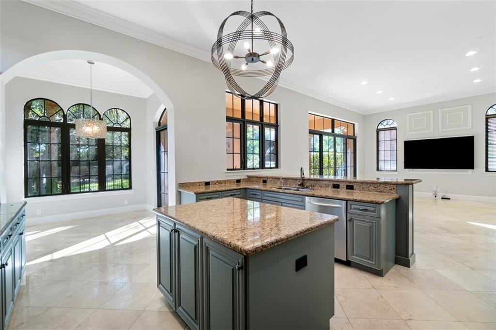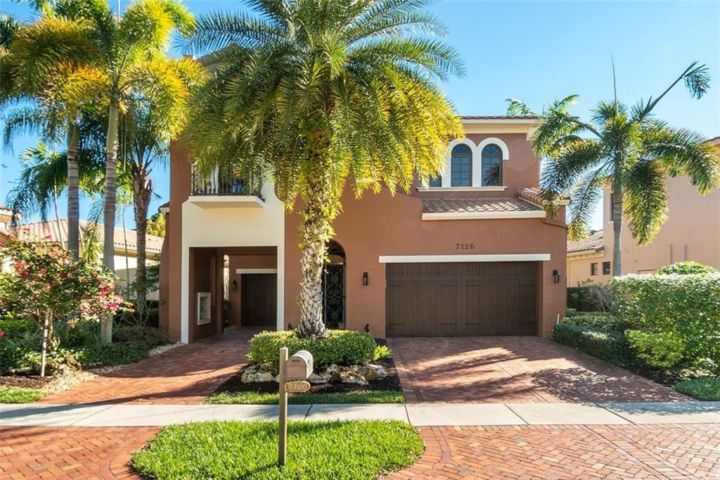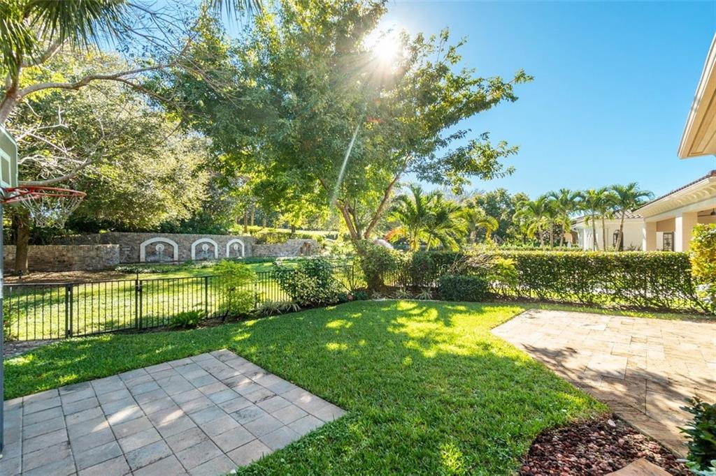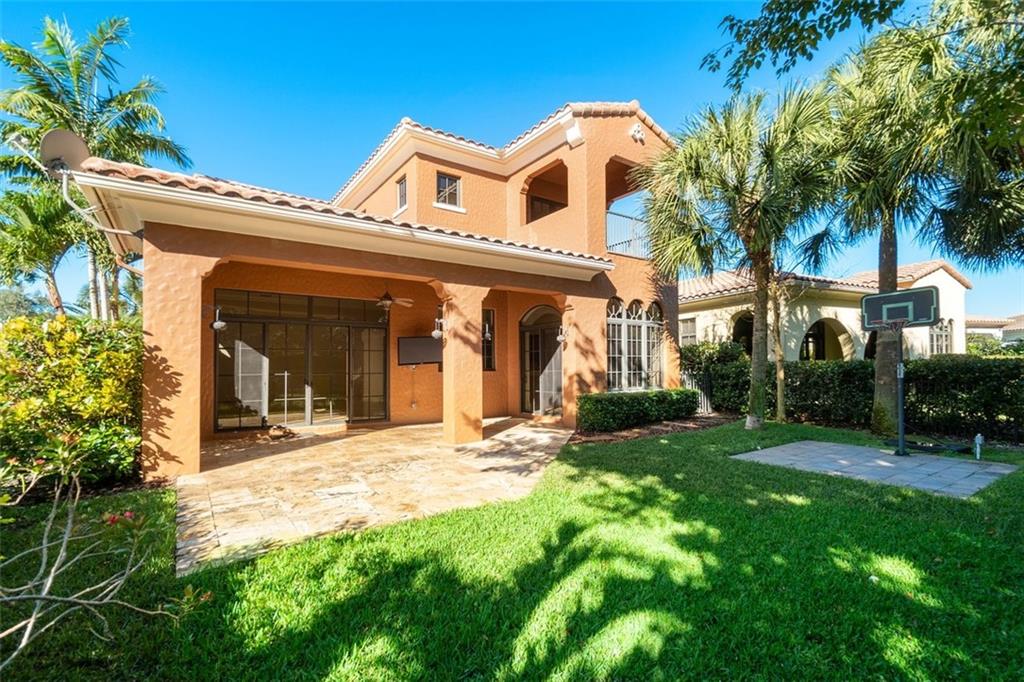 This beautiful home with 5 bedrooms + den is sited on a lot backing up to serene & lighted water features. Captivating curb appeal with wrought iron gates, courtyard/motor court with fireplace, balcony, arches & manicured landscape. Sun-Drenched formal living areas with walls of glass doors leading to intimate outdoor living areas & gardens. Large family room/kitchen area features a spacious island kitchen with painted wood cabinetry, double oven, granite & a sunny breakfast room surrounded by glorious windows. Luxurious Owner's suite with spa-like bathroom & balcony overlooking the backyard & waterfalls. An impressive staircase, soaring ceilings & walls of windows add to the home's splendor. Other offerings: 1st-floor guest suite, large backyard with room for a pool & impact windows/doors