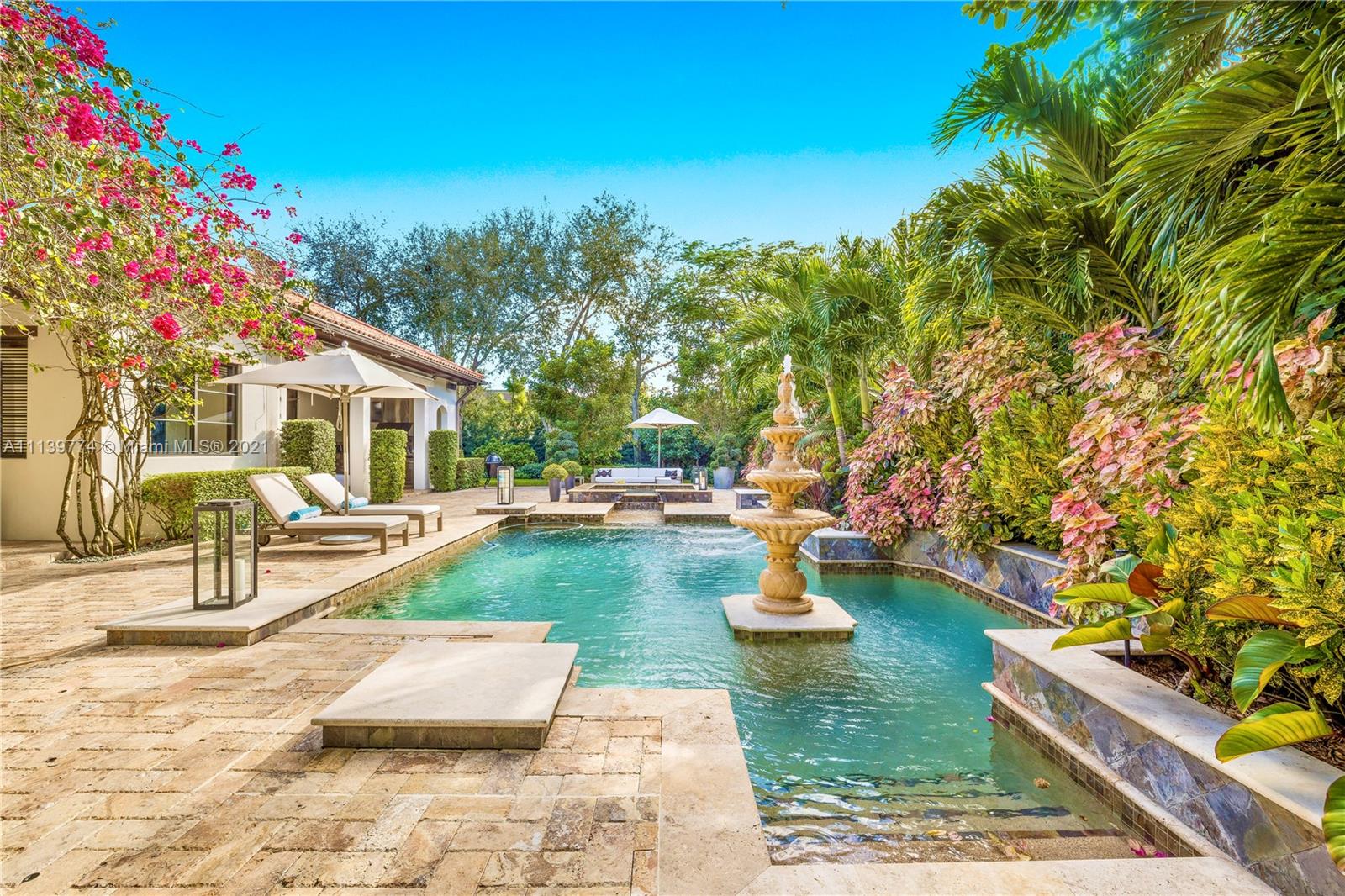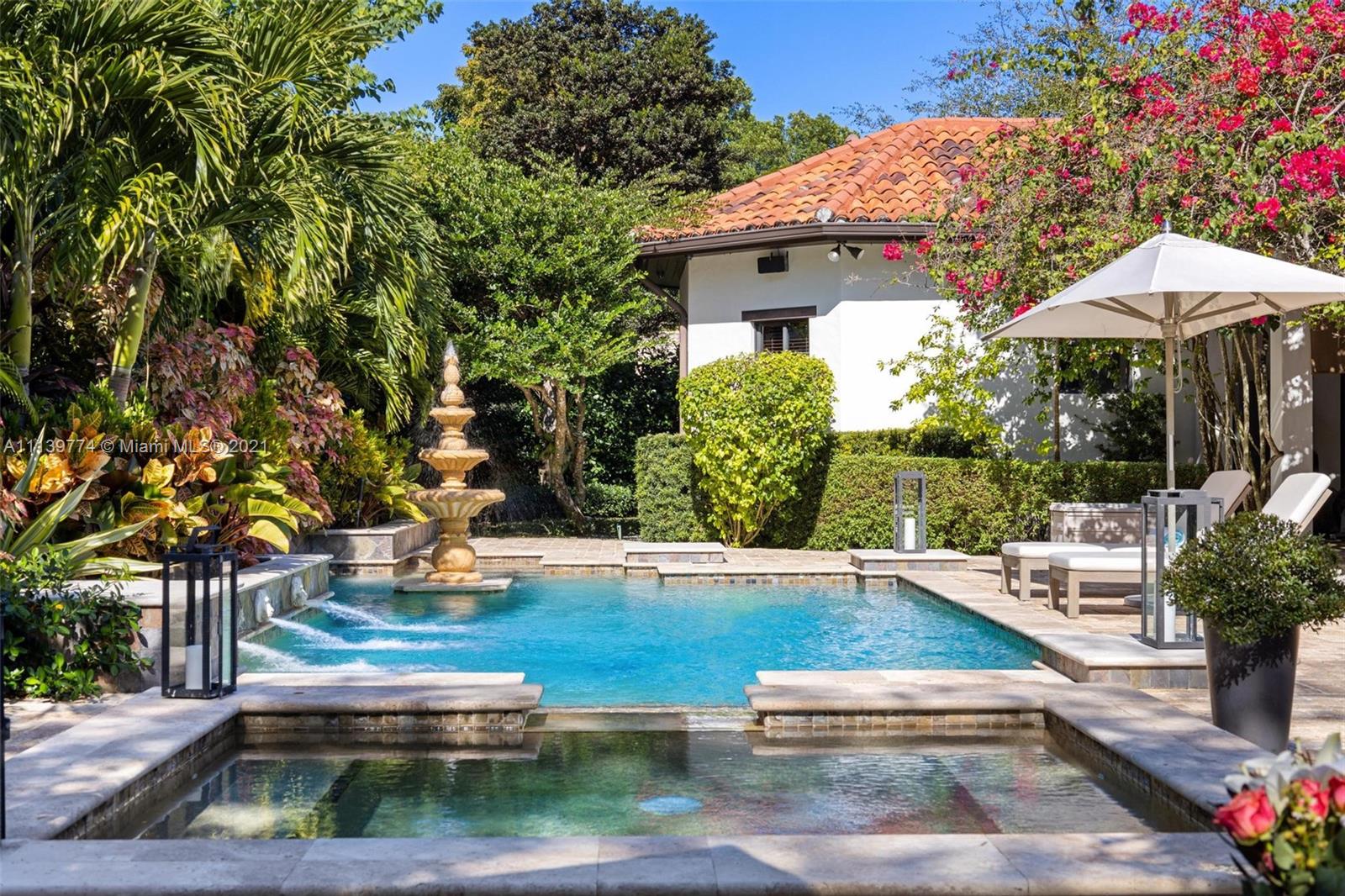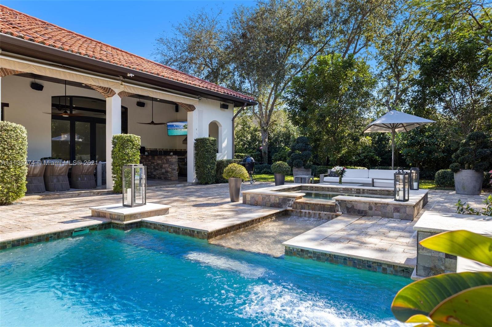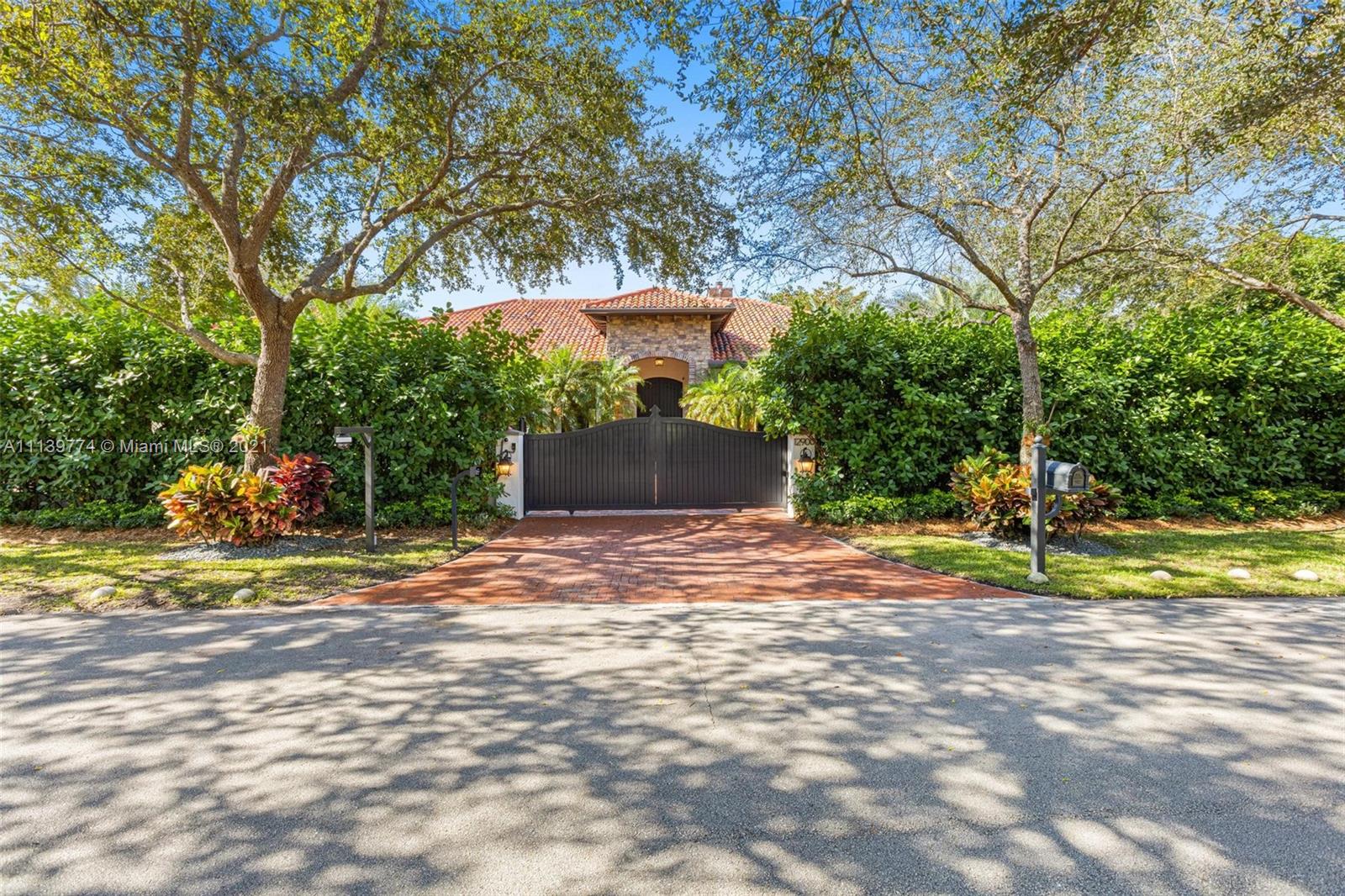 Welcome to your perfect Pinecrest sanctuary! This beautifully updated 1-story Mediterranean home is surrounded by lush tropical landscaping that creates a private & secure oasis in one of Miami's most coveted neighborhoods. Soaring ceilings, high impact windows & an expansive floor plan allow for plenty of natural light throughout the home. The romantic backyard features a heated salt water pool with lion head fountains, hot tub, summer kitchen with gas grill & a covered loggia for outdoor dining. Outdoor automatic sun shades & mosquito repellent system provide optimal comfort. Advanced $125k Smart Home system with 31 security cameras, 24-speaker Sonos Surround system & 1000 gallon full home generator. A+ rated school district & kid friendly neighborhood!