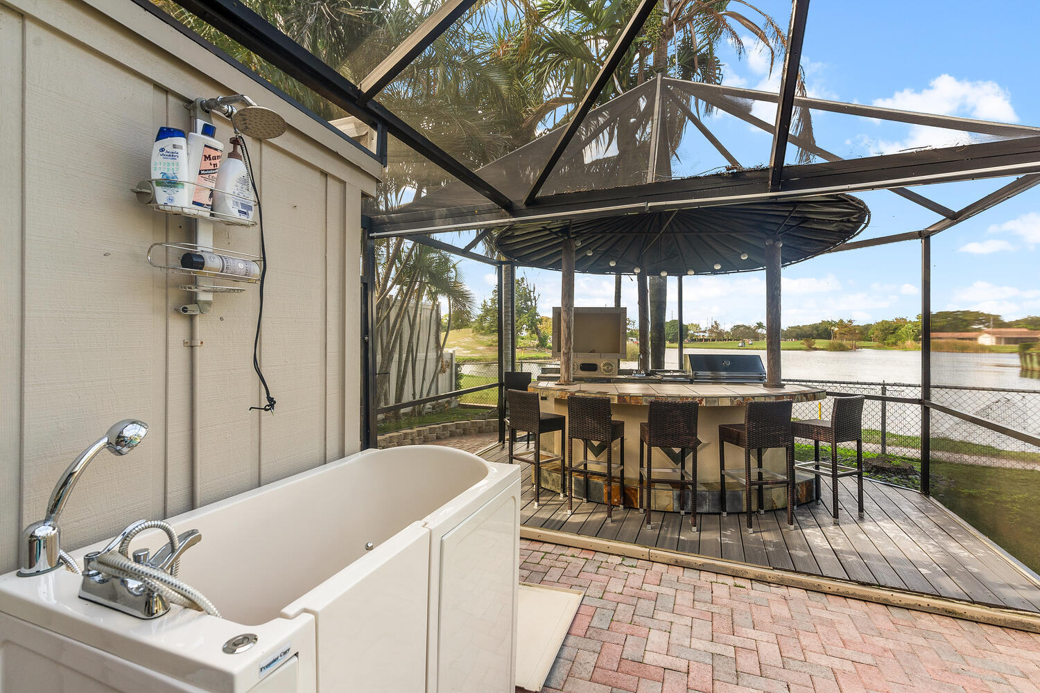 Do not miss this opportunity! Stunning 3 bedroom, 2.5 bathroom home with the most amazing golf course and wide lake views, heated pool and therapeutic spa, plus a den/office. This home has it all! Features include marble flooring throughout, updated kitchen, coffered ceilings, fireplace, impact windows and doors, solar panels for electric, solar water heater, new pool heater, newer roof (2018), screened enclosure with summer kitchen, turf grass, custom built-ins in garage, and much more. This property over $200k in upgrades and the best lot in the entire community.