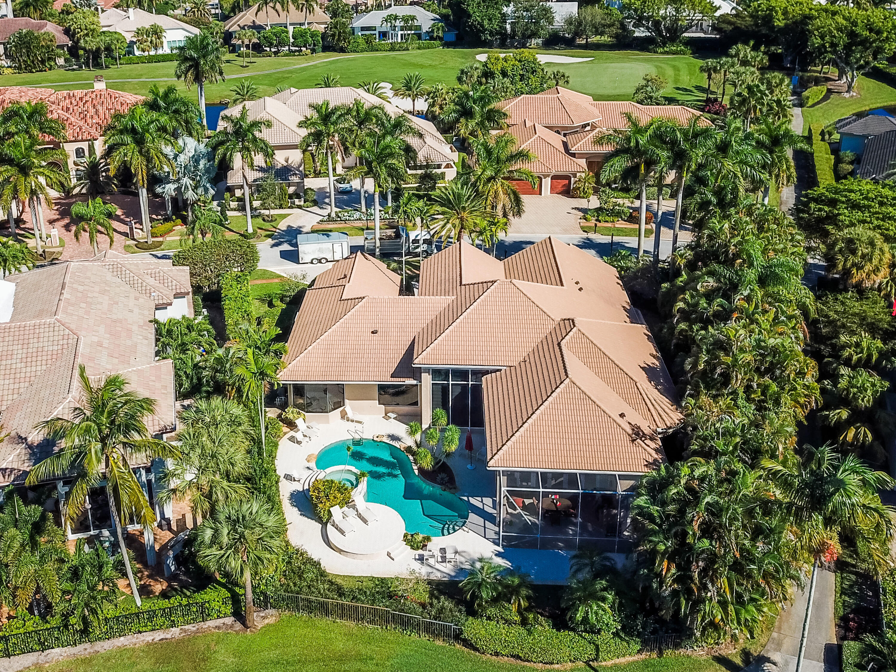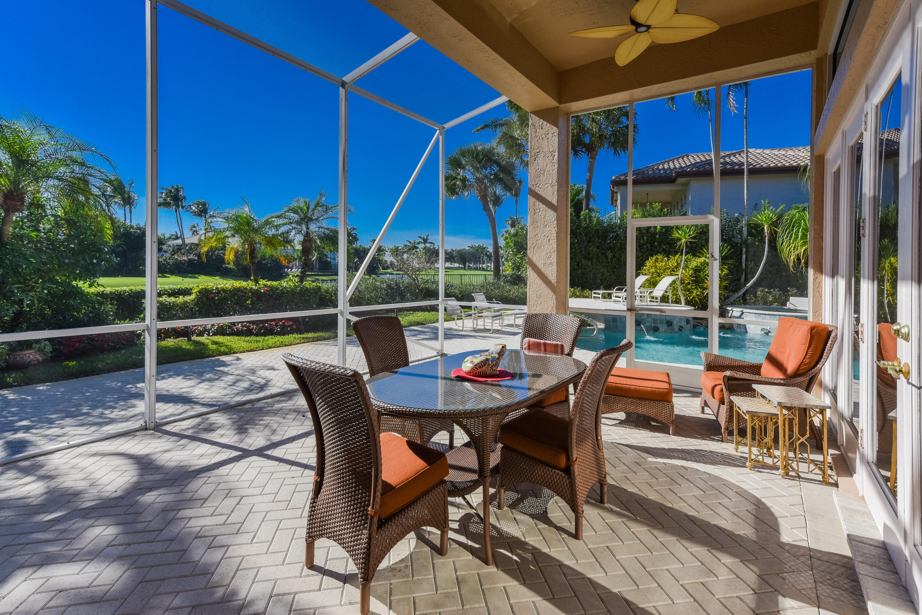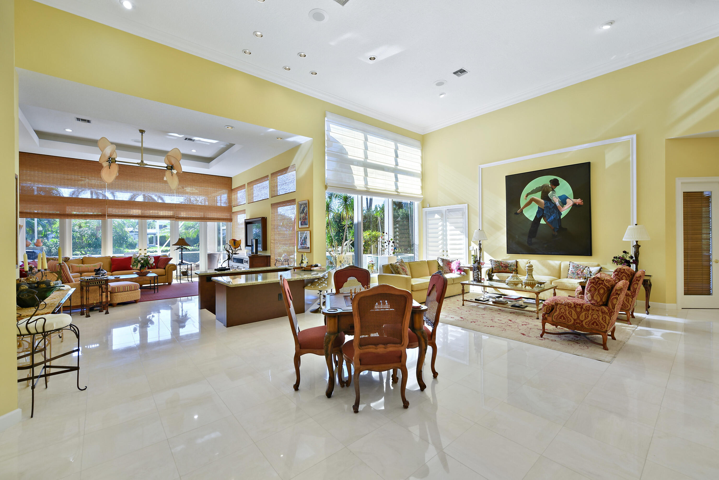 Spacious open concept including living room, dining room, family room and kitchen with breakfast area overlooking pool, entertainment area and lake and golf course views.Large primary suite with generous closets and luxurious marble bath.. Two additional ensuite bedrooms and wood paneled office.The information herein is deemed reliable and subject to errors, omissions and changes without notice. All measurements are approximate.