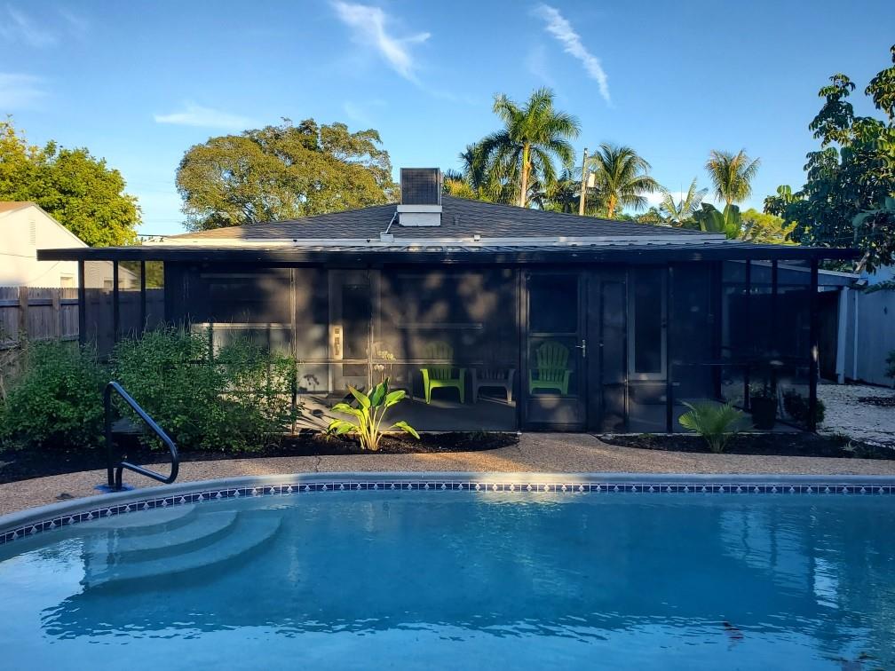Perfect for AirBnB or home to entertain! Airy and Bright! Move in ready! Upgraded 2/2 with a sun room. Separate space has a laundry room with a brand new full sized stackable washer and dryer and office space. Open living room extends towards the kitchen and dining area. The refrigerator is new. Primary bedroom has an attached bathroom with a spa tub with jets and LED changing lights that also opens onto the screened porch. Second bedroom is large and the bathroom has been redone. Large pool home with a well manicured and private yard, new landscaping and resort style feel. Roof is 2019, AC newer, newer hot water heater, new toilet in second bath, partial sewer pipe replacement and extra clean out box installed, city permitted full aluminum storm shutters - brand new.