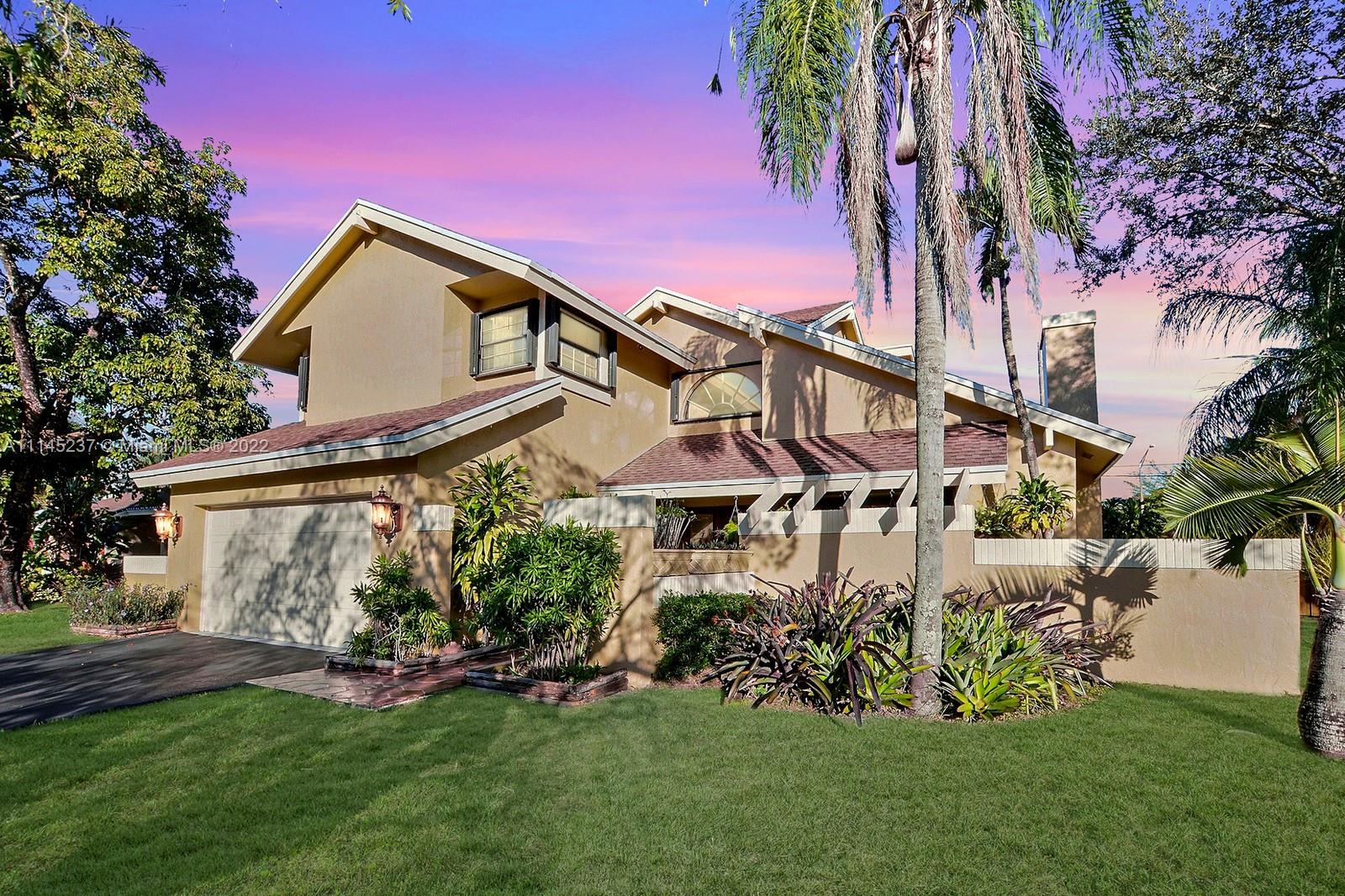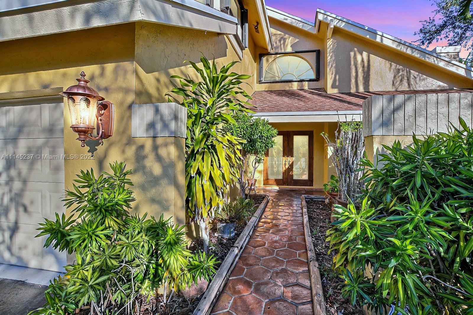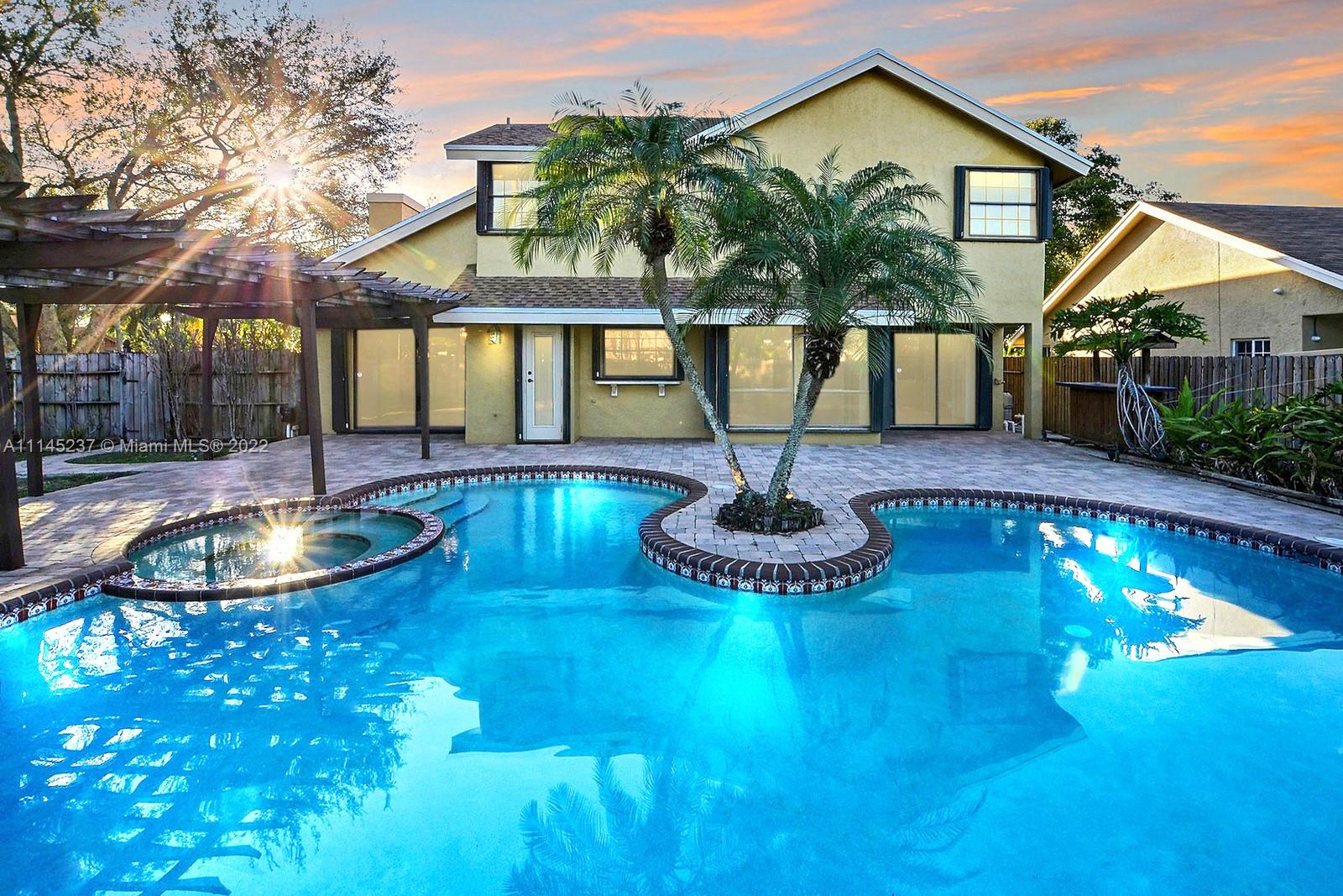 THIS BEAUTIFUL 3 BED + LOFT, 3 BATH HOME SITS ON A PREMIUM CORNER LOT IN THE SOUGHT AFTER TREE LINED COMMUNITY OF COUNTRY ADDRESS. FRENCH STAINED GLASS DOUBLE DOORS LEAD YOU INTO AN OPEN VAULTED CEILINGS, ROMANTIC WOOD BURNING FIREPLACE & PLENTY OF NATURAL. LOFT CAN BE TURNED INTO A 4TH BEDROOM AND DOWNSTAIRS CABANA BATH IS A TRUE FULL BATH. PRIMARY SUITE FEATURES DOUBLE SINK VANITY, UNIQUELY TILED ENCLOSED TUB AND SPACIOUS WALK IN CLOSET. GORGEOUS REAL-WOOD FLOORS. BACKYARD IS A TRUE OASIS WITH POOL AND SPA, LUSH LANDSCAPING, BEAUTIFULLY TILED PATIO, BUNGALOW AND BAR AREA. ACCORDION SHUTTERS, AND 2 CAR GARAGE. ACCESS TO COUNTY ADDRESS PARK, TREE TOPS PARK, COOPER CITY SCHOOL DISTRICT AND PLENTY OF AMAZING SHOPS AND RESTAURANTS.