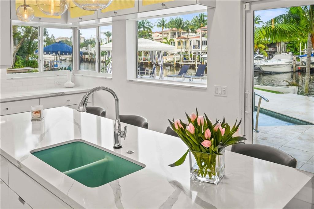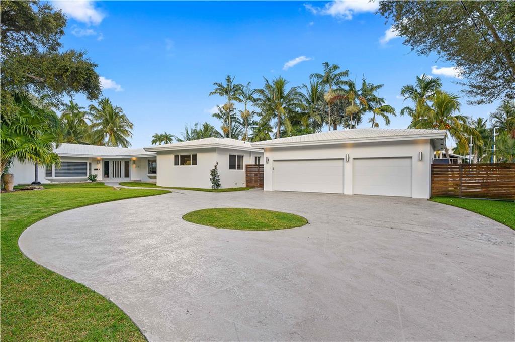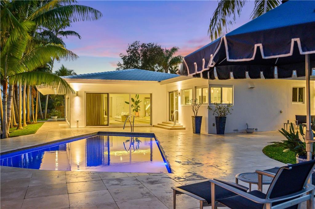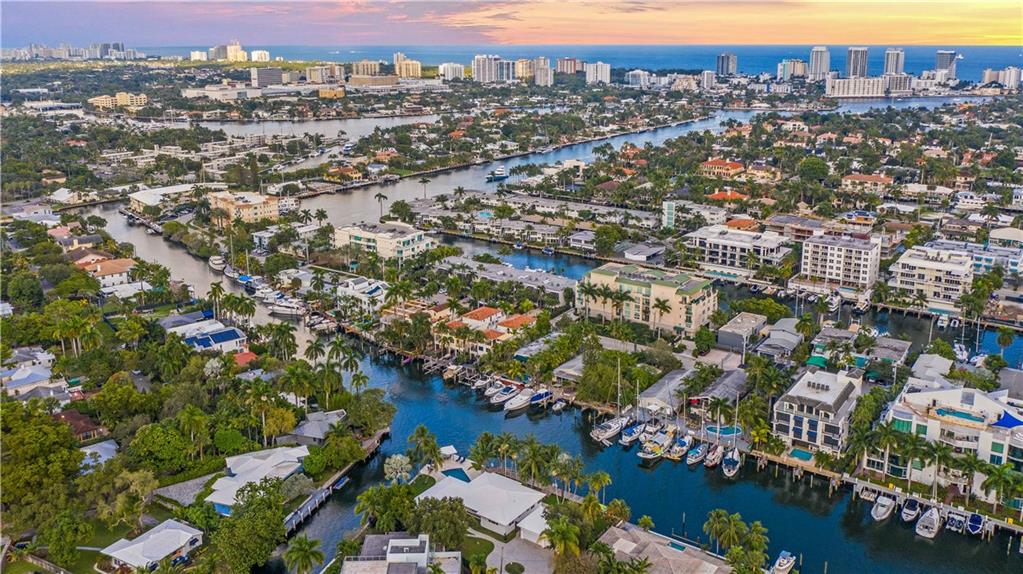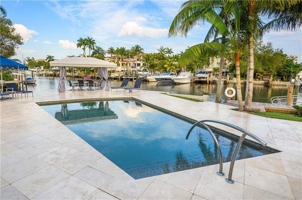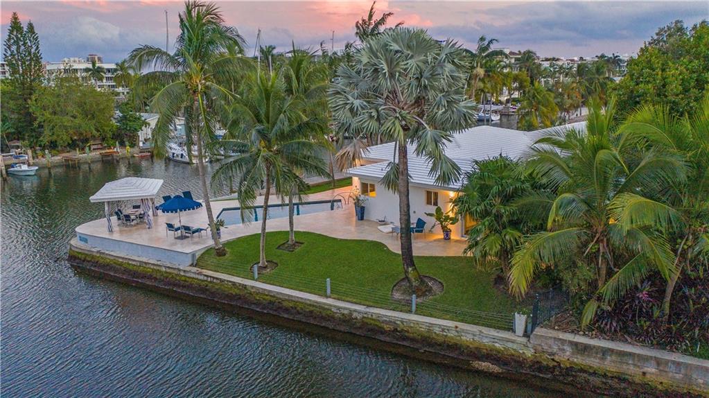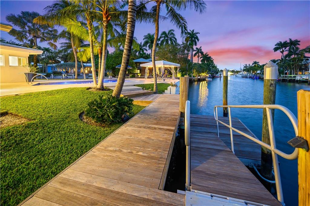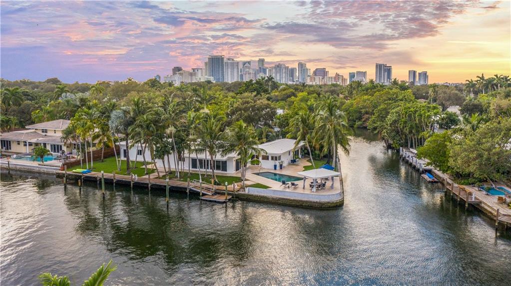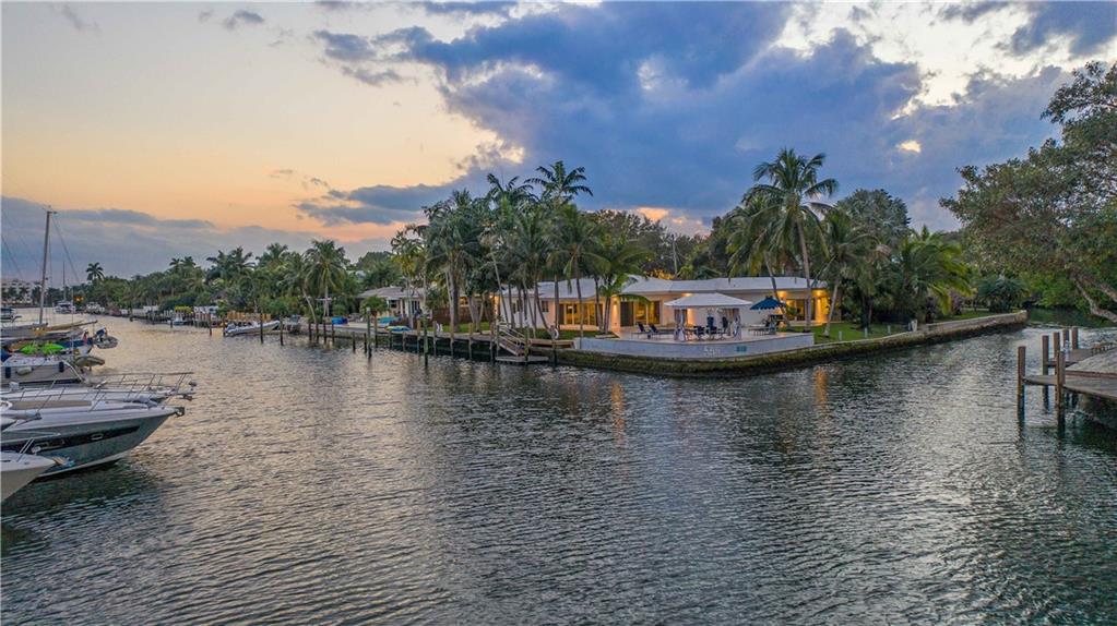 Park-like North Gordon's premier point property encompasses over 16,000 square feet & no-fixed-bridge water front of over 240 feet with 162 feet along the wide, deep Karen Canal. A recent multi-level ipe dock also has a float platform. Sleek Mid-Century architecture is updated for the 21st Century including re-built roof, newer electrical and plumbing systems and all impact-rated windows and doors. The sunken living room has volume ceilings. Walls of sliding glass merge outdoor and indoor living featuring water views from all public areas. Travertine patios surround the re-done, heated pool and water facing gazebo. In front, a crescent drive leads to an oversized three car garage with additional storage and laundry room with a dog wash. Very walkable to parks and Las Olas dining.