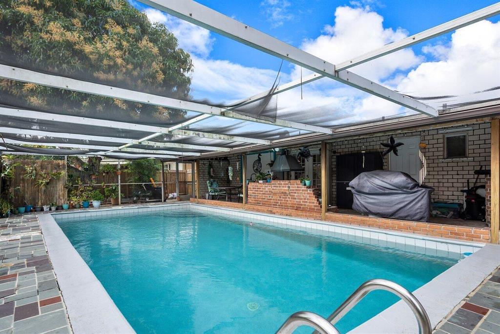 Rare three bedroom two bathroom home w/pool! Large Lot. This quiet residential street offers you the convenience of all shopping, restaurants, and major highways while still not feeling the hustle and bustle of town. Pool resurfaced 2018, Water heater 2020, Roof 2017, window shutters 2021. Shed in the backyard and endless potential