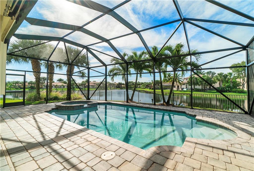 Beautiful 5 bedroom, 3 bath home on large pie shaped cul-de-sac lot in Heron Bay! Heated pool & spa w/ screened in patio w/ amazing lake views. This home has volume ceilings throughout main living areas plus upgraded fixtures, fans & window treatments. Gourmet kitchen w/stainless steel appliances and granite tops. Custom built out closets in Master Bedroom. Private lot w/ outdoor space that's perfect for entertaining & huge fenced lot to play on next to the pool! Other features include tile and laminate flooring throughout w/ no carpet, accordion shutters & freshly painted. Heron Cove includes lawn service. Gated community w/ 2 clubhouses, pools, tennis courts, kids splash areas, social activities & much more. Backyard facing west w/ beautiful sunsets over the lake.