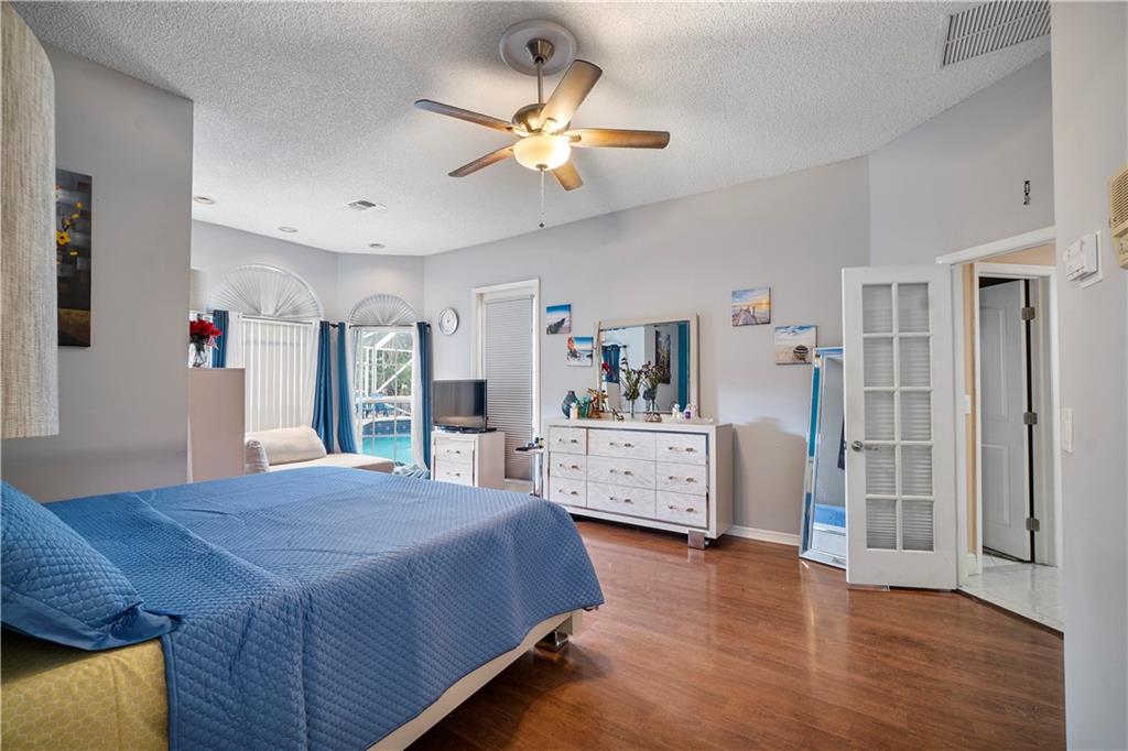 Open, architecturally interesting floor plan features volume and vaulted ceilings, double indoor/outdoor fireplace, French doors and 36" x 36" glass porcelain tile in living/dining rooms. Remodeled Master Bathroom. Remodeled kitchen with wood cabinets, tiled backsplash and stainless steel appliances including built-in wall oven and microwave. Large center cooktop island and big breakfast room open to family room. Spacious master suite with sitting room and two walk-in closets. Other features include custom built-in bar, ceiling fans, high hat lighting and skylight. Roof was replaced in 2007. Screened pool and raised spa, fully fenced. Large covered area, great for entertaining. Eagle Trace is a 24 hour guard gated community with tennis, playground, pickle ball, basketball