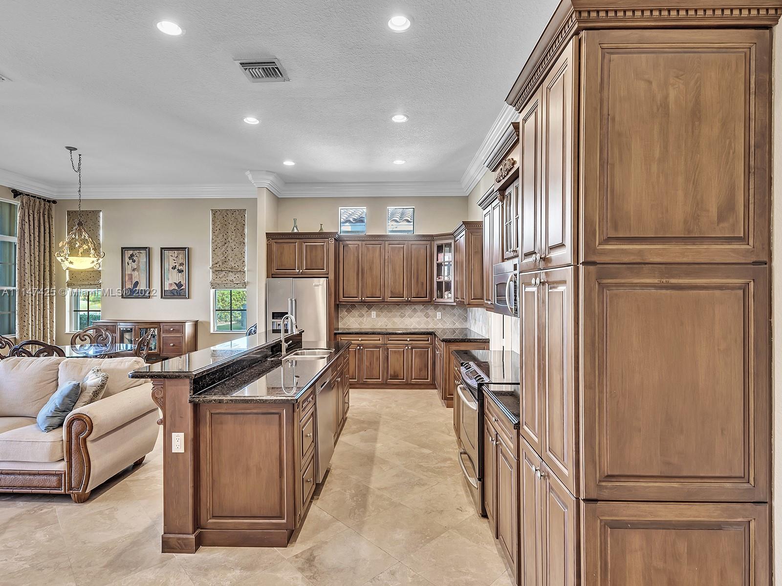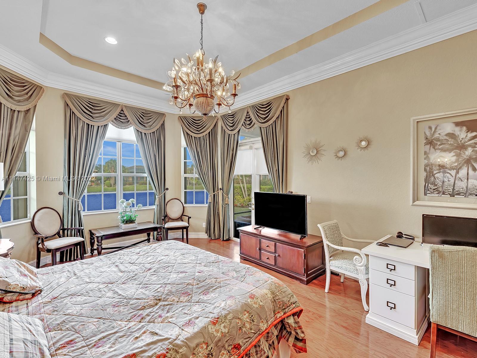 Stunning 3 bedroom 2.5 bathroom (plus large bonus room) one story home set on beautiful waterfront lot. Enjoy serene wide lake views while relaxing on the covered, screened and paver patio. The interior features chef's kitchen with wood cabinets, granite counter tops, stainless steel appliances overlooks the spacious great room with family and dining areas. Additional details include marble and wood flooring, triple crown molding, split bedroom plan and master bedroom with sitting area. Accordion shutters. AC 1 yr new. Guard gated community with 2 resort style clubhouses, 14 tennis courts, playground, basketball, 3 gyms plus many more amenities. Live the Florida Dream!