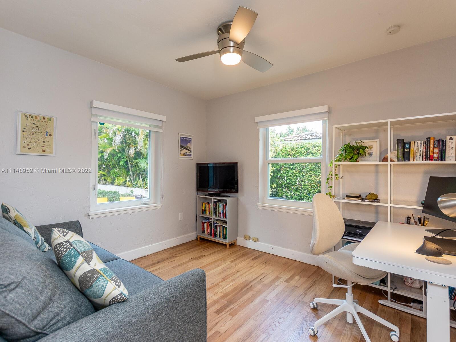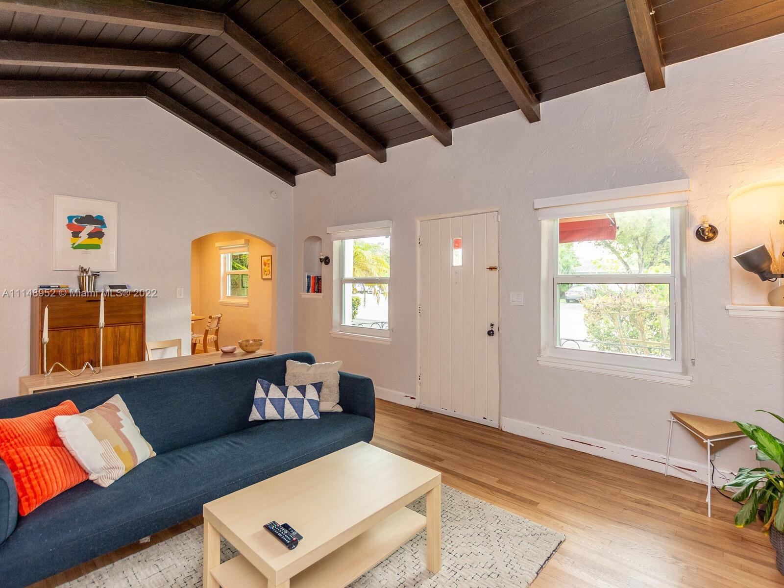 Welcome to Miami Shores! Welcome to this adorable 2bed/1bath jewel-box bungalow located just 2 blocks from downtown Miami Shores. This home is full of charming specific period details such as vaulted wood beam ceilings, fireplace, decorative wall niches, pristine original polished wood floors and a fully remodeled bathroom. Step out back to a sprawling yard with plenty of room for entertaining and expansion in addition to fruit tress. Additional features: bright eat-in kitchen, impact windows, new roof (2019), newer A/C, newer tankless water heater, updated electric, new gutters, and more! Detached 1 car garage with automatic door. Hurry up! This is your chance to be in the Shores under $600k! PROFESSIONAL PICTURES COMING SOON! OPEN HOUSE SATURDAY JANUARY 29TH FROM 11:00 AM TO 2:00 PM