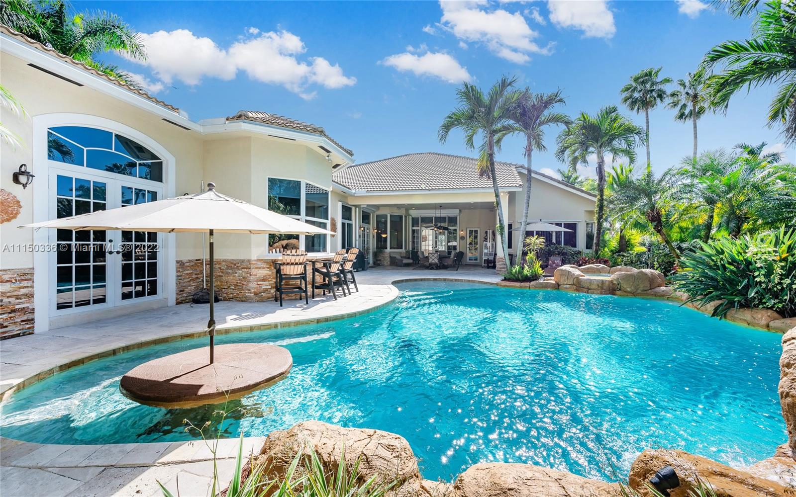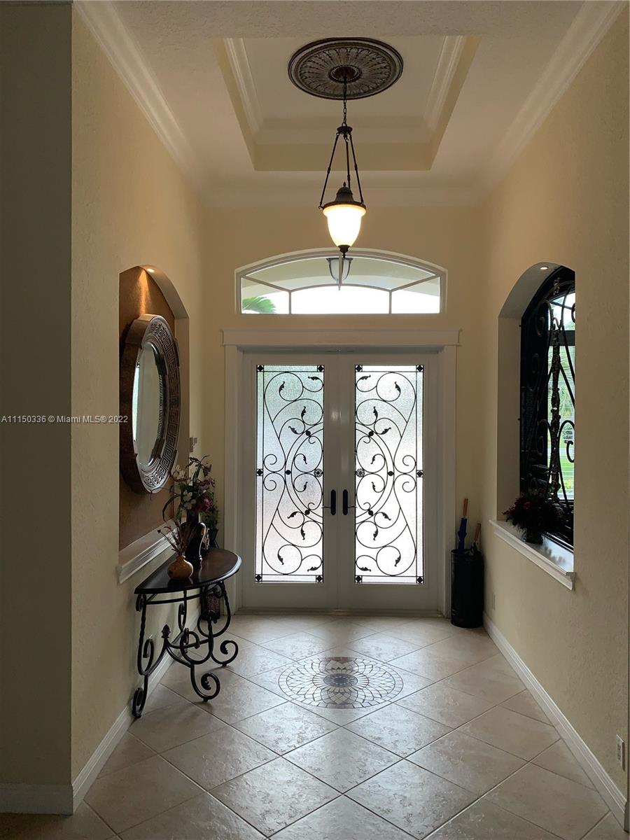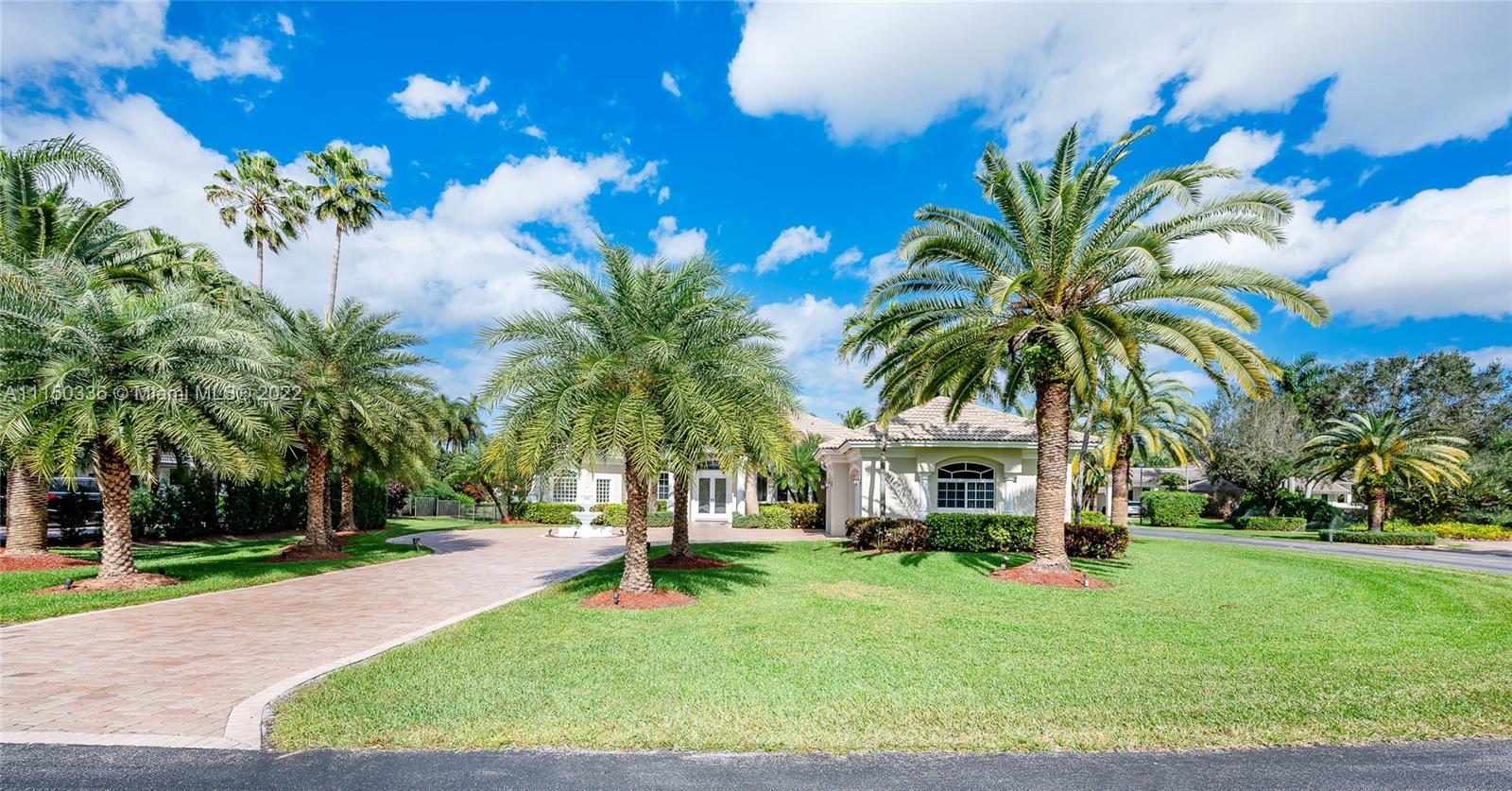 Magnificent Mediterranean style custom home built on a builders acre fenced in corner lot on a lake. Large gym area fully equipped with Nautilus equipment. This area can also easily be converted to two bedrooms with a Jack-and-Jill bathroom. Amazing views from every window. Located in an exclusive gated community of only 27 homes in Davie called Crystal Groves Estates. Spectacular Polynesian Resort backyard with salt water grotto pool, waterfall features, raised spa, pass thru poolside bar, and covered patio with European Tumbled Marble. Lush landscaping and built in fire pit. Impact windows, electric Rolladen aluminum shutters and accordion shutters. Full Genarac 22k air cooled stand by home generator with WiFi connectivity.