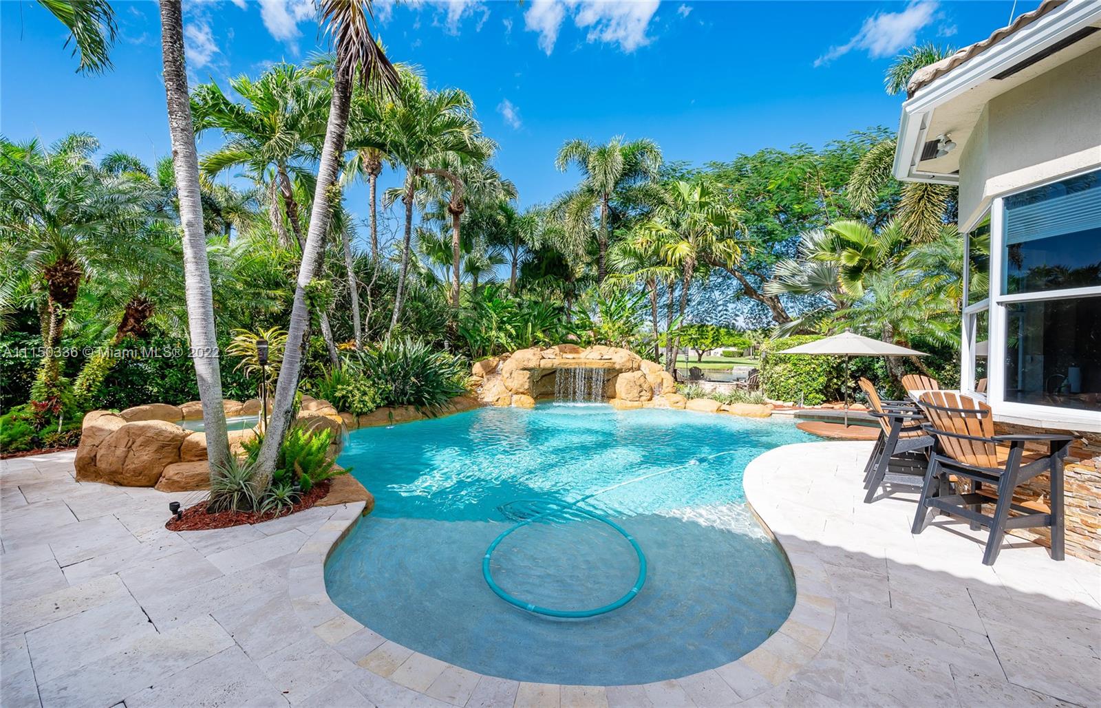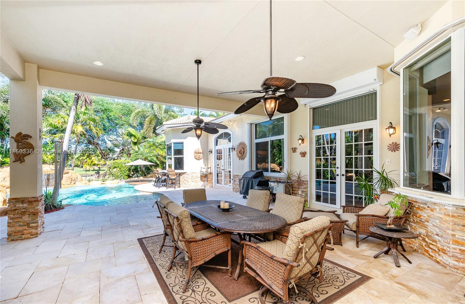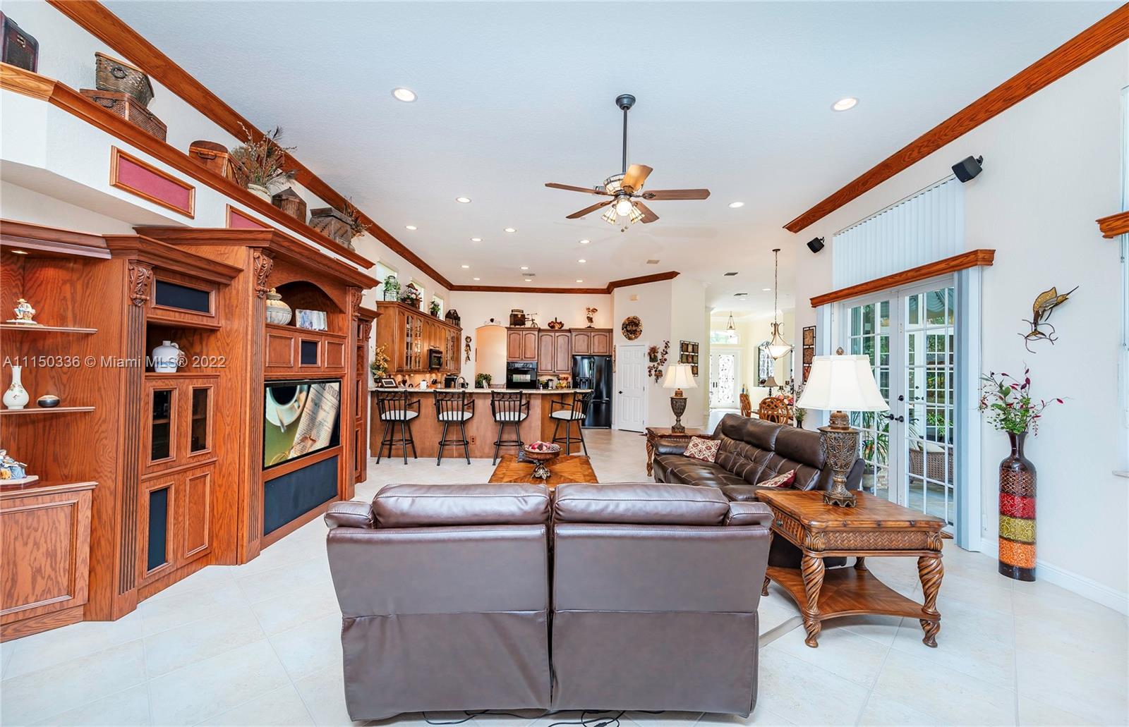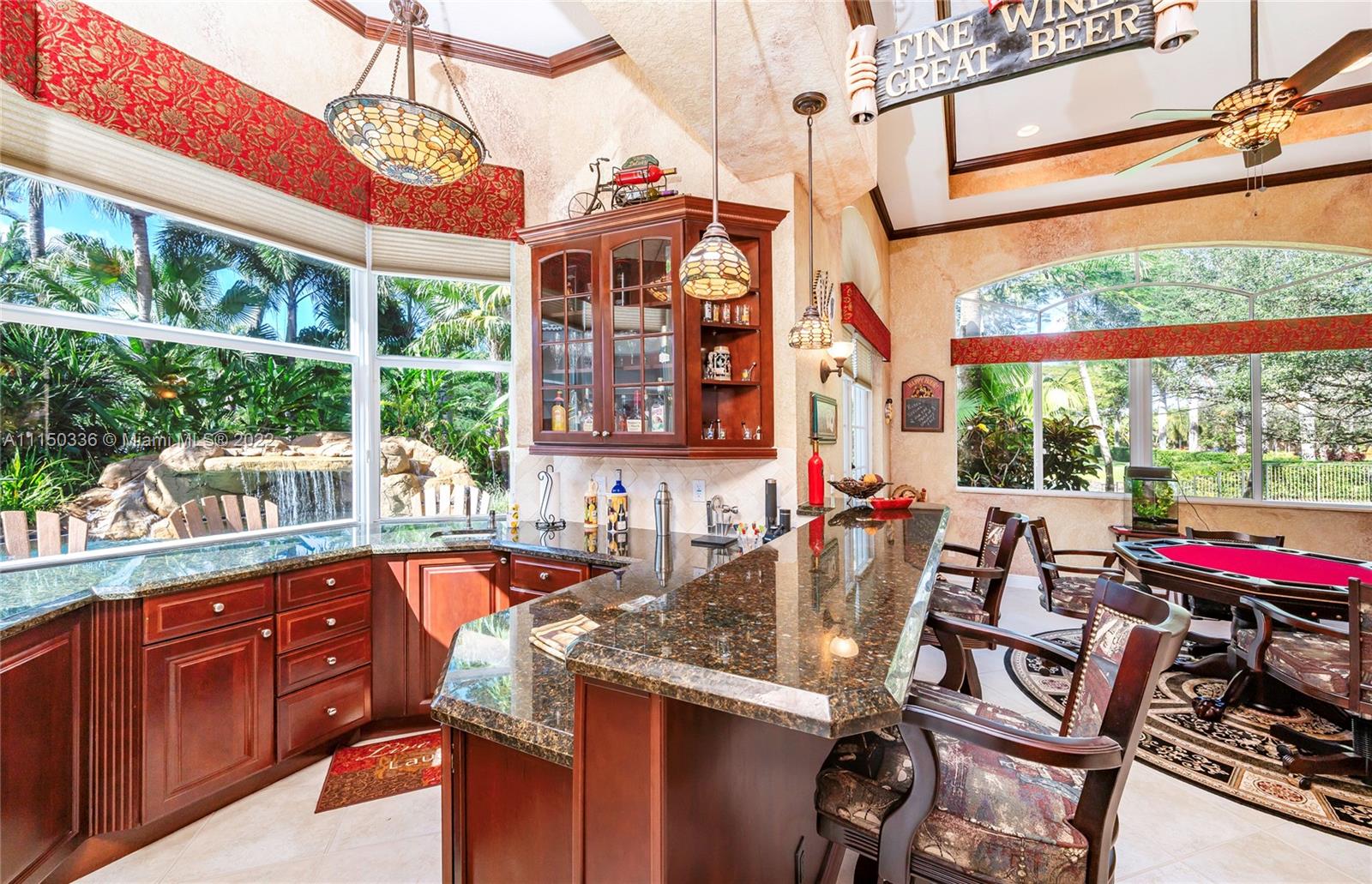 Magnificent Mediterranean style custom home built on a builders acre fenced in corner lot on a lake. Large gym area fully equipped with Nautilus equipment. This area can also easily be converted to two bedrooms with a Jack-and-Jill bathroom. Amazing views from every window. Located in an exclusive gated community of only 27 homes in Davie called Crystal Groves Estates. Spectacular Polynesian Resort backyard with salt water grotto pool, waterfall features, raised spa, pass thru poolside bar, and covered patio with European Tumbled Marble. Lush landscaping and built in fire pit. Impact windows, electric Rolladen aluminum shutters and accordion shutters. Full Genarac 22k air cooled stand by home generator with WiFi connectivity.