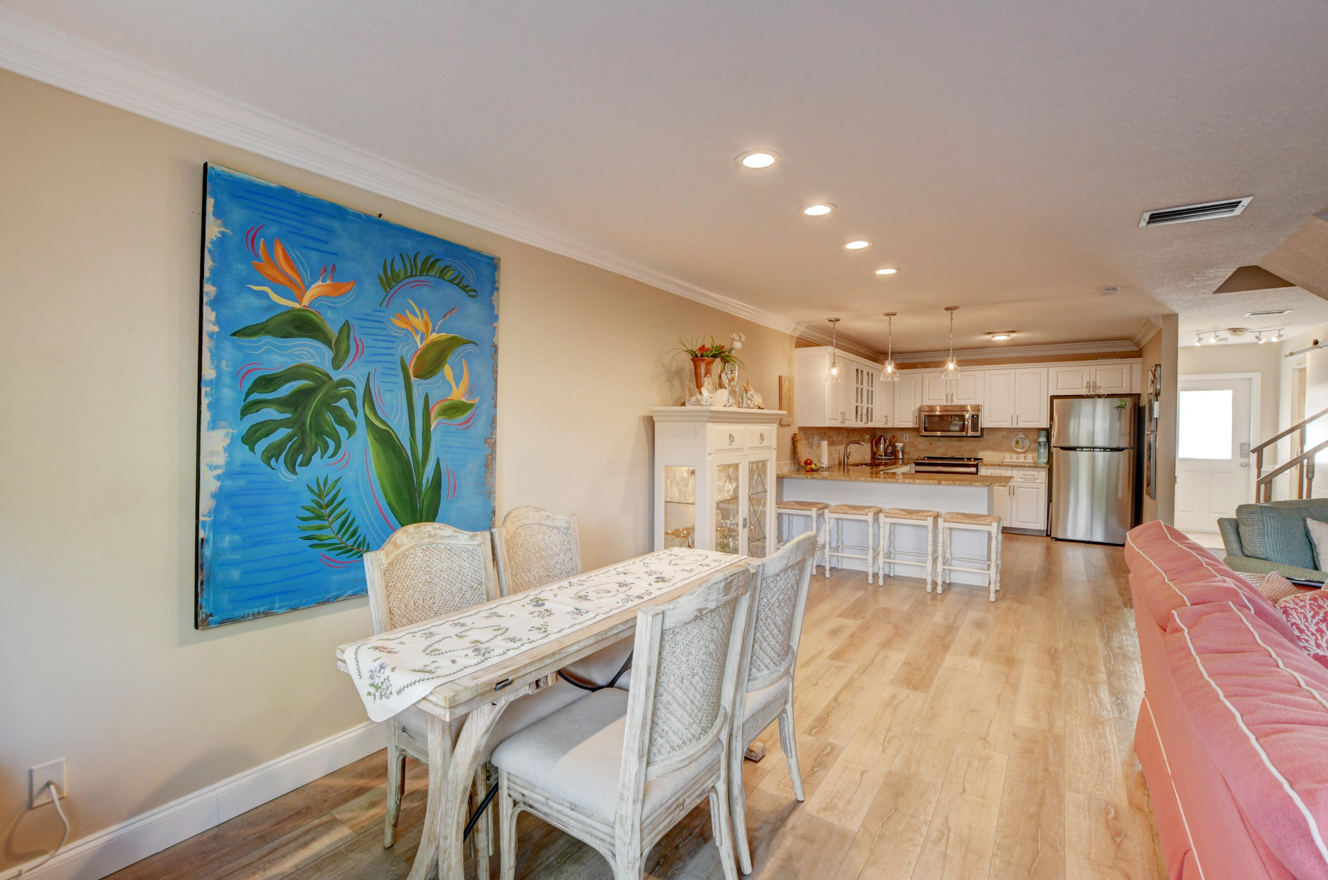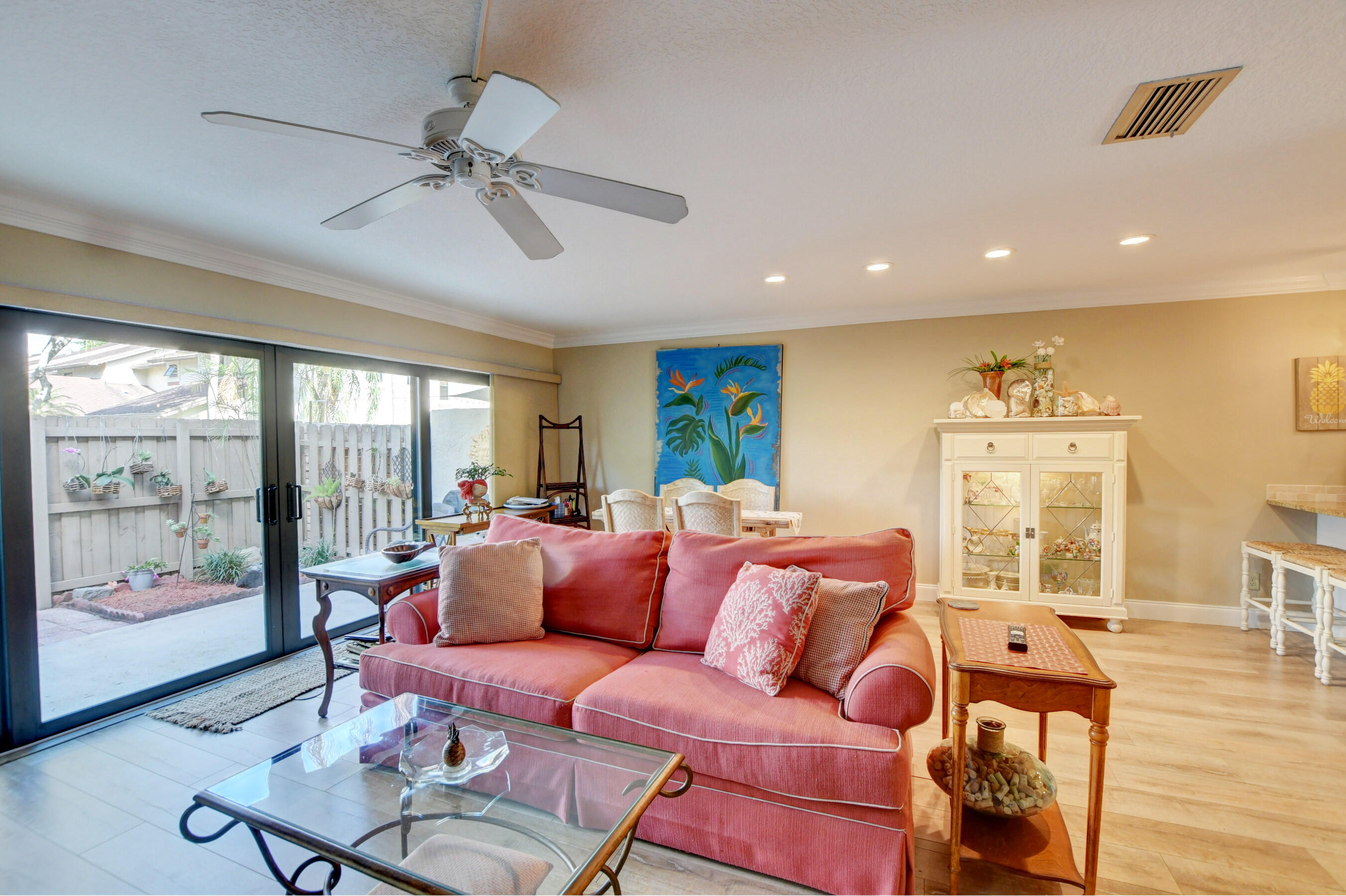 Light, bright and impeccable 3 bedroom 2.5 bath townhome located in the highly desirable section of The Village of Boca Barwood in Boca Raton. Overlooking the living and dining room the spacious & open updated kitchen has stainless steel appliances, granite countertops with seating, pendent lighting, and a beautiful stone backsplash. First floor features your large family room with beautiful garden views, dining room, recessed lighting, wood flooring, crown molding, new blinds, half bathroom and under stair storage area. The three large bedroom and two bathrooms are located upstairs Enjoy peace and security with the newly installed impact windows, front door, and air condition system. Relax to peaceful sounds and views form the oversized fenced patio that is perfect for entertaining and