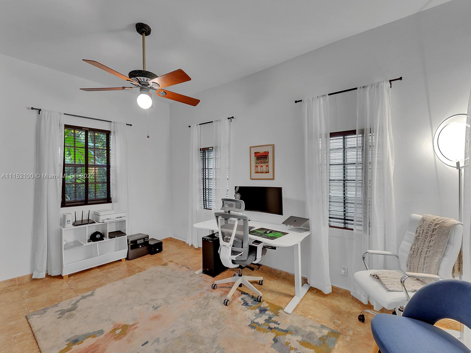 Enjoy this perfectly maintained Old Spanish in North Gables , exuding grace & comfort. Upon entering , walk into a sunroom, with walls of windows . This large lite & brite home has two bedrooms / One Bath home with a separate den/office and features a wood burning fireplace, hardwood floors, high ceilings, tankless water heater, closet built ins & a charming brick garden with a generous back yard . All windows are either impact or have shutters. Short drive to Downtown Coral Gables, Venetian Pool , Biltmore Hotel , Restaurants and shopping as well as the airport .