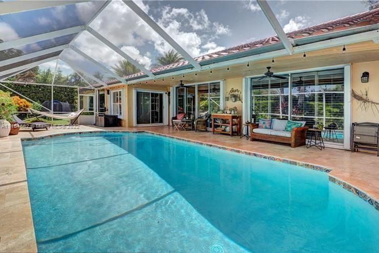 Fully remodeled spacious home with lots of upgrades and built-in's, situated in a highly sought after neighborhood. Recessed lighting, high ceilings, ceramic/wood flooring, ceiling fans, spacious and upgraded bathrooms and open concept recently remodeled kitchen with lots of cabinet space, cooking island and stainless steel appliances, wine cooler, brand new roof (fully replaced in 2020), sparkling covered pool with brand new salt water system and heater, new outdoor travertine flooring. Low monthly HOA includes: basic cable, internet, community pool, tennis courts, basket ball courts. Nearby elementary school ranked - A (the elementary school is one of the main attracts for families in the neighborhood). This beautiful house is a MUST SEE!
